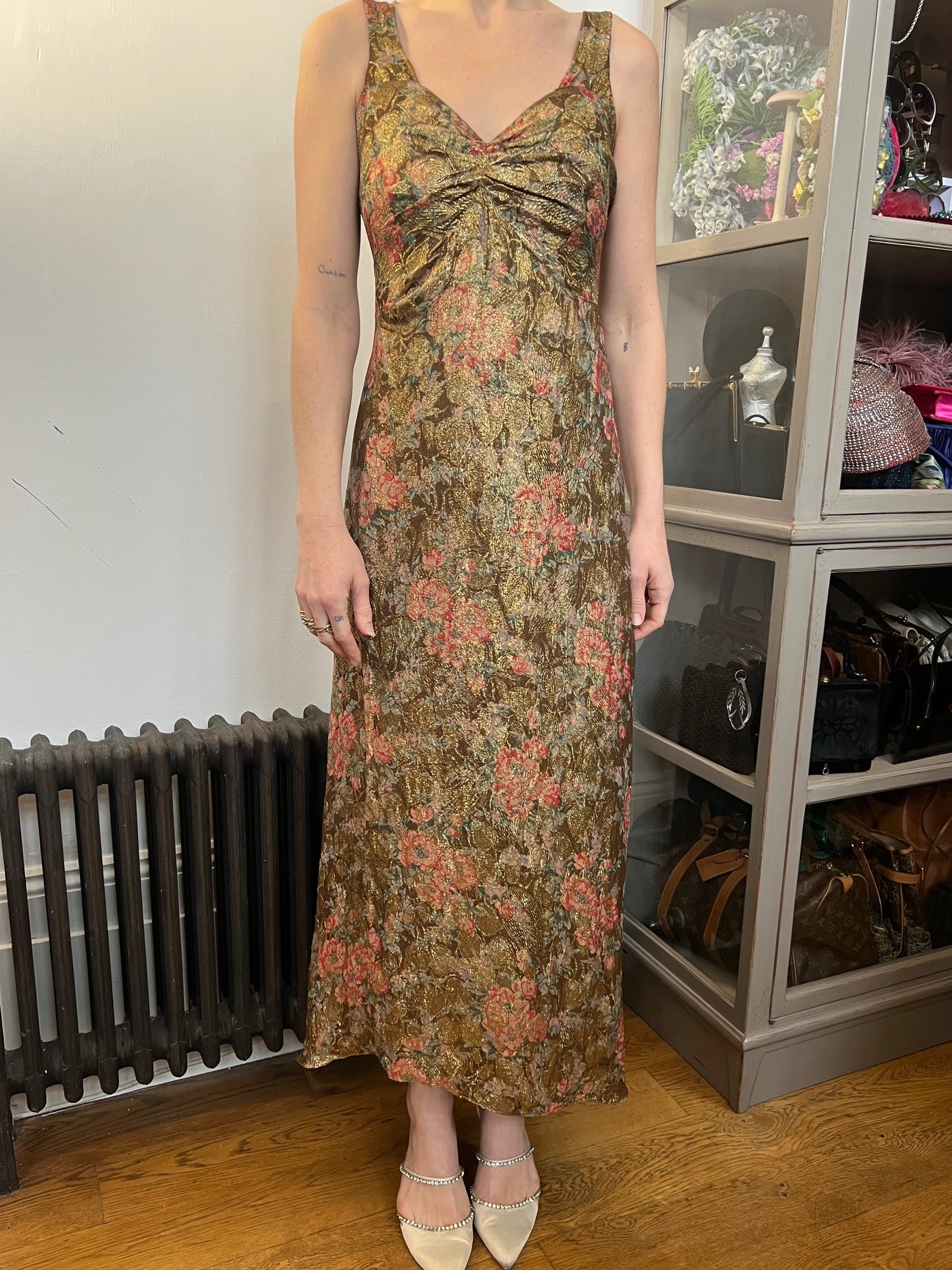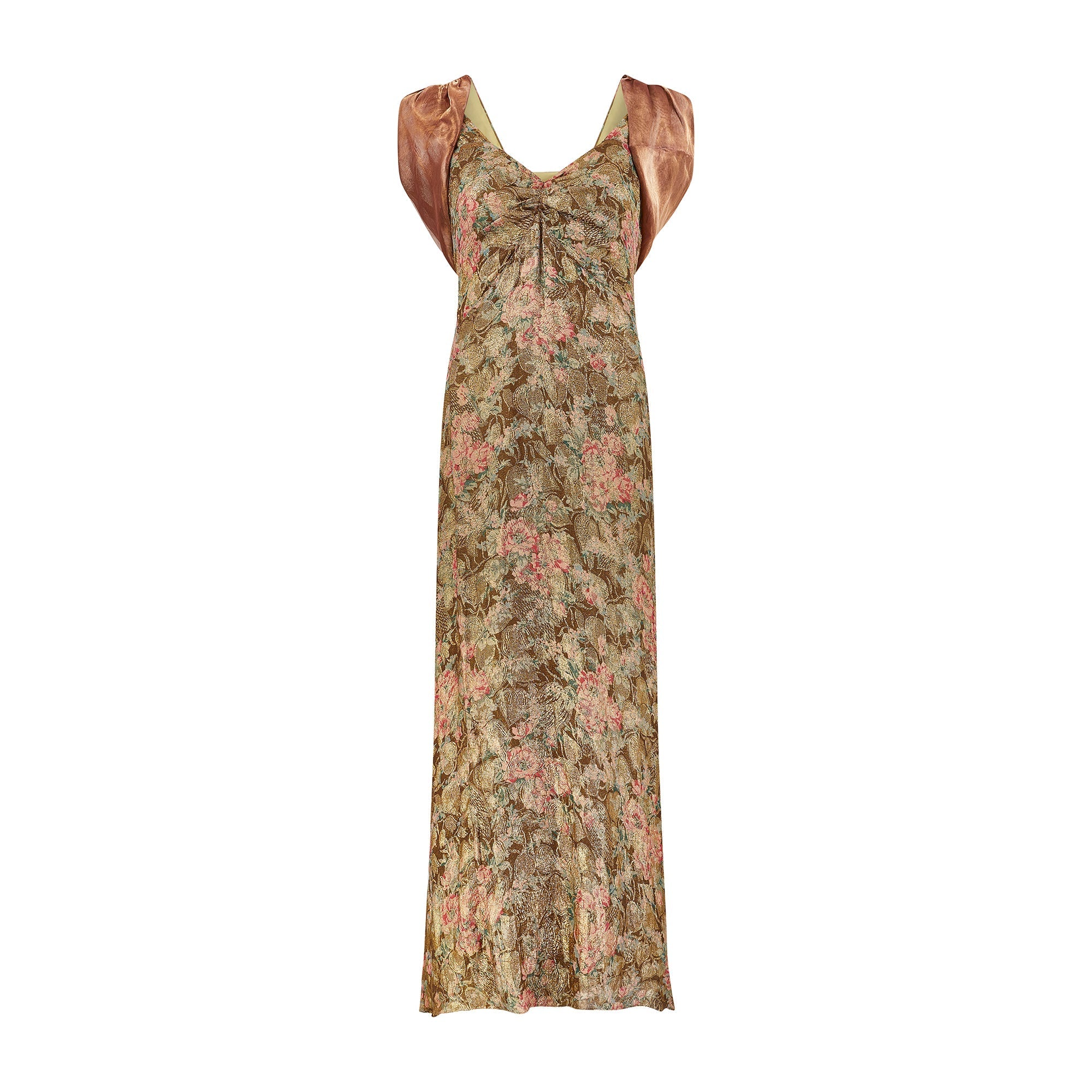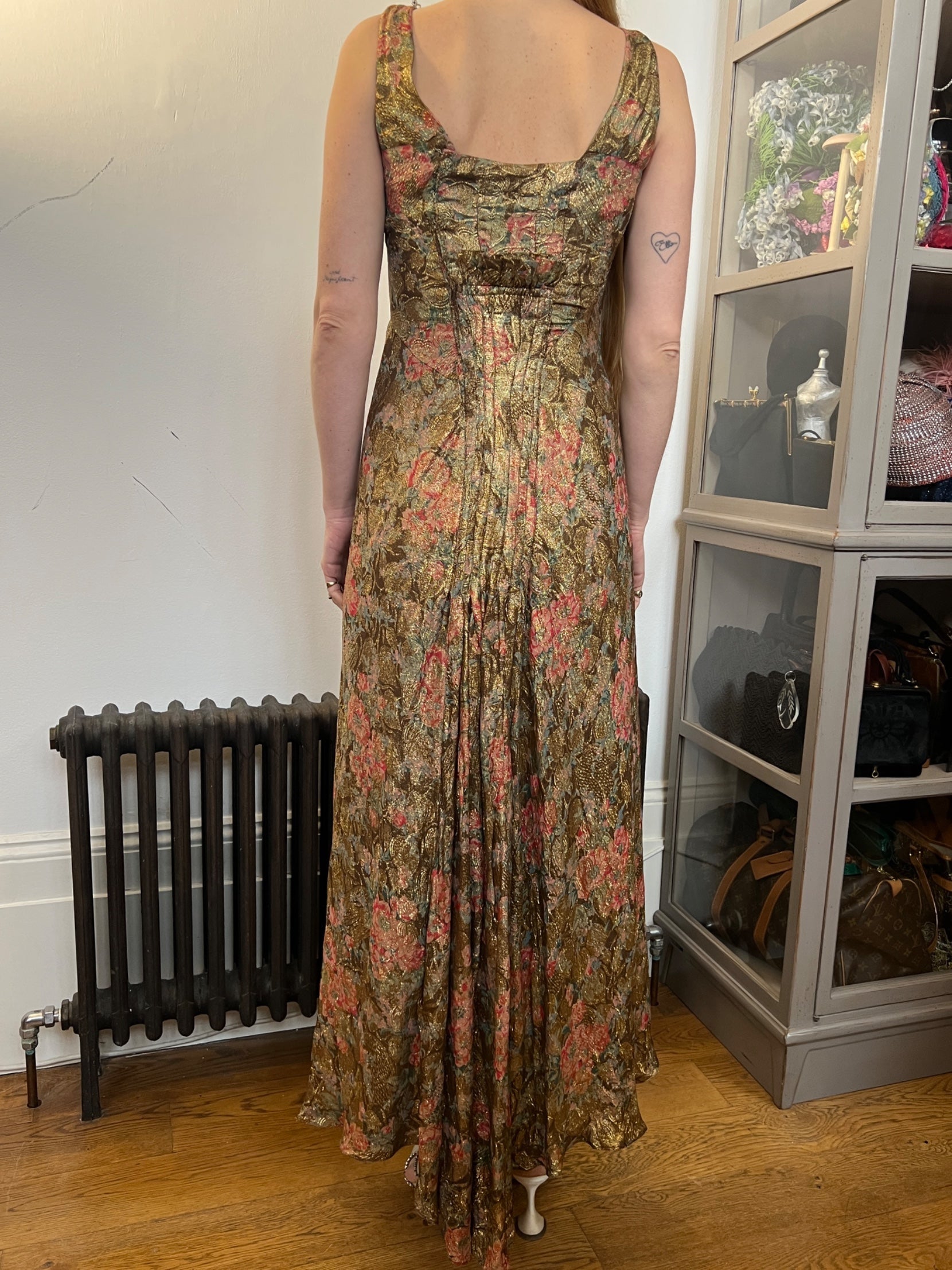 1930s gold and floral lame dress with contemporary custom-made capelet. Of an ankle skimming length, this piece is crafted from the most incredible fabric; a glittering golden lamé detailed with paler gold textured leaves that appear to spin towards the ground as they catch the light. Among the shimmering leaves, fuchsia and pale pink roses nestle amongst pale grey-blue floral sprays. The bust is gathered to form a sweetheart neckline that reveals the décolletage. The back of the dress has an off-kilter fastening which is secured with hook-and-eye clasps. There are stitched pleats across the back finished with a pretty ruffle. This gathered cloth gives way to soft pleats which fall the length of the skirt, fanning out towards the end of the train. This means that the skirt flares out as the wearer walks, or dances. This gown is fully lined in matte chartreuse silk which was custom added for the client. It is accompanied by a modern bespoke capelet which was made especially for the dress, tailored from sheer bronze chiffon. It perfectly complements the metallic gown.