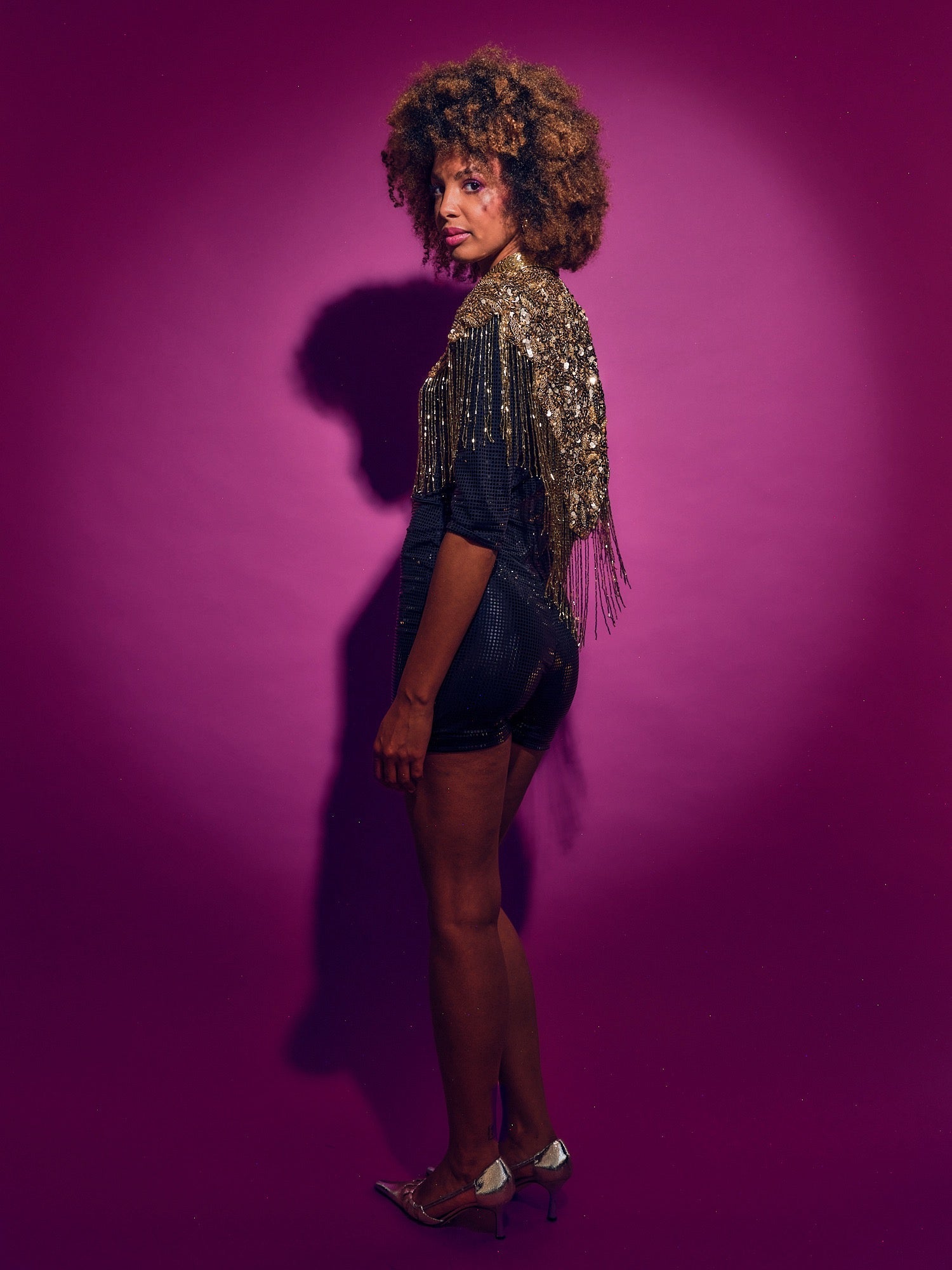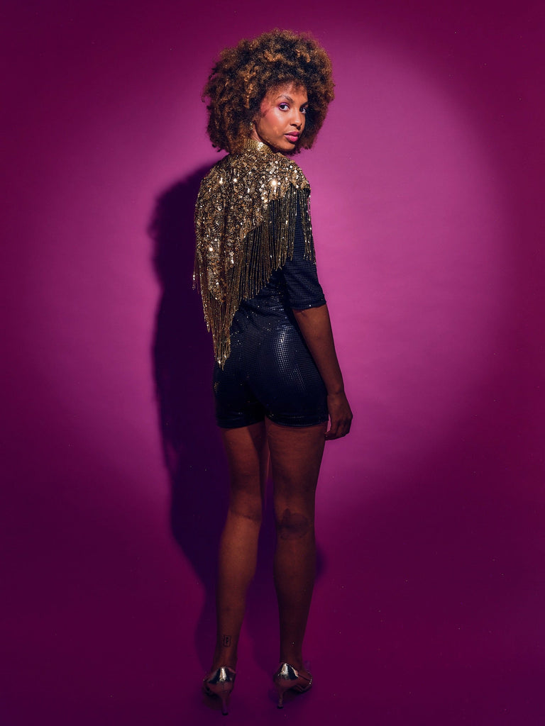 The Cleo Cape is a handmade, reversible accessory designed to add instant glamour to any outfit. Each sequin is carefully sewn with love, making it perfect for parties, weddings, festivals, or simply for fun.