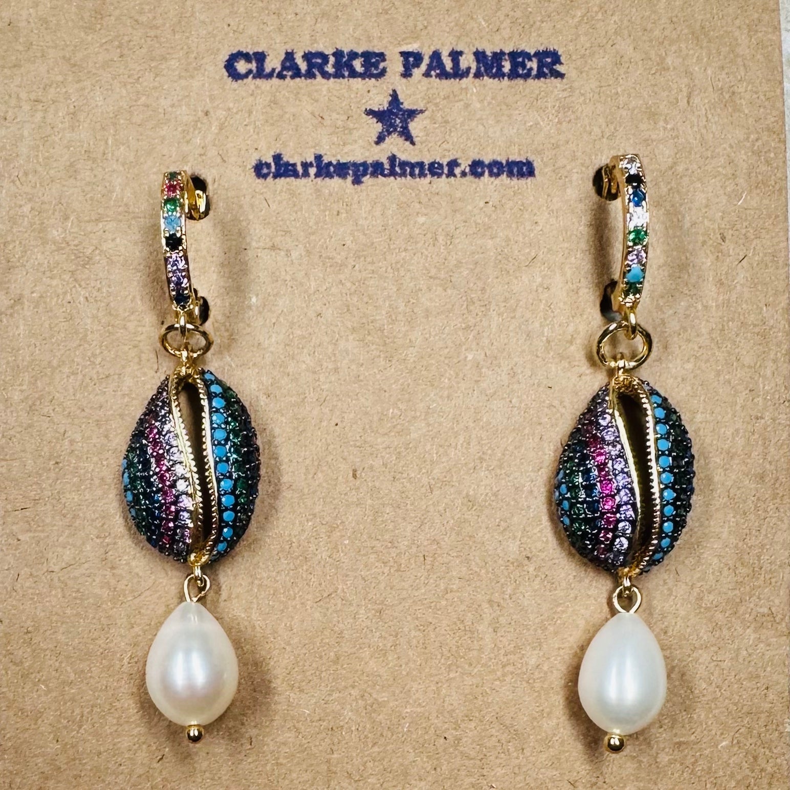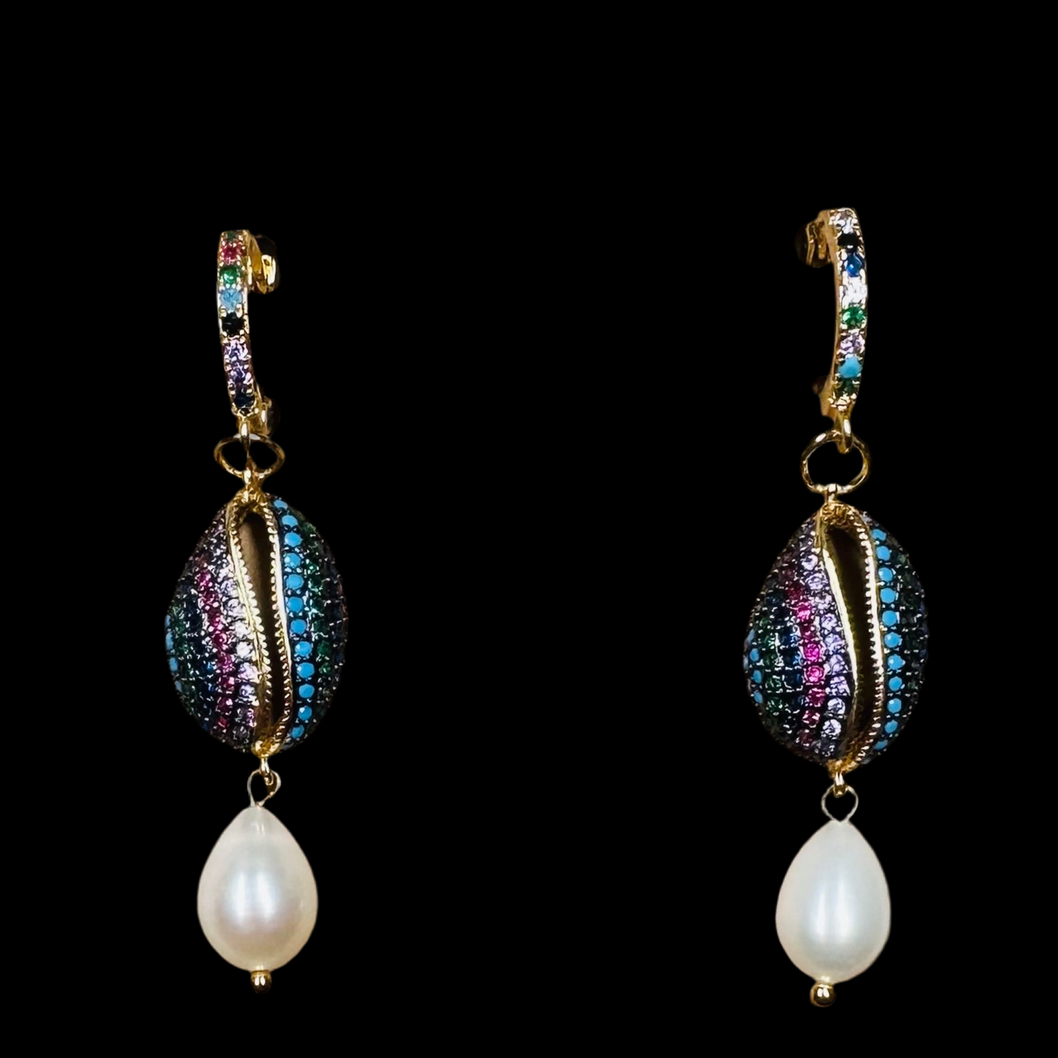 Rainbow CZ Cowrie Shell and Drop Pearl Earrings