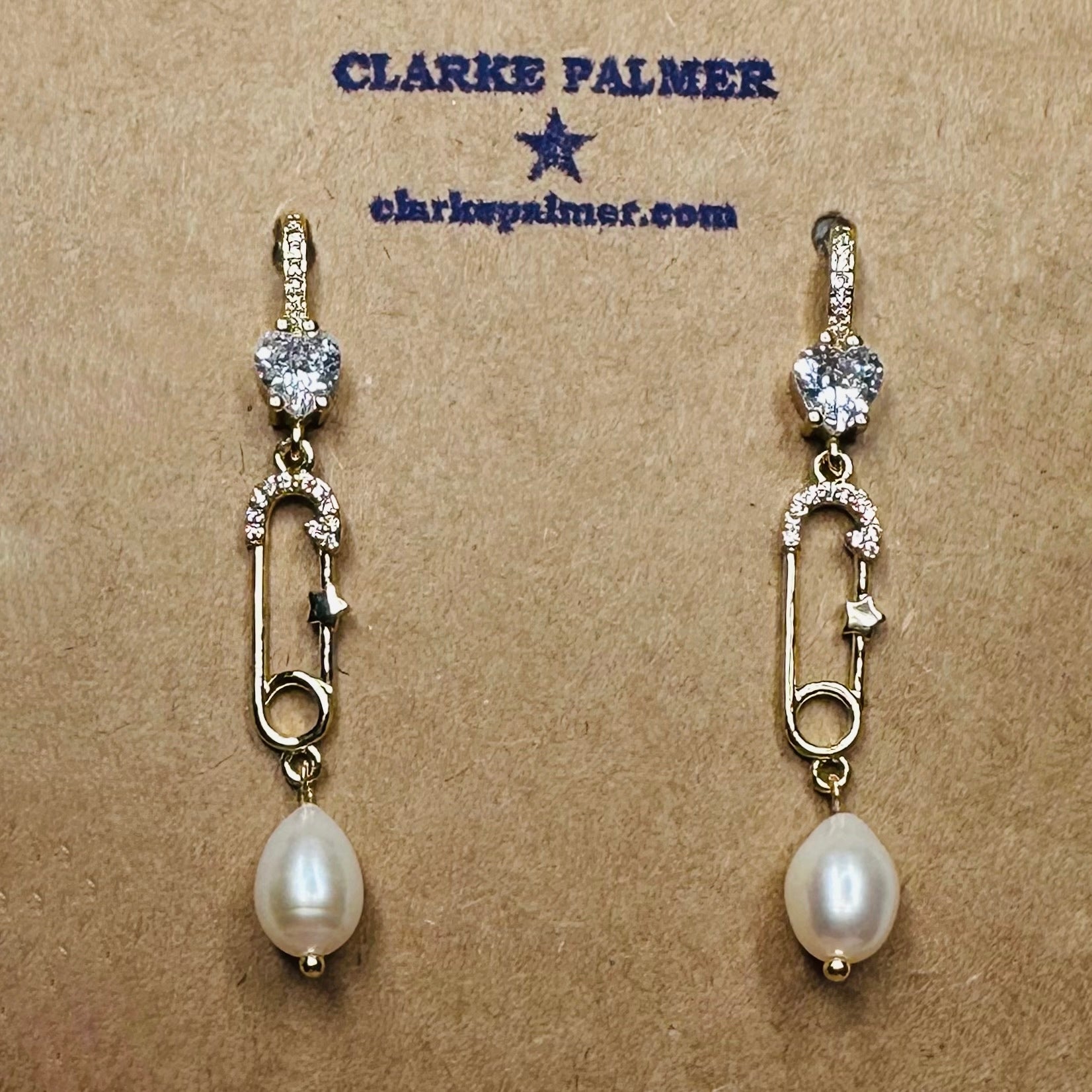 These gorgeous earrings are handmade from 24kt gold vermeil rainbow CZ safety pin and star charms with freshwater ivory teardrop pearls. They hang on 24 kt vermeil rainbow cz hinged hoops. They make a perfect gift to your dearest friends and loved ones or for yourself.