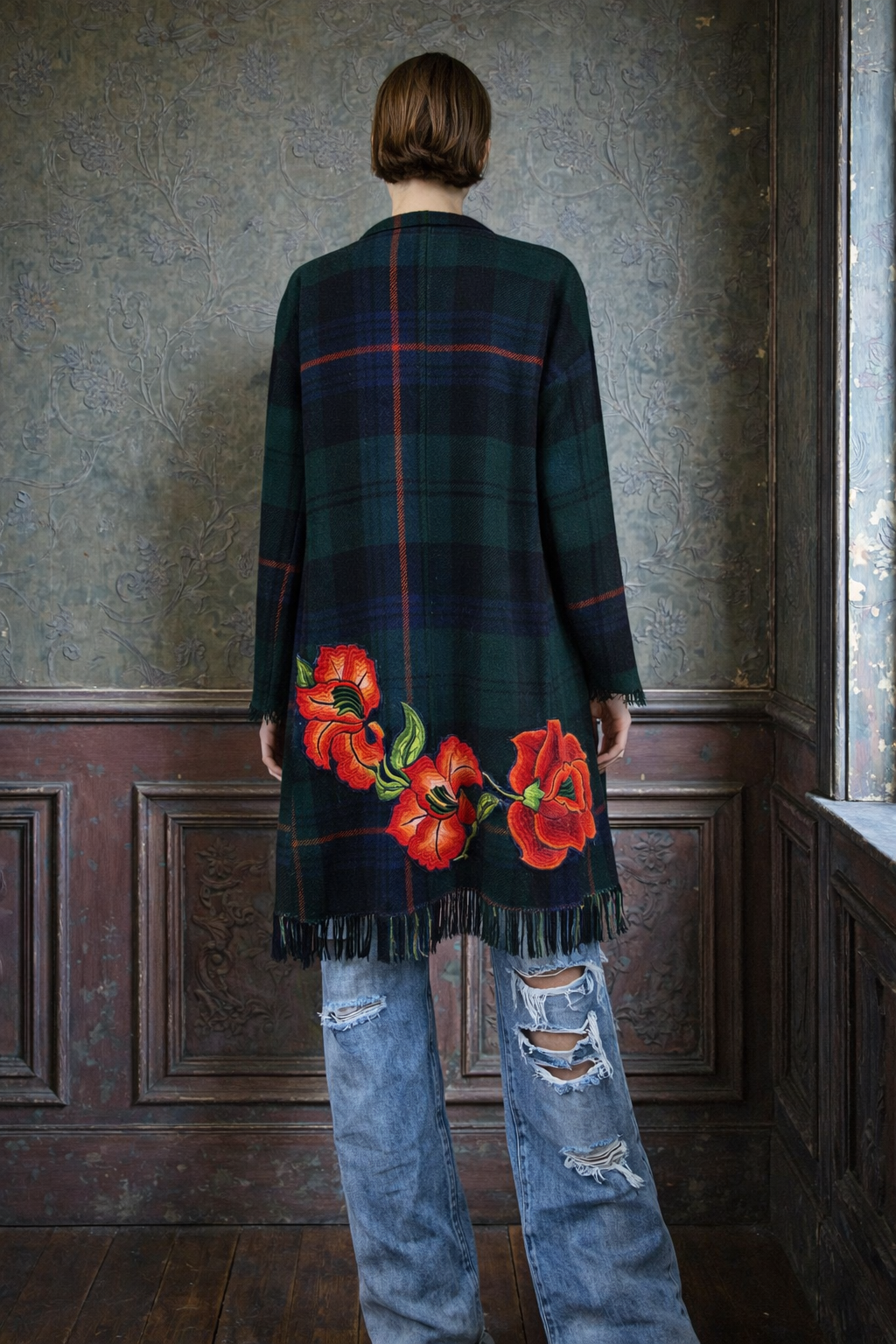 This unique 70sblanket coat features a checked fabric with long sleeves and a rounded neckline, designed for effortless layering. Its straight cut is complemented by subtle fringing at the hem, while silky side pockets add both comfort and practicality. Highlighted by intricate Victorian embroidery and large vibrant florals on the front and back, this piece blends vintage charm with timeless craftsmanship for a distinctive, expert-level addition to your wardrobe.