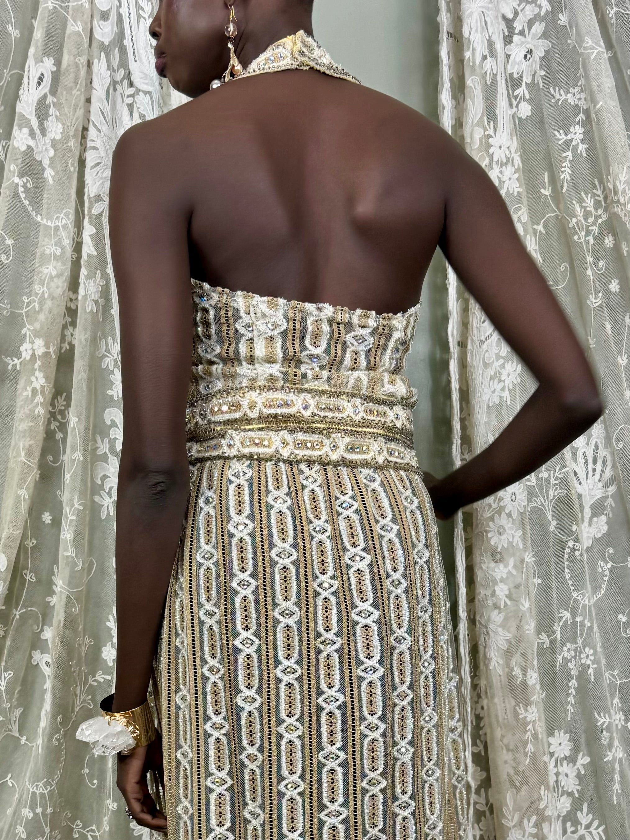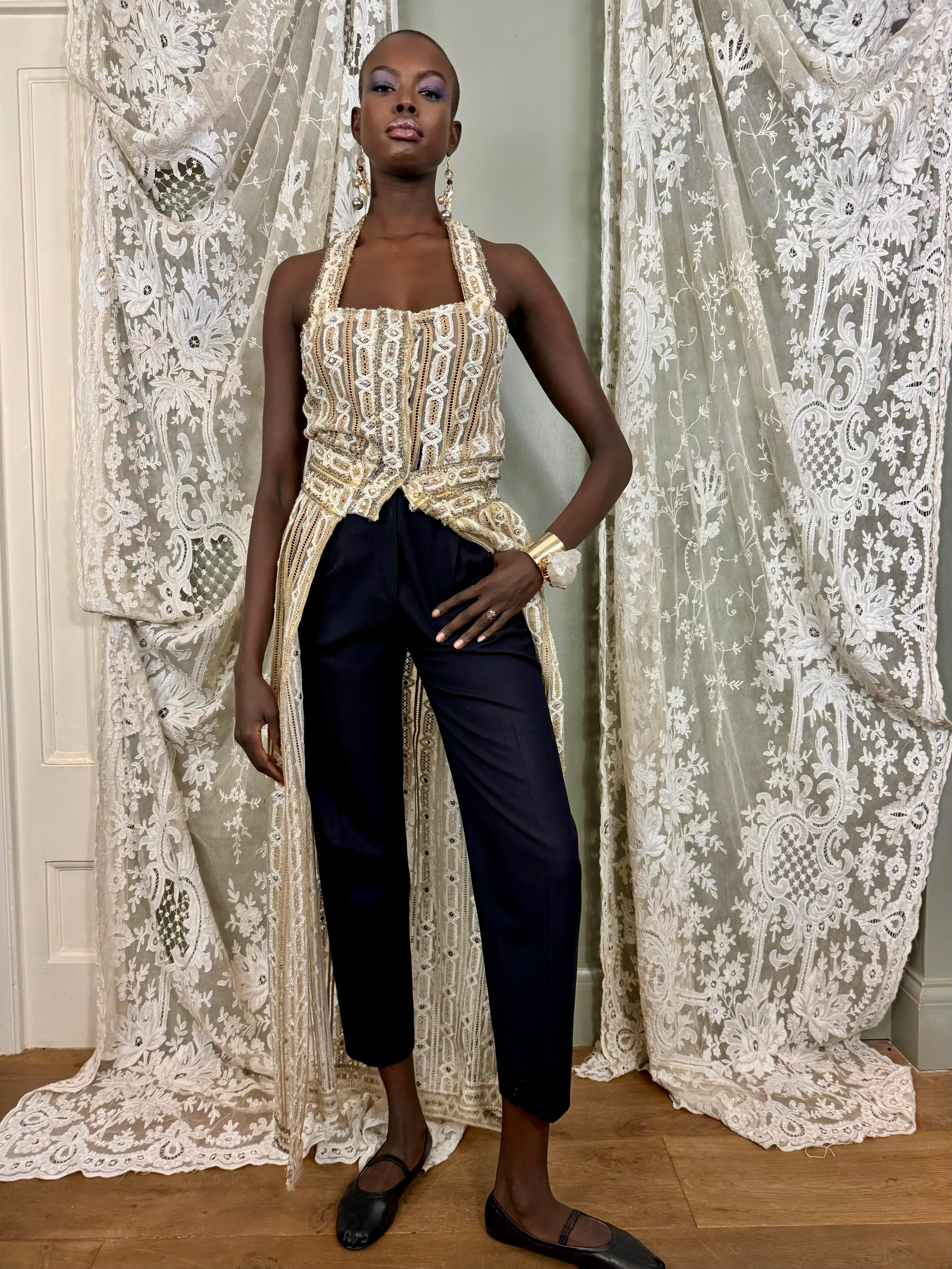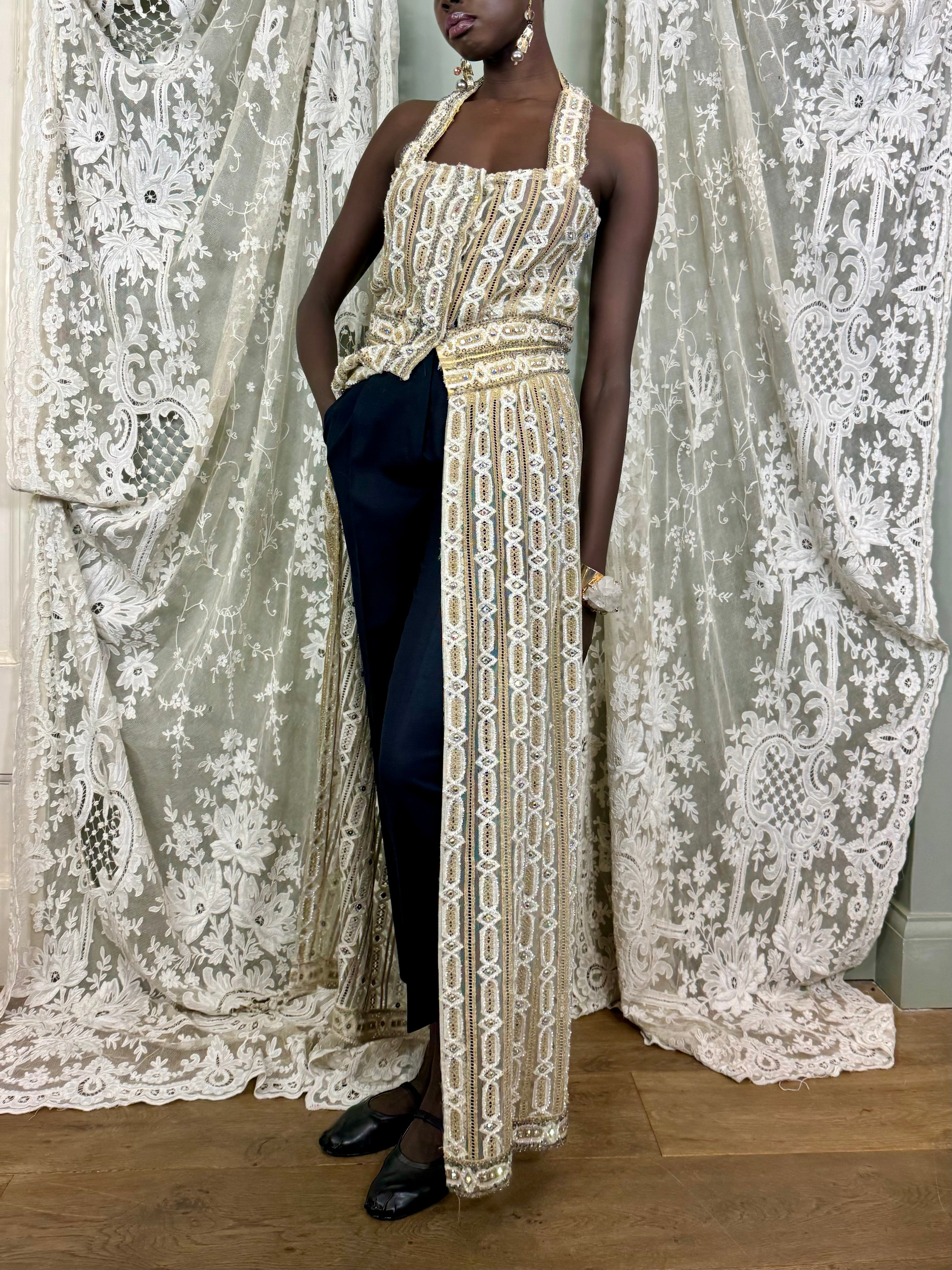 This 60s rhinestone lace coat is a unique and elegant addition to any wardrobe. Made with intricate silver thread and sparkling rhinestones, it features front buttons and an adjustable halterneck strap with a long tail. Add a touch of glamour and vintage charm to your outfit with this stunning coat.