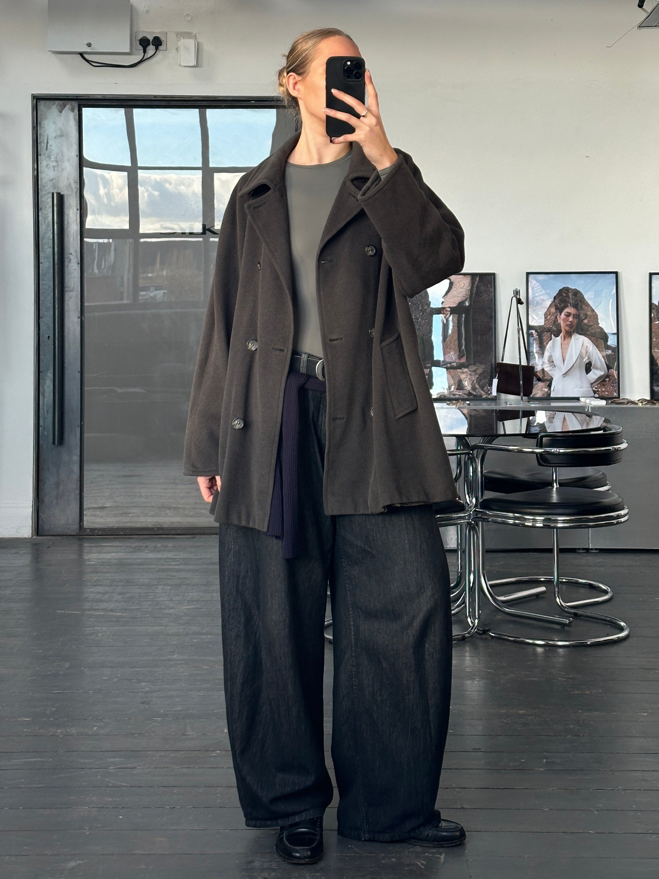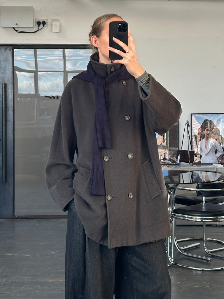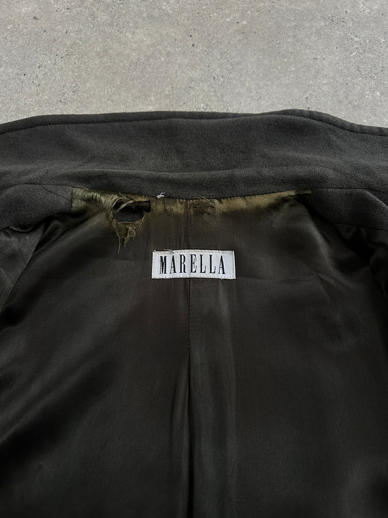 Vintage 1990s Marella green tone double breasted coat with a soft brushed finish, crafted in Italy from a warm wool, angora blend. The high-neck fastening and relaxed oversized cut give it a refined, understated feel.