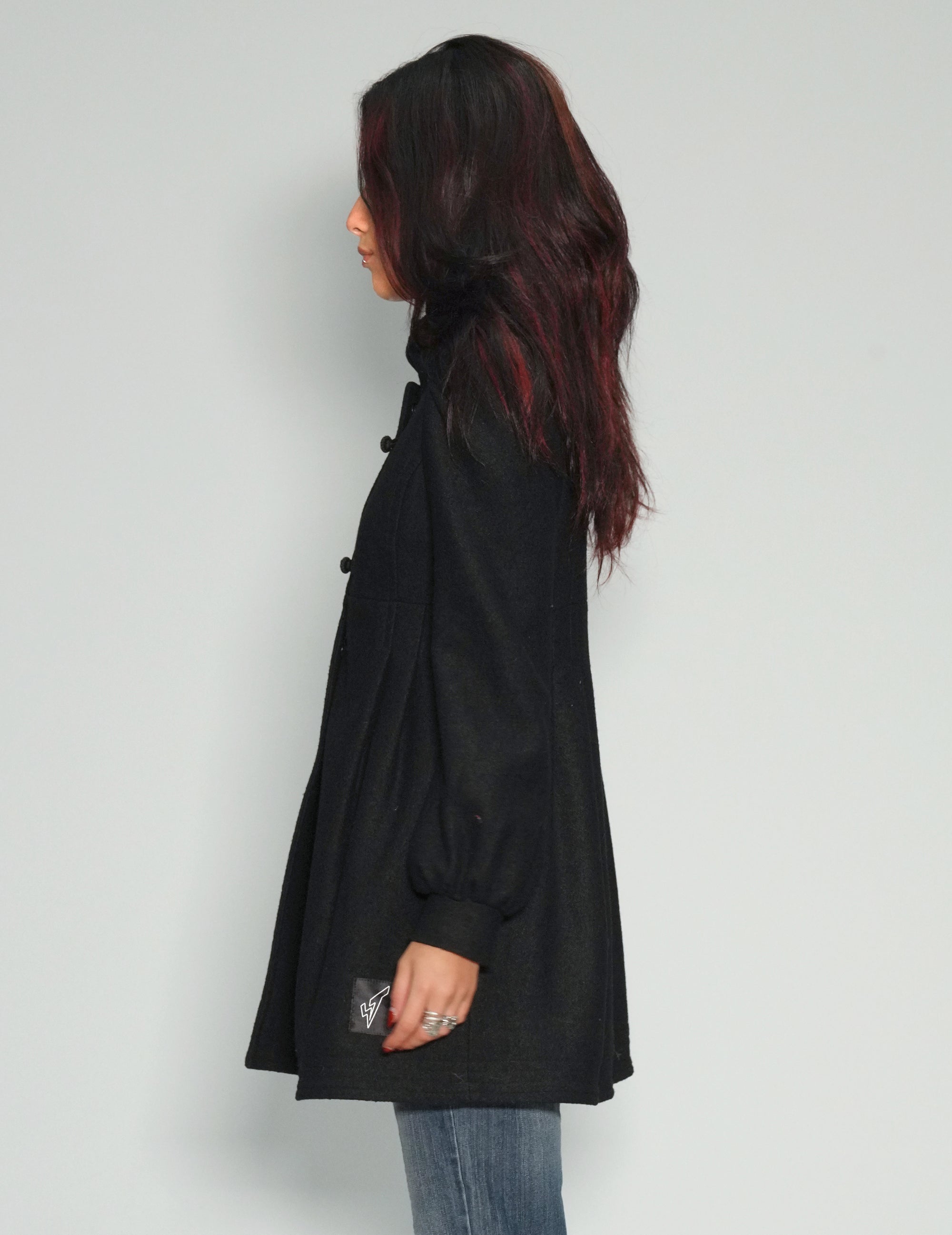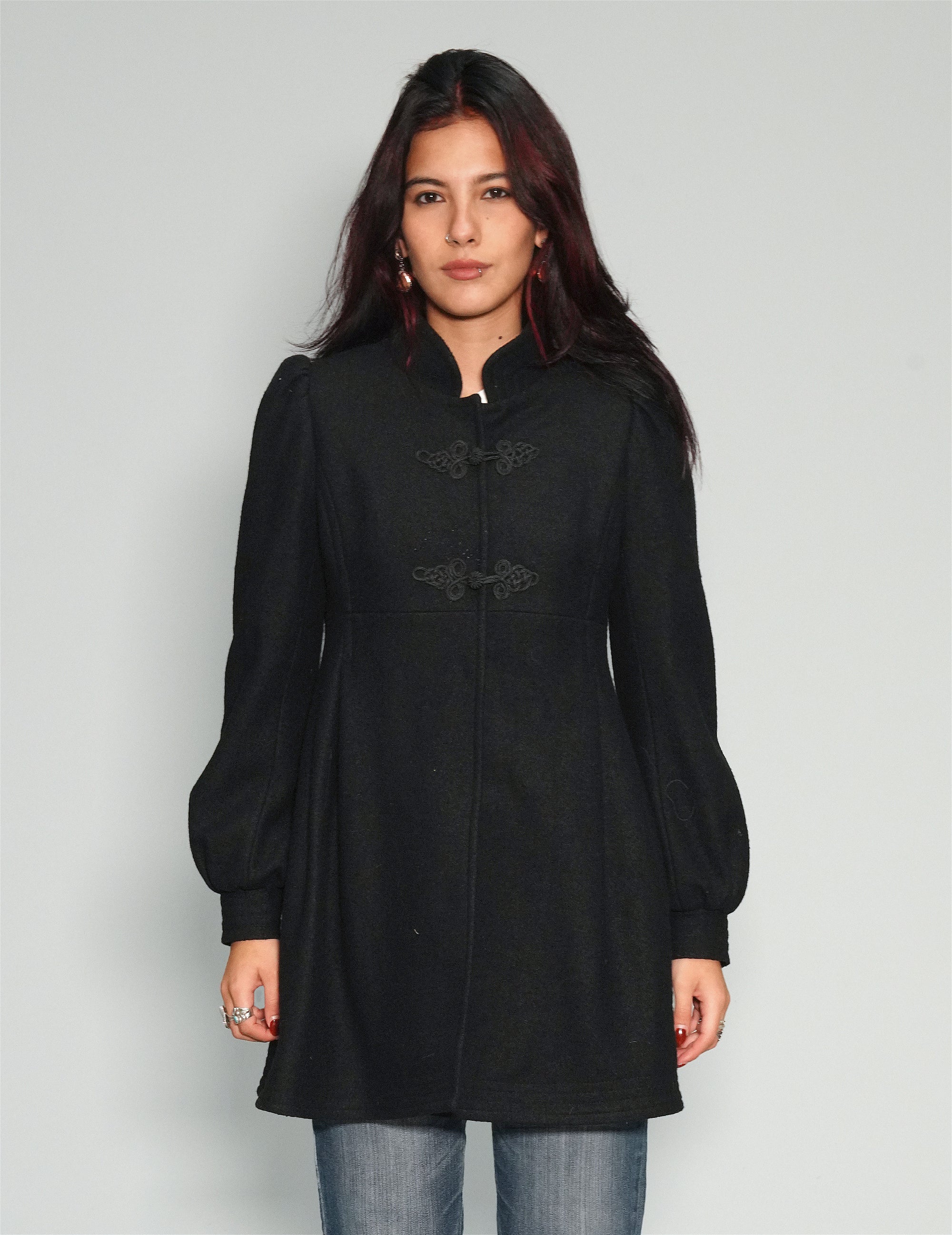 Vintage Military-style coat, 72% Poly 28% Wool. Features elaborate braiding on the front buttons, and inside pockets.