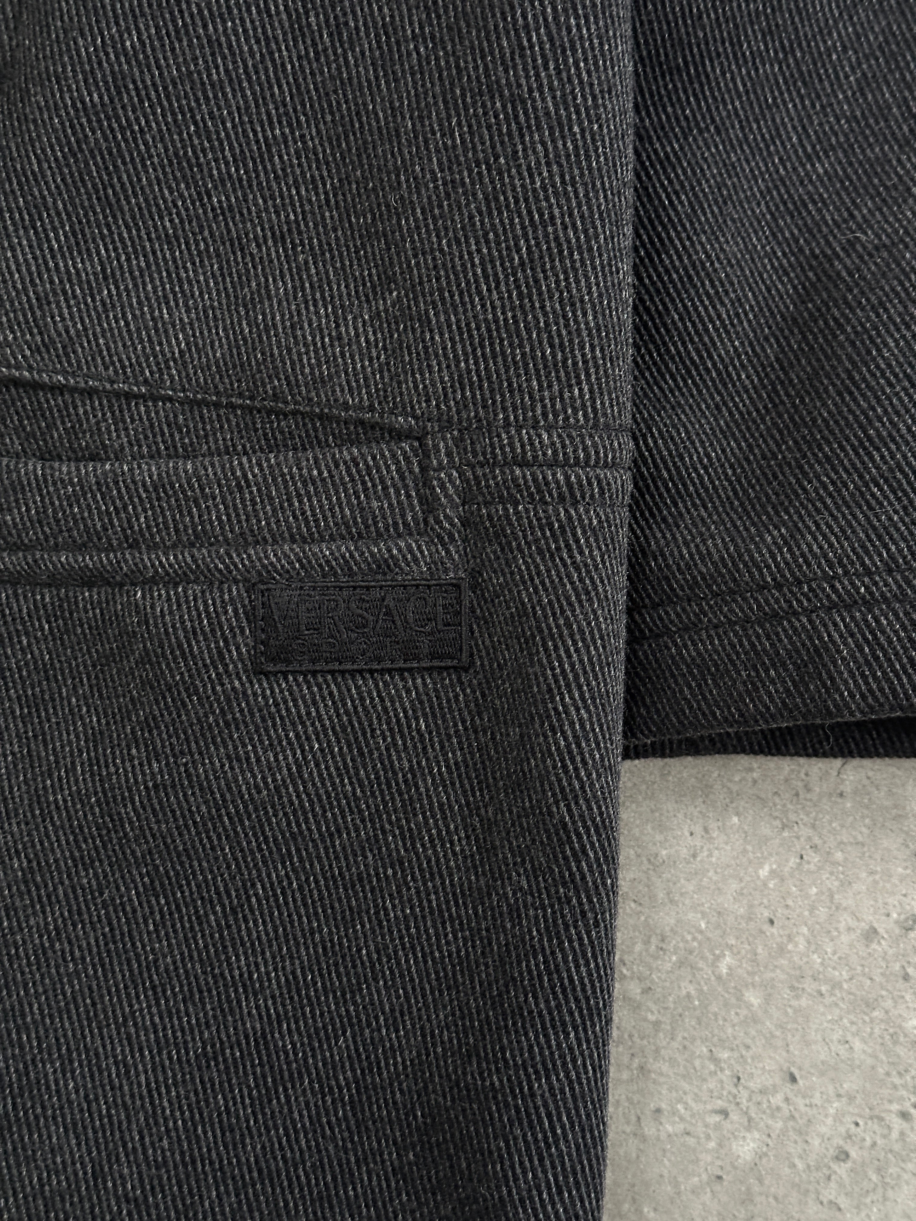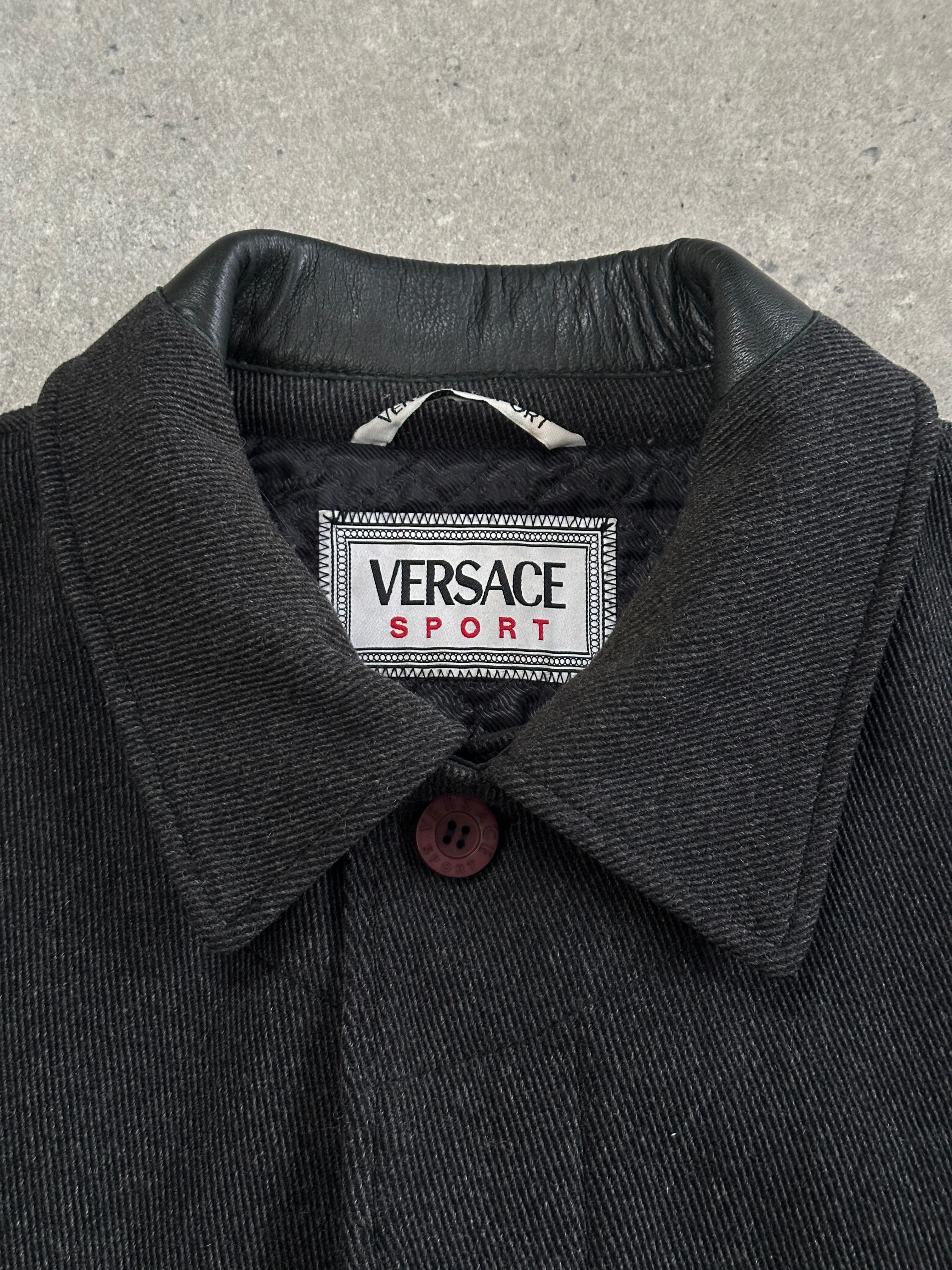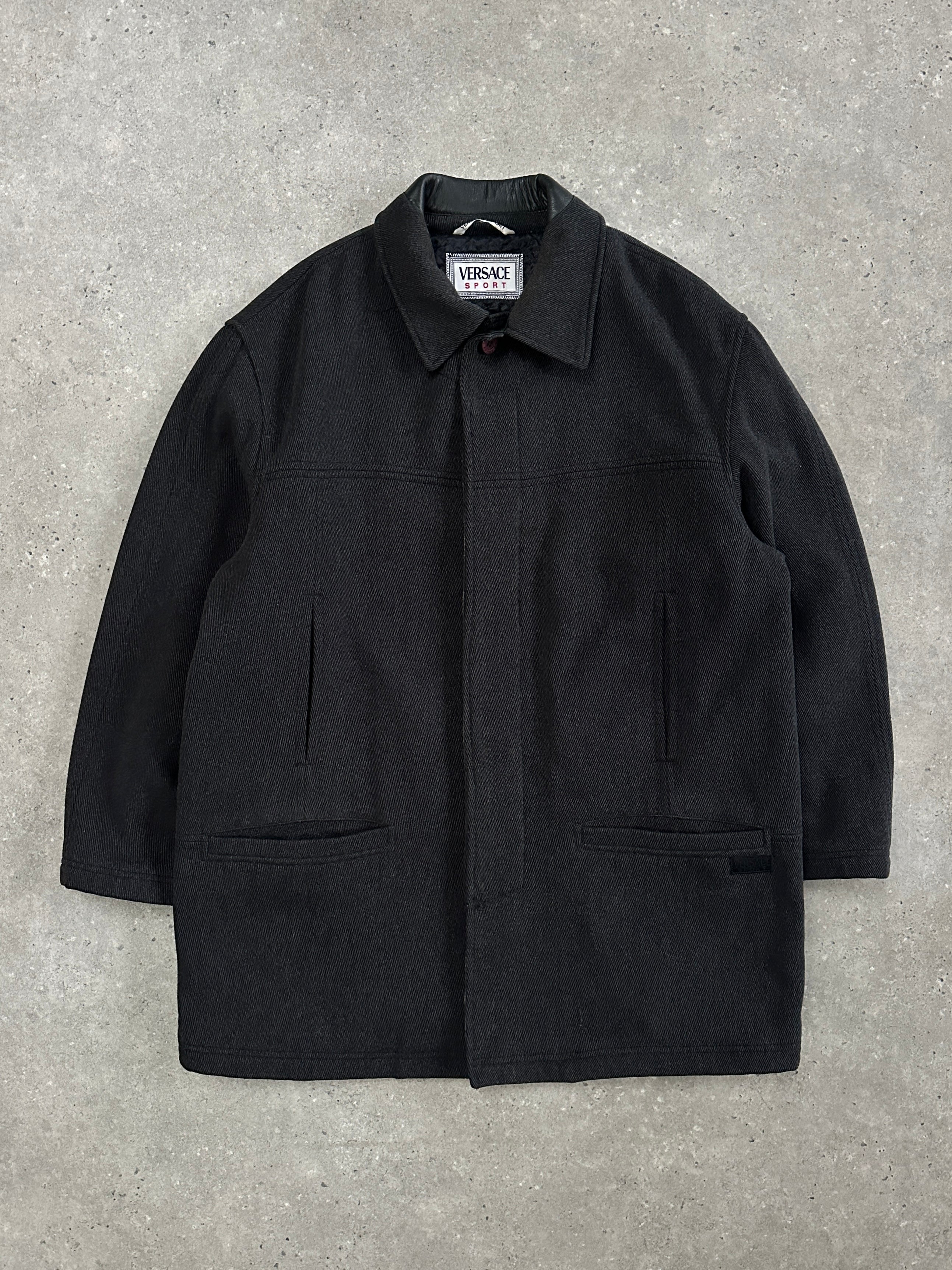 A vintage 1990s Versace Sport wool twill coat in a soft grey tone. A relaxed longline silhouette with a concealed button placket and subtle logo button detailing for a refined everyday outerwear feel.