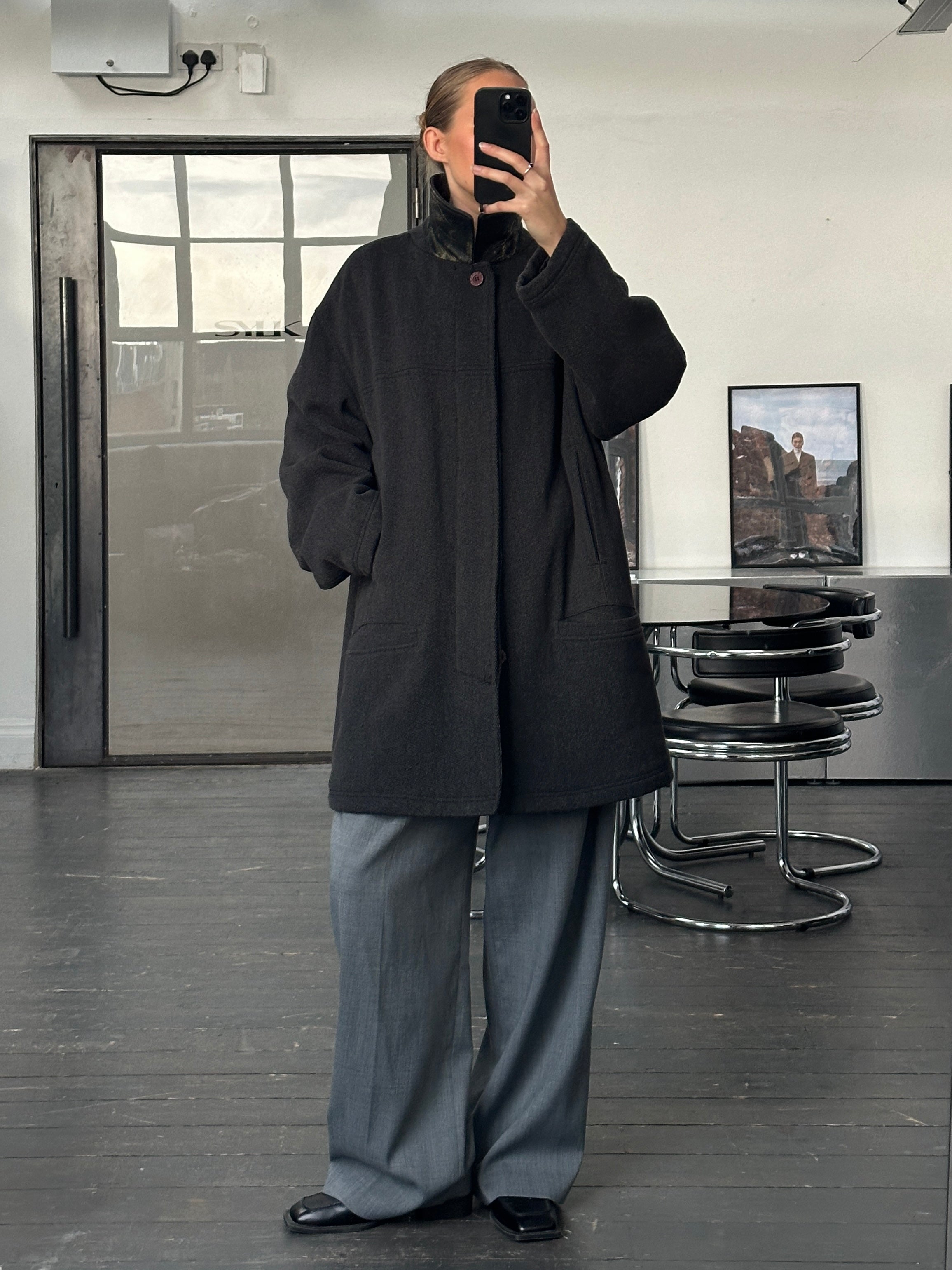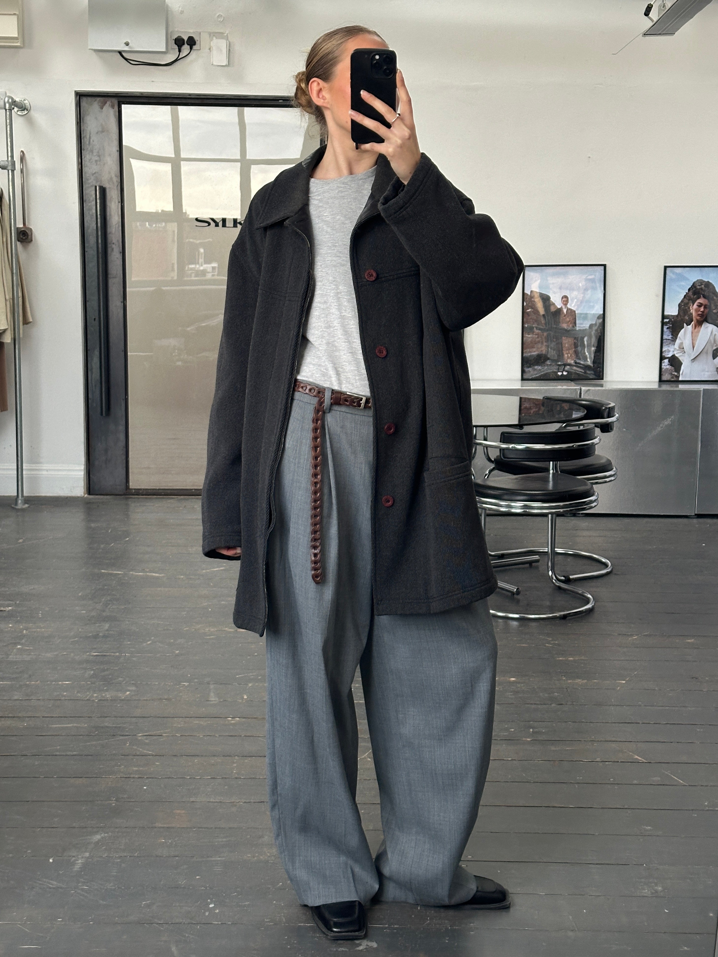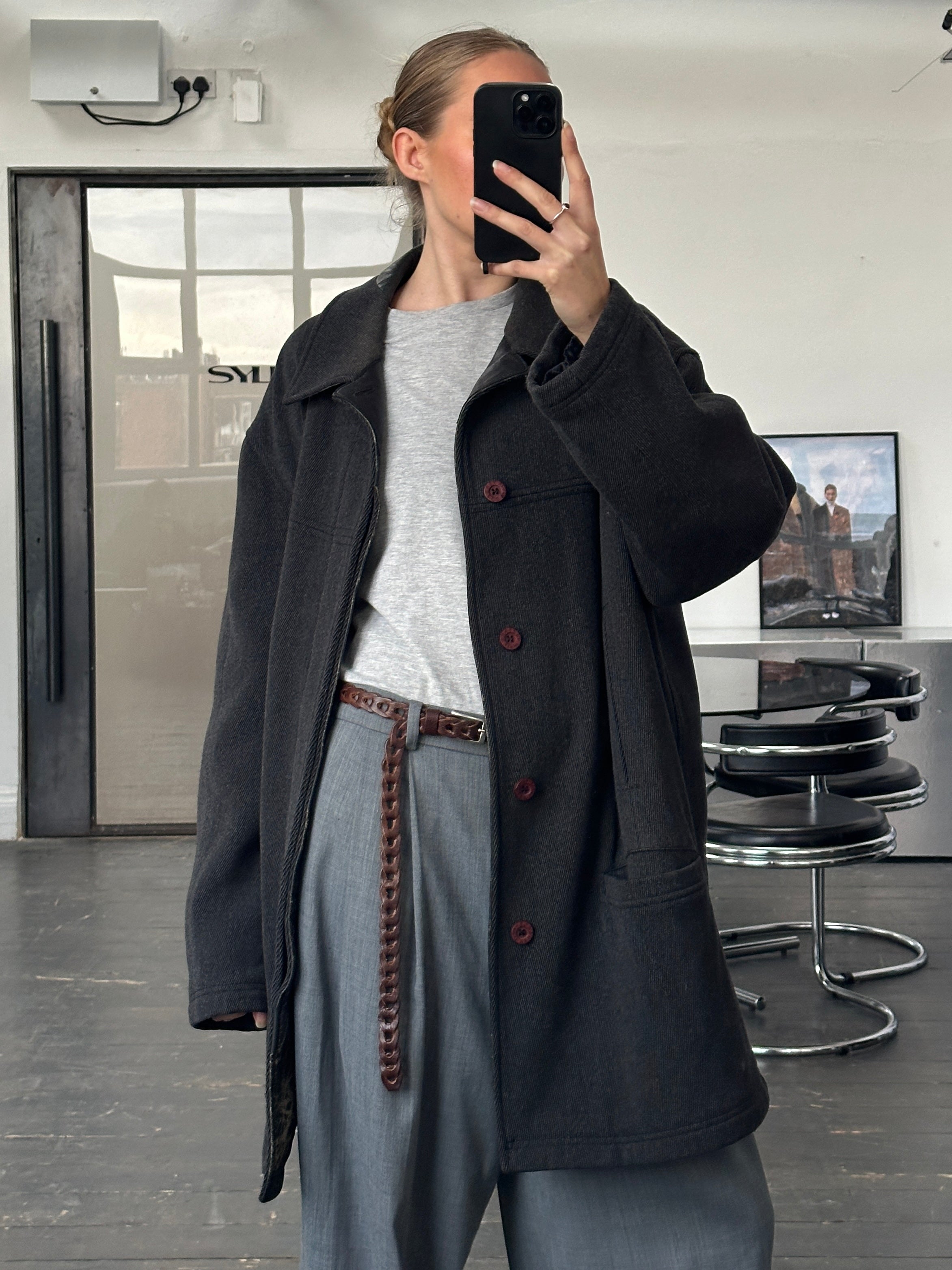 A vintage 1990s Versace Sport wool twill coat in a soft grey tone. A relaxed longline silhouette with a concealed button placket and subtle logo button detailing for a refined everyday outerwear feel.