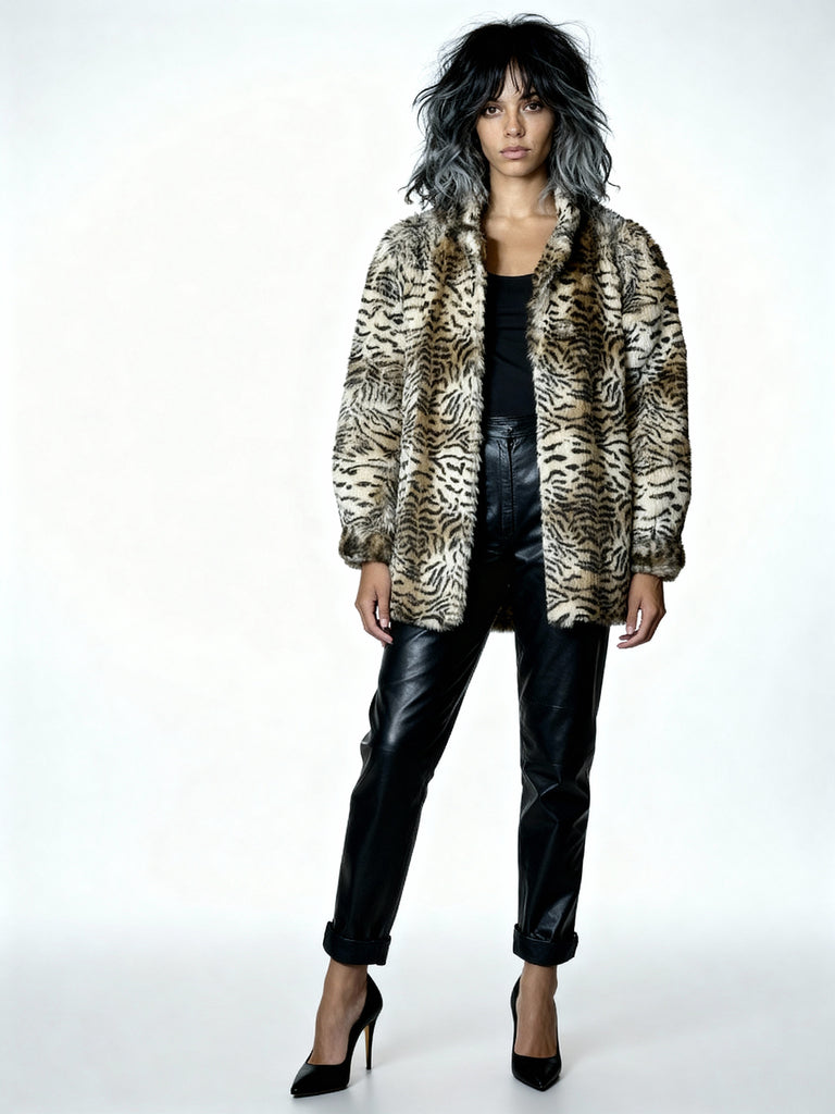 Original Vintage 1990's Tiger Print Faux Fur Coat UK 8 - 12