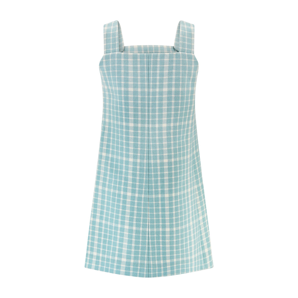 This tunic mini-dress, resplendent in pale blue gingham wool, was designed by Guiborgé for Miss Dior in the 1970s. Aimed at a younger audience than the Christian Dior Boutique collections, it has a playful, ingénue feel. The chunky straps form a dungaree-style top and fasten at the front with snap closures under white plastic tops. The front of the dress features a large pocket split into two that fastens with two white-topped snap closures. Accessed under the left arm with a white zip. It is fully lined in white satin. The original label reads “Miss Dior” in stylised font.