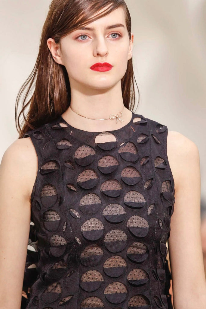 This archival haute couture runway documented dress was designed by Raf Simons for Christian Dior Spring 2014 Couture (look 21/35). The collection was the result of Raf pondering what Christian Dior himself would have designed had he been at the helm of his business in the 1960s, whilst also bringing Raf’s modernist aesthetic to the fashion house. The reoccurring details across the collection were the cut-outs and slashes in the clothes, described by Vogue as “quite sexual, as concealment infused with the peekaboo promise of revelation often is”. This high-low dress was a stand-out piece on the runway. Crafted from a thick woven cloth in a dark inky navy, it has cut-outs across the breadth of the outer fabric, resulting in semi-circular holes - as though it has been hole-punched and the circle of the paper has been left half in place. The gown has a high-neckline and is sleeveless, falling around the body in a cocooning shape that is emphasised by the structured, thick hemline and triple-layered, draping of the back. The layer of navy mesh and layer of tulle, underneath the top fabric, form a bustle-like volume around the back of the gown. The hem is asymmetric, forming a 1960s mini-dress shape at the front and falling to a floor-sweeping length at the back. This dress is lined with polka-dot mesh throughout, It fastens at the rear with a hidden tonal zip and hook-and-eye clasp.
