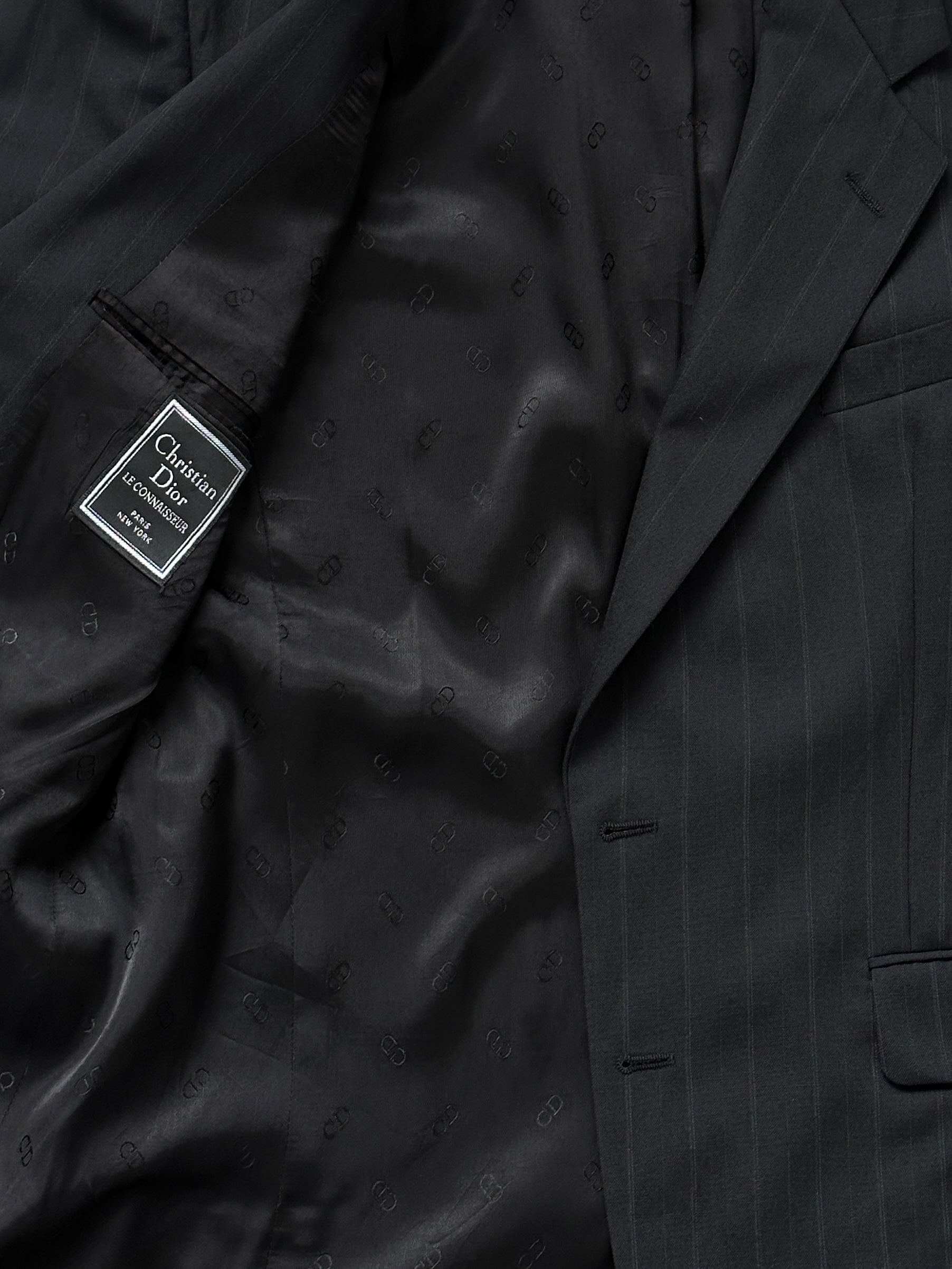 A tailored 1990s vintage Christian Dior Le Connaisseur blazer in classic black with fine vertical stripes and a subtle CD monogram lining throughout. Cut with a structured shoulder and clean single-breasted silhouette, offering a sharp formal profile with understated designer detailing.