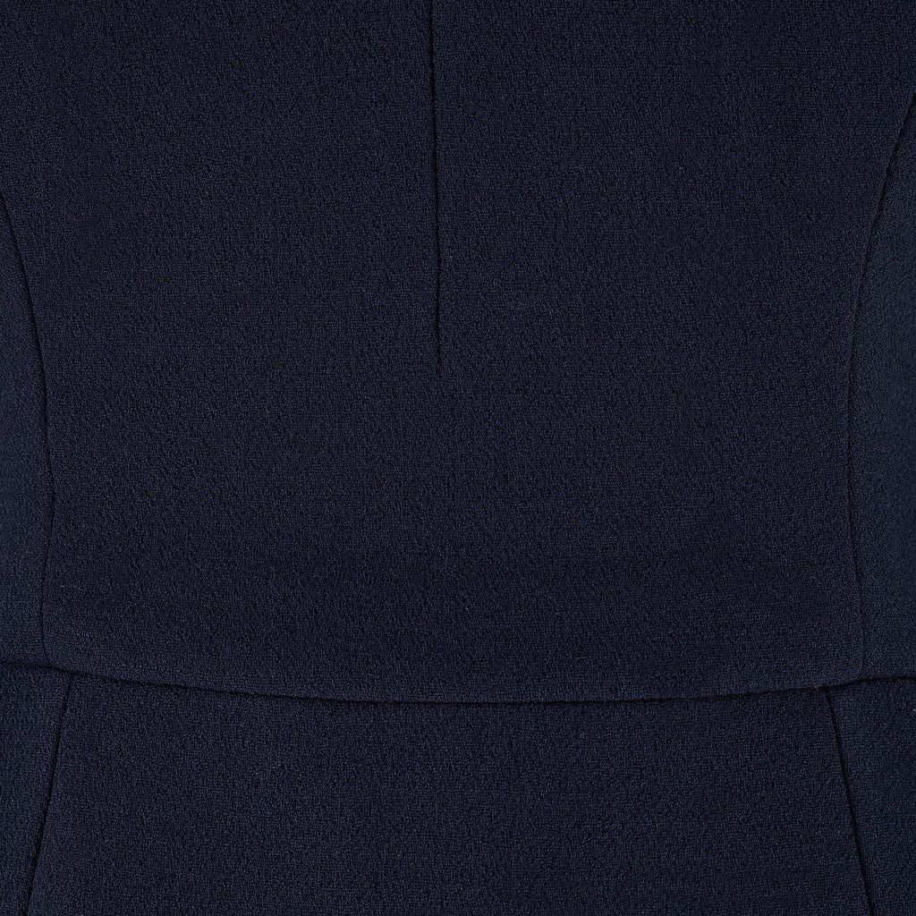 This dress is from Dolce & Gabbana's highly glamorous Alta Moda couture line. Flaunting many of the fashion house's beloved signature details, we love the underwear-as-outerwear detailing seen in the peekaboo black lace around the collar and the internal corsetry. Tailored from inky navy-blue wool, it hugs that body in that oh-so-Dolce way, accentuating and highlighting the curves. The skirt falls to knee-length and has a small slit in the back for ease of movement. The sleeves are cut into an angel-sleeve silhouette, with dramatic flared cuffs that fall over the wrists. The wide neckline shows the collarbones and is trimmed with delicate black lace. Inside, the couture craftsmanship is revealed and it is hand-lined throughout with black silk satin. There is an internal corset that shapes the bust and the waistline. Made from black mesh, the boning encircles the waist and bust, fastening with hook-and-eye clasps. The dress fastens at the back with a hidden zip, alongside hidden snap closures on the lace panel.