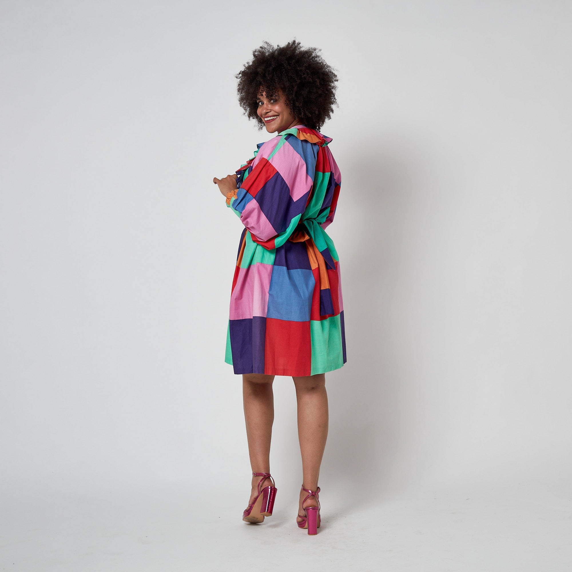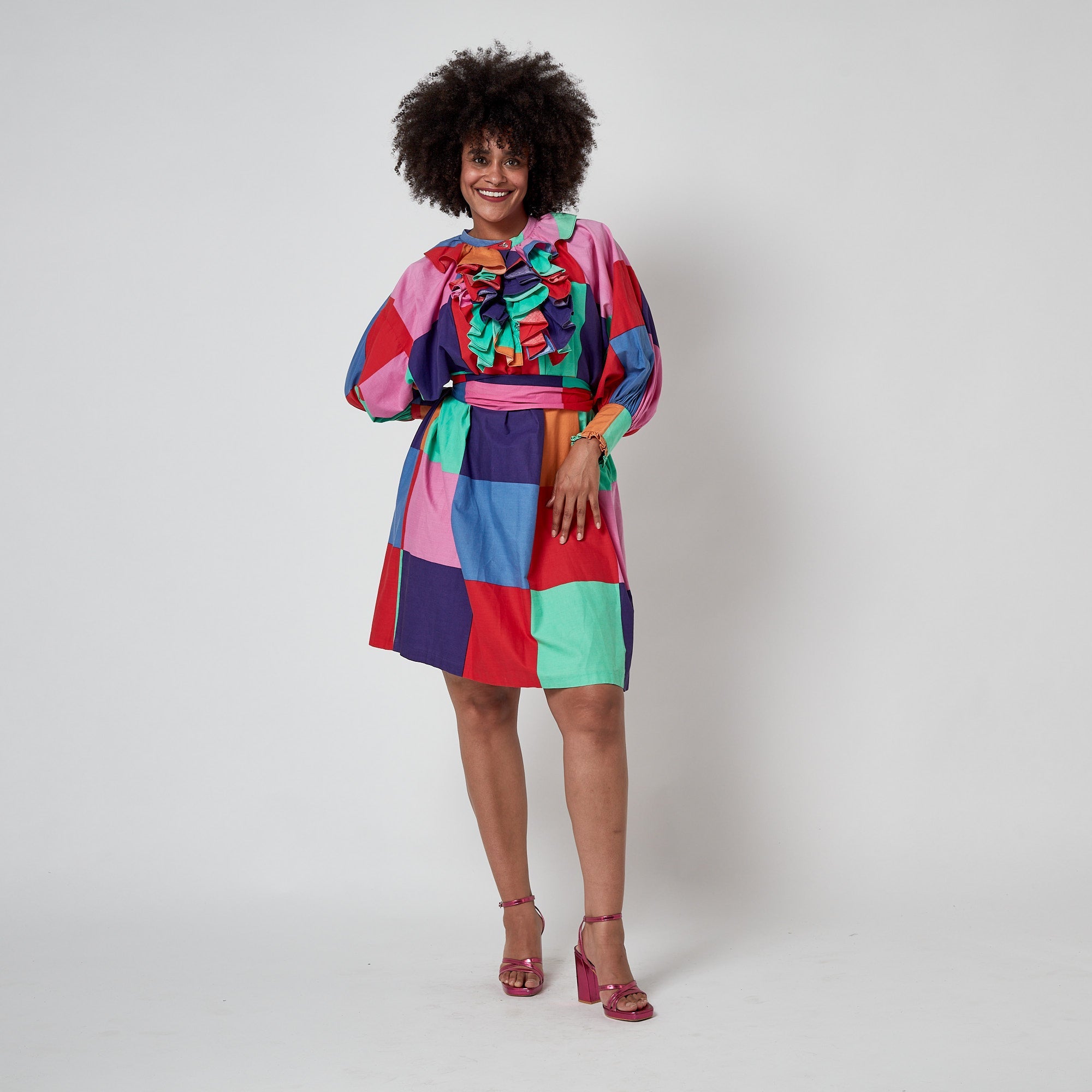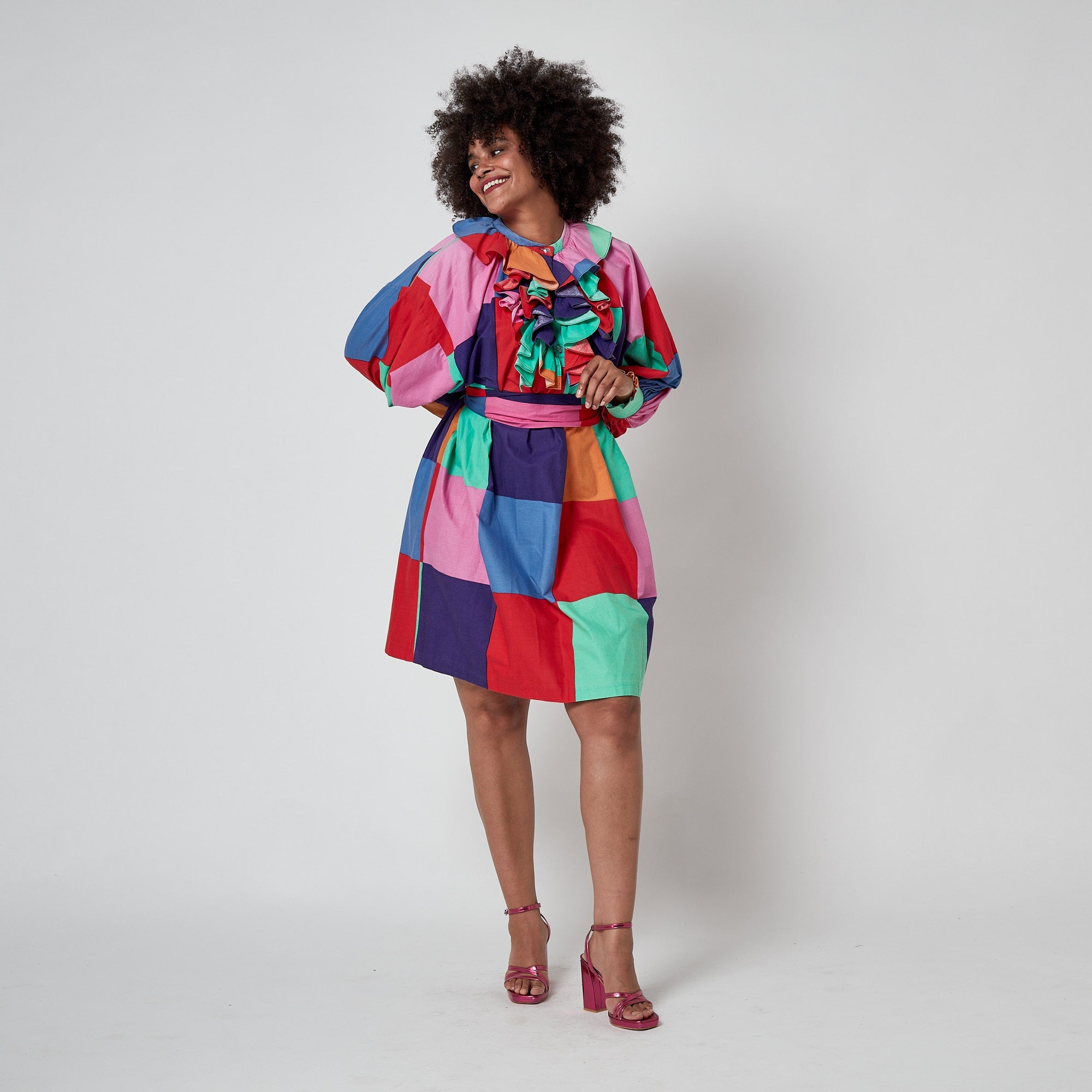 This striking colour block dress was designed by Fenno Sport in the 1970s. Fenno Sport was a Finnish textile and fashion brand that created high quality, boldly coloured graphic prints that were widely renowned. This dress is one of the most fun examples of Fenno’s ready-to-wear we’ve seen. Tailored from 100% cotton, it is printed with blown-up checkerboard squares in clashing rainbow hues. It has an oversized, cocooning fit with sleeves tailored to a voluminous ball-sleeve cut with ruffle-trimmed cuffs. The high neckline is collarless and buttons up with translucent square plastic buttons. The button placket is trimmed with a theatrical bib of coordinating ruffled cotton. The dress is unlined. It comes with a co-ordinating sash belt and we are so glad these two have stayed together all these years!