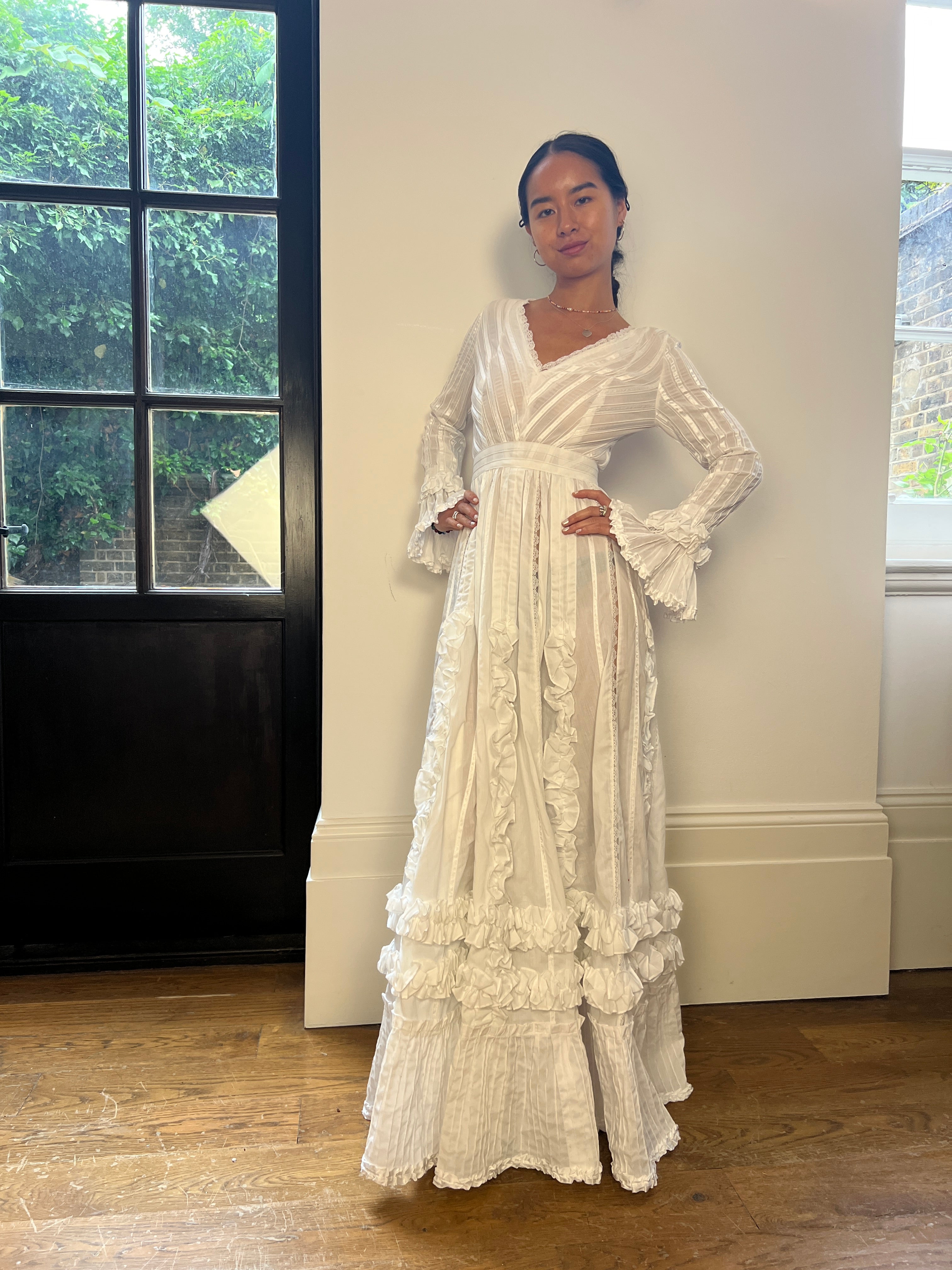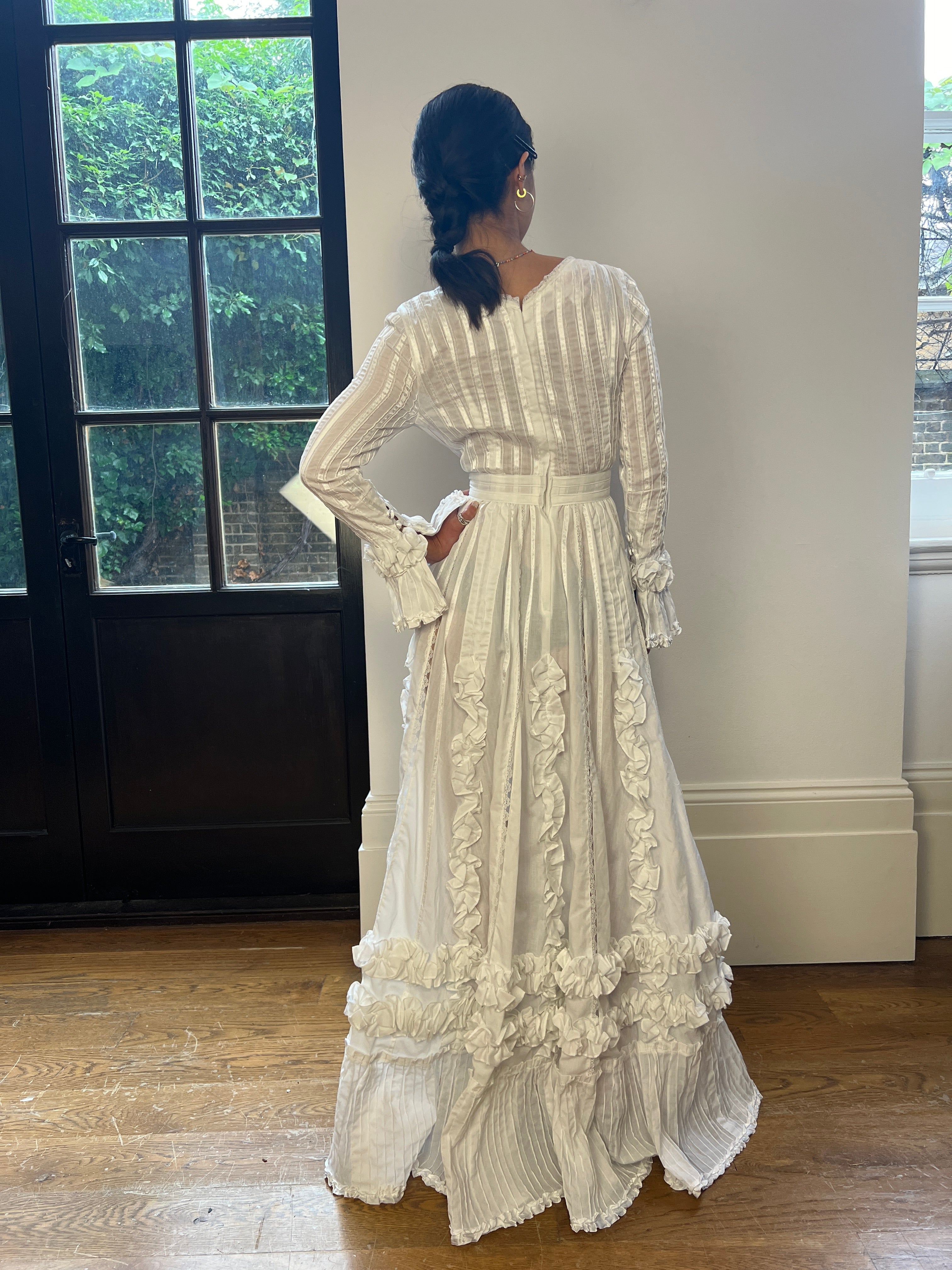 Sublime late 1970s to early 1980s Mexican wedding dress from the legendary Mexicana boutique which was located just off the Kings Road in London. Pleated all over, it is made from bright white cotton which has been intricately pin-tucked all over and detailed with stripes of tonal lace. The bodice is compiled from alternating stripes of cotton and ribbon, and has a V-neckline trimmed with lace. It showcases decadent ruffles in crisp cotton at the cuffs, skirt hem and cascading down the skirt. The skirt is decadently finished, smothered in frills and lined with a thick quilted lining. The waistband falls in pleats that soften as they fall, until they reach the bottom hem and deep flounce which is detailed with intricate folds. The playful flared sleeves feature satin-covered buttons.