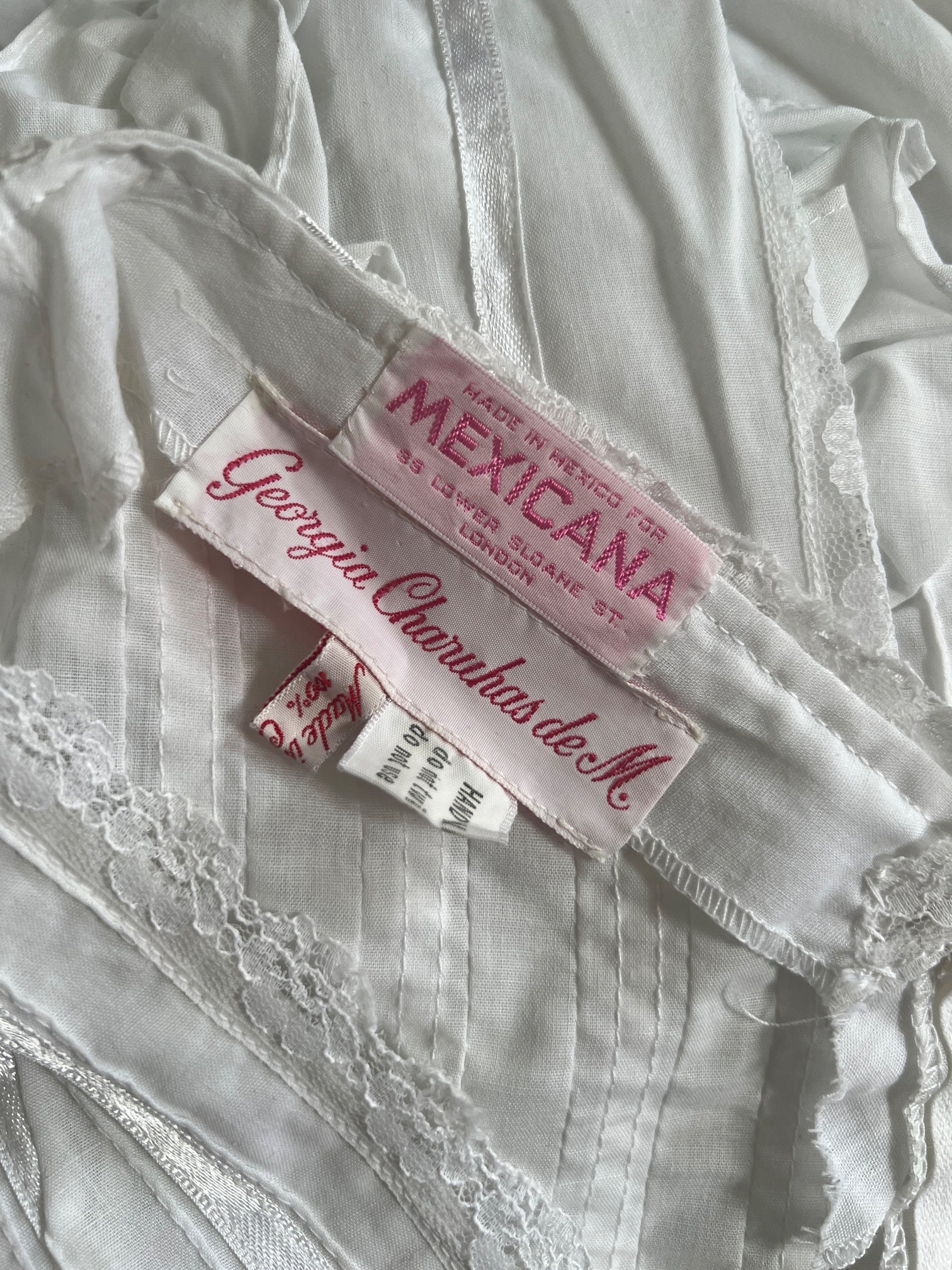 This decadent gown is in excellent condition with no flaws of any note and is one of the best dresses we have seen of this type in years. Alongside the Mexicana label is the name Georgia Charuhas, an American born artist who has made Mexico her home. She has exhibited at galleries and museums across the U.S., Mexico and Europe and also founded and owned several businesses including a clothing factory that manufactured items based on her designs. The dress will best fit a UK 6 or US 2 on account of the small waist. Our model is a UK 6-8 and 5ft 4in (163 cm) and this fit her well.