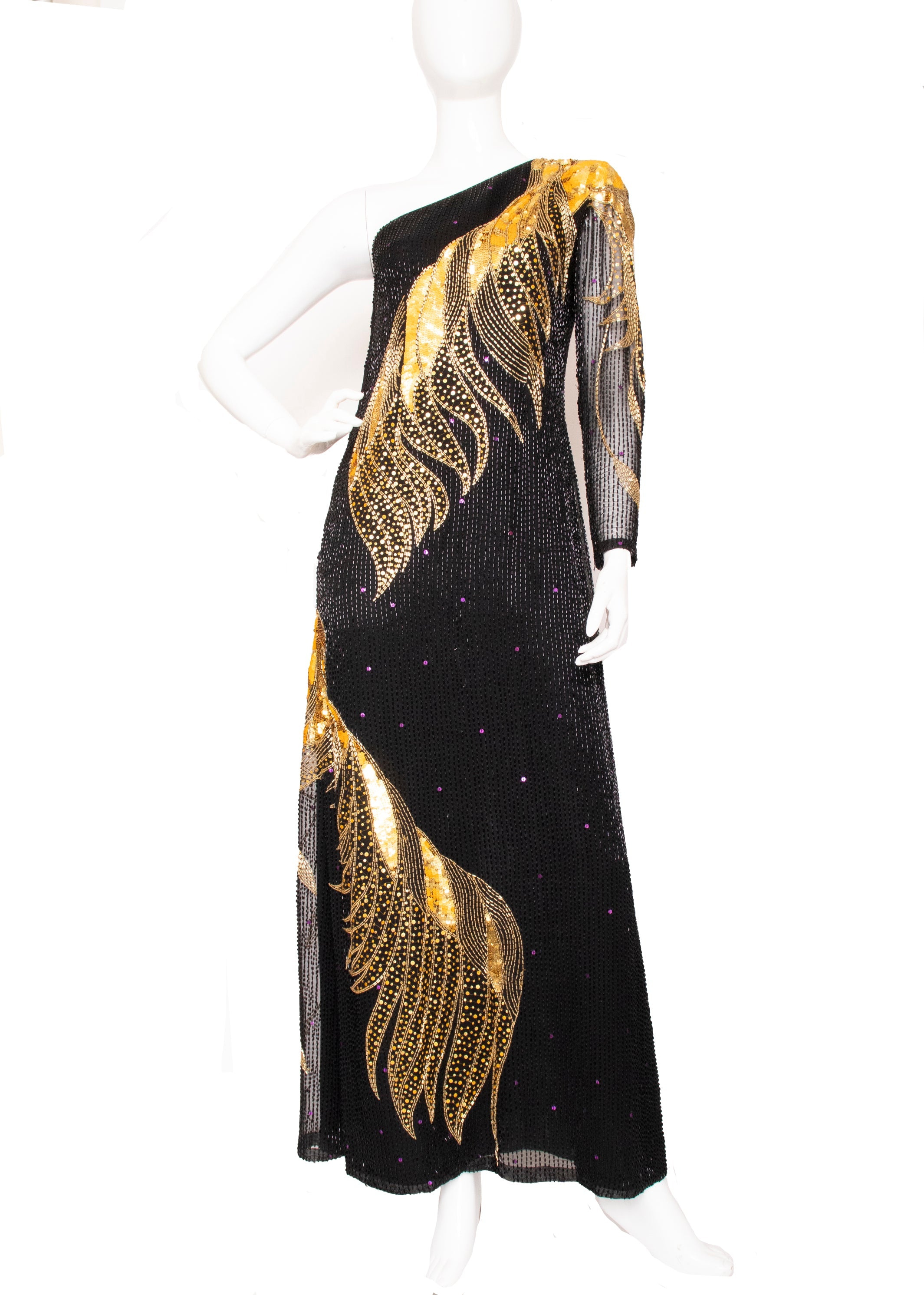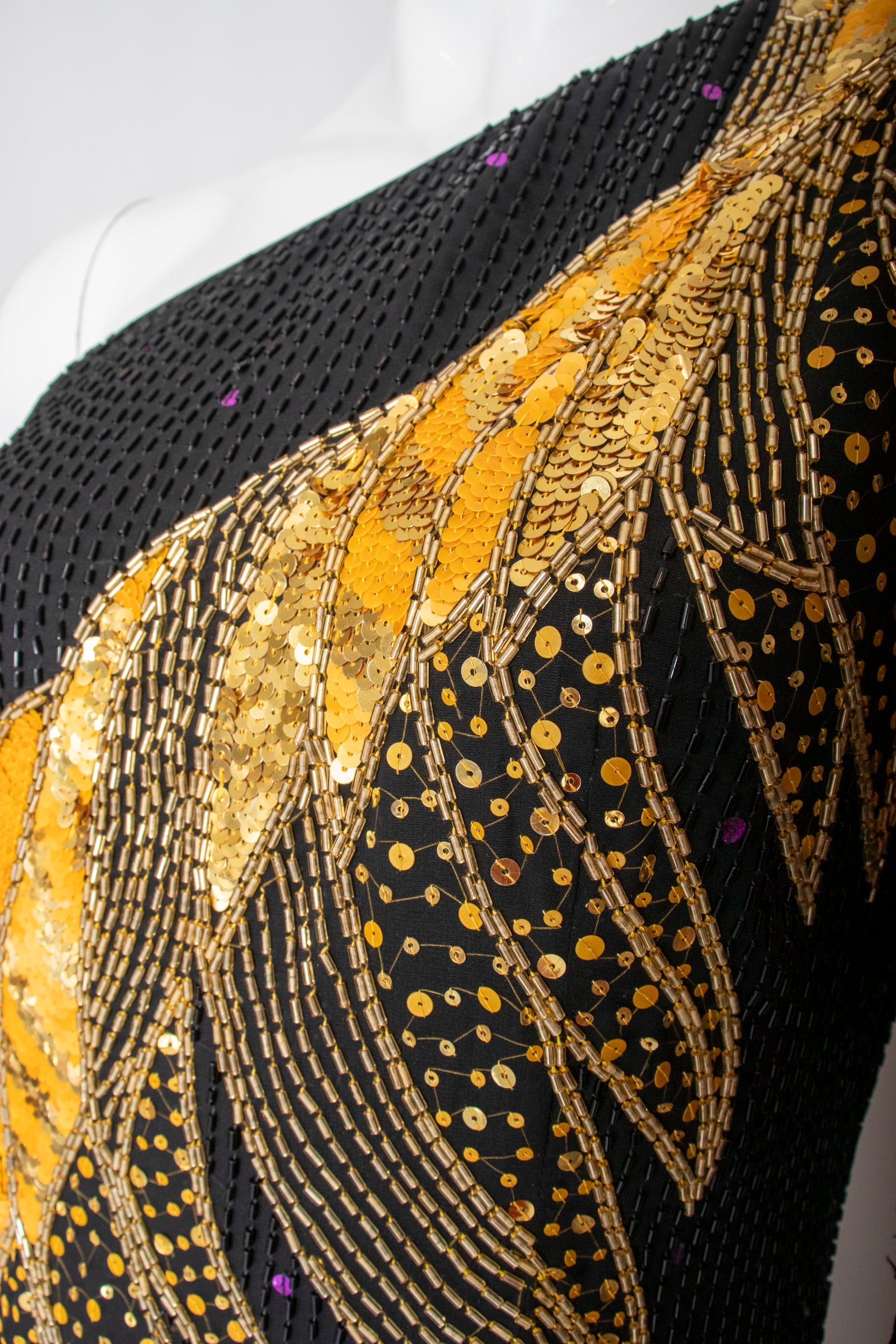 This Amen Wardy Beaded Cocktail Dress captures the essence of the 1980s with its distinctive one-sleeve design in black and gold. From Newport Beach, California, each bead is meticulously placed. The dress is fully lined with a sheer sleeve, professionally dry cleaned, and perfectly prepared for your next celebration.
