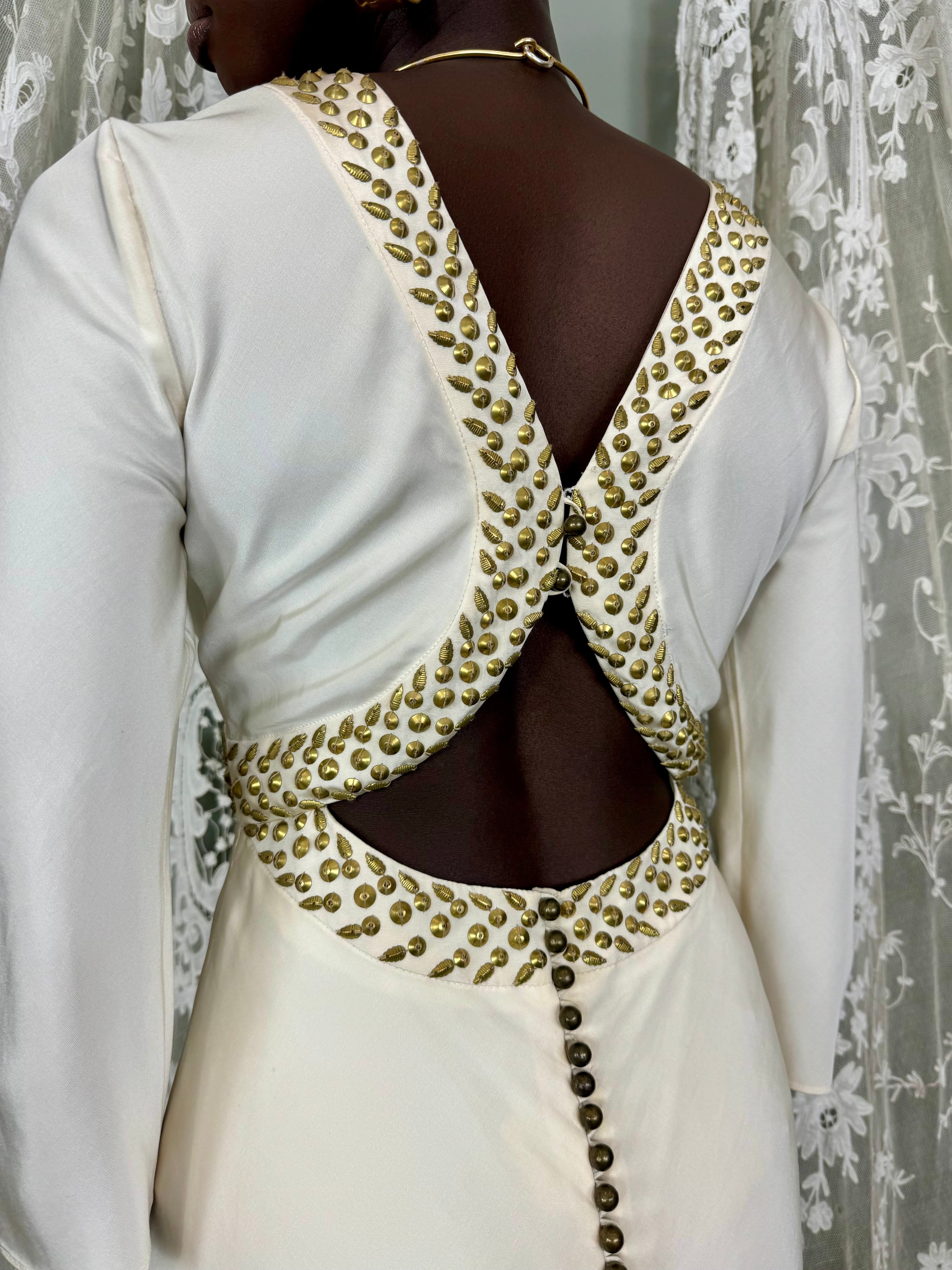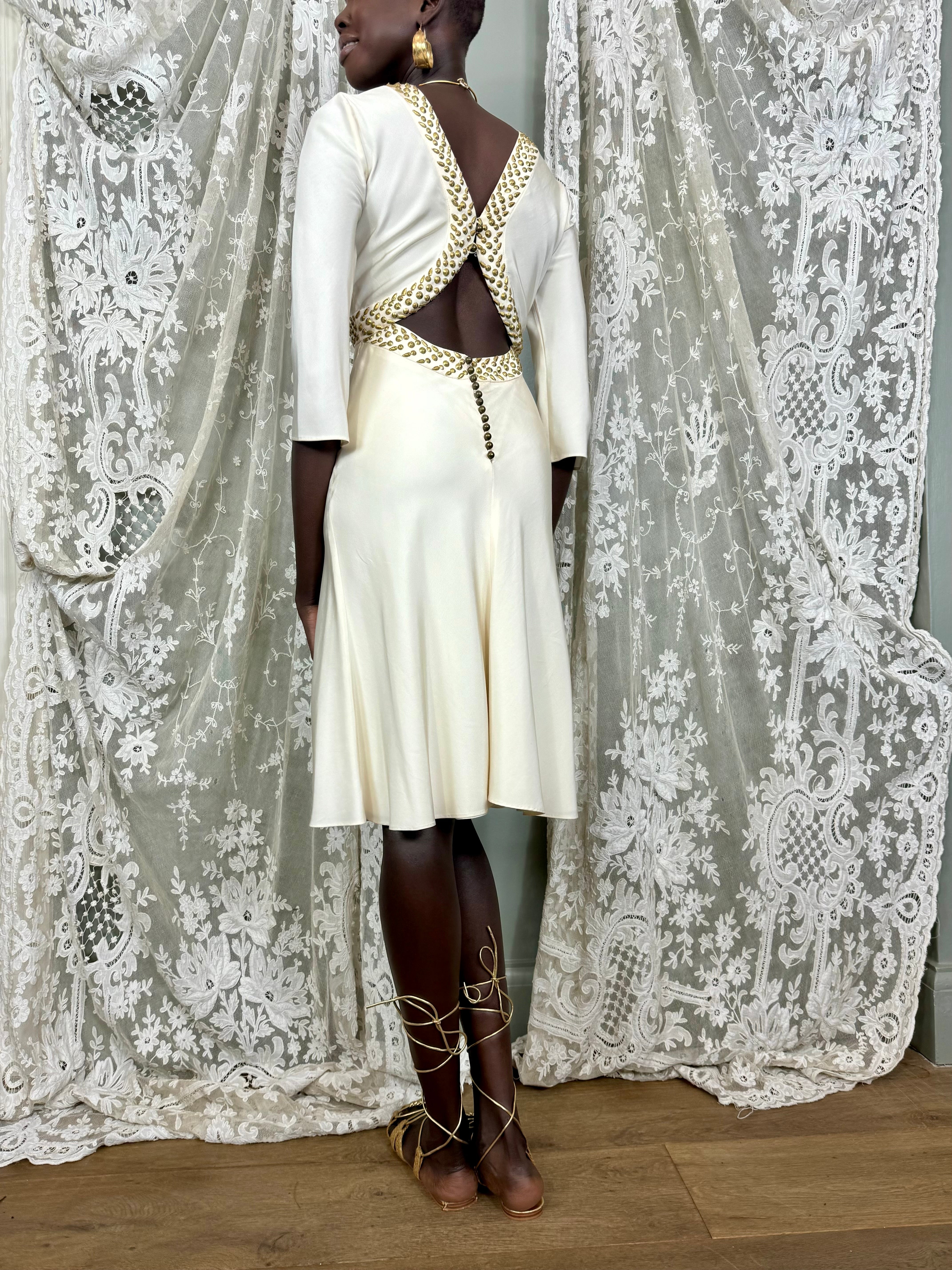 This Chloé Y2K cream studded dress exudes sophistication and elegance. Featuring a flattering V neckline and 3/4 length sleeves, this dress also boasts a unique keyhole design on the back. The delicate stud detailing on the neckline and bust adds a touch of glamour, while the matching buttons on the back provide a polished finish. Comes lined.