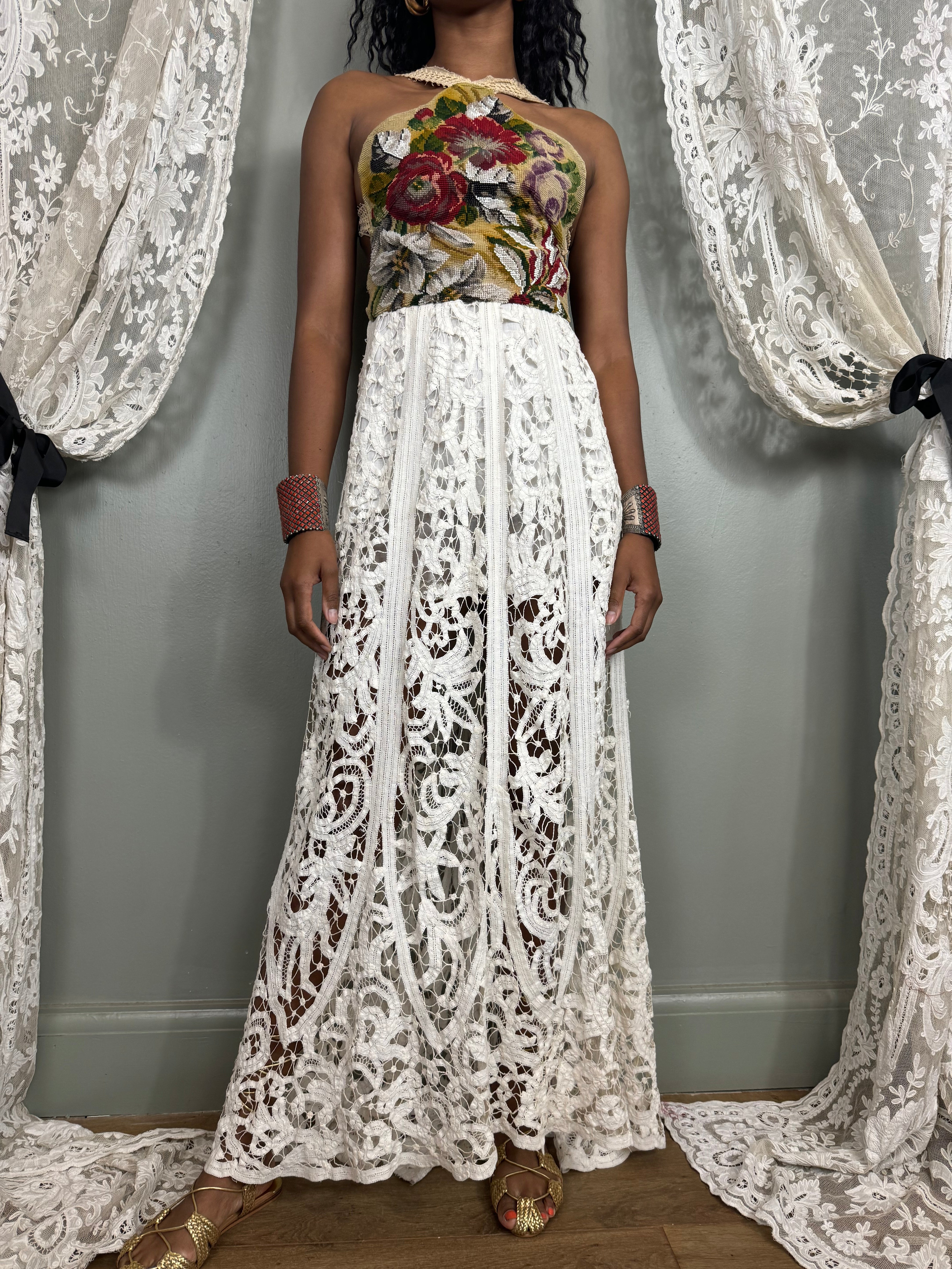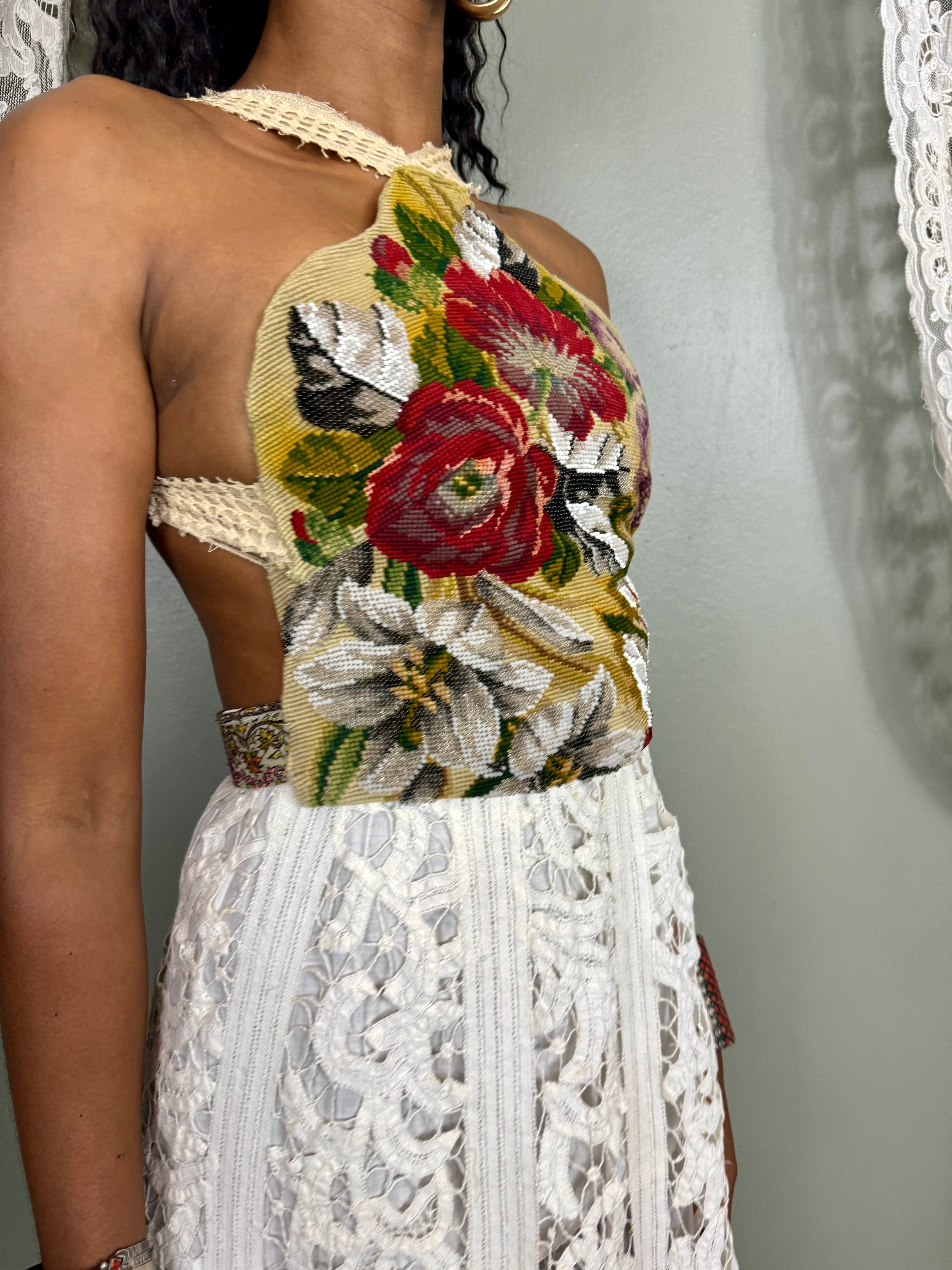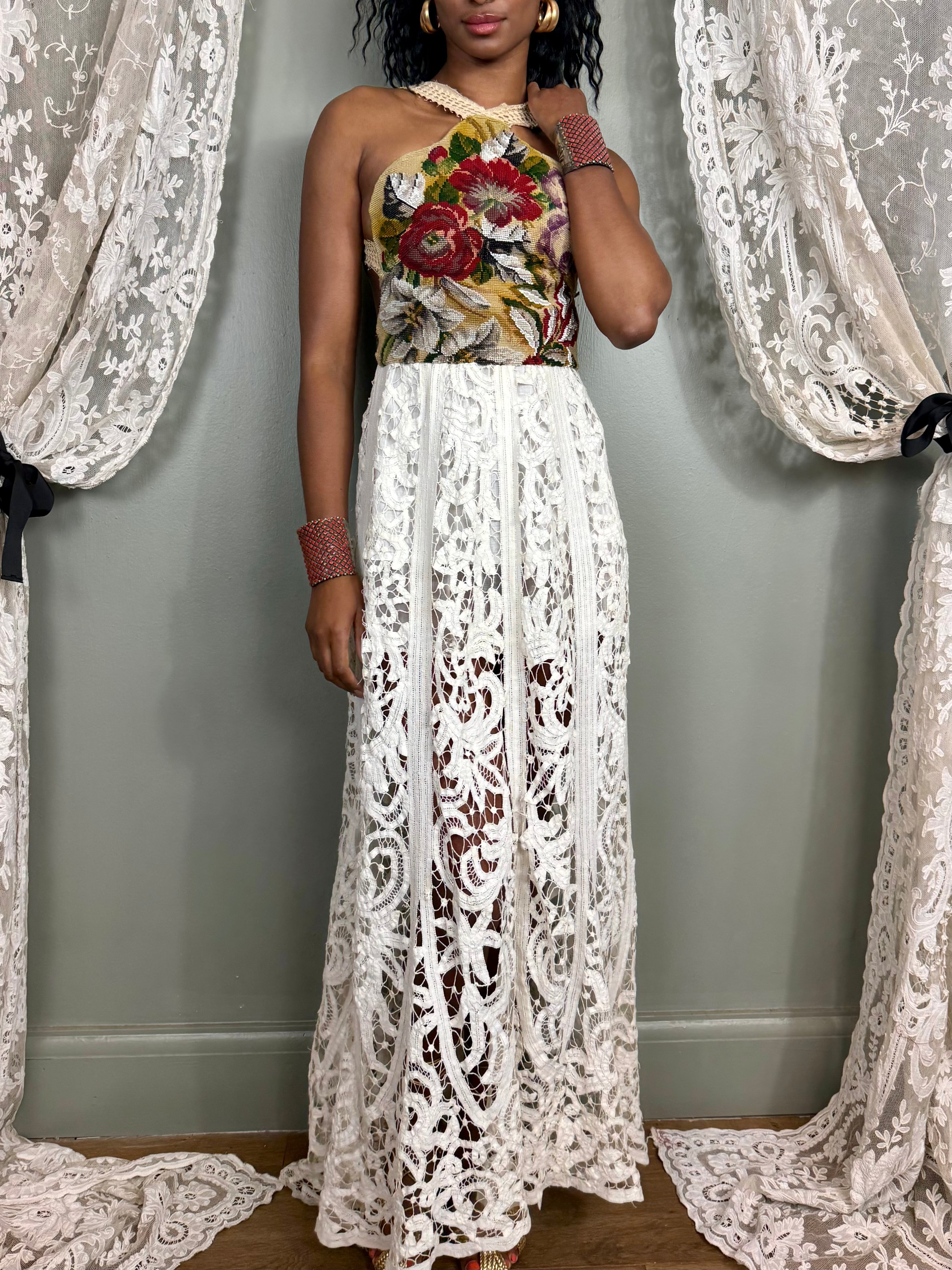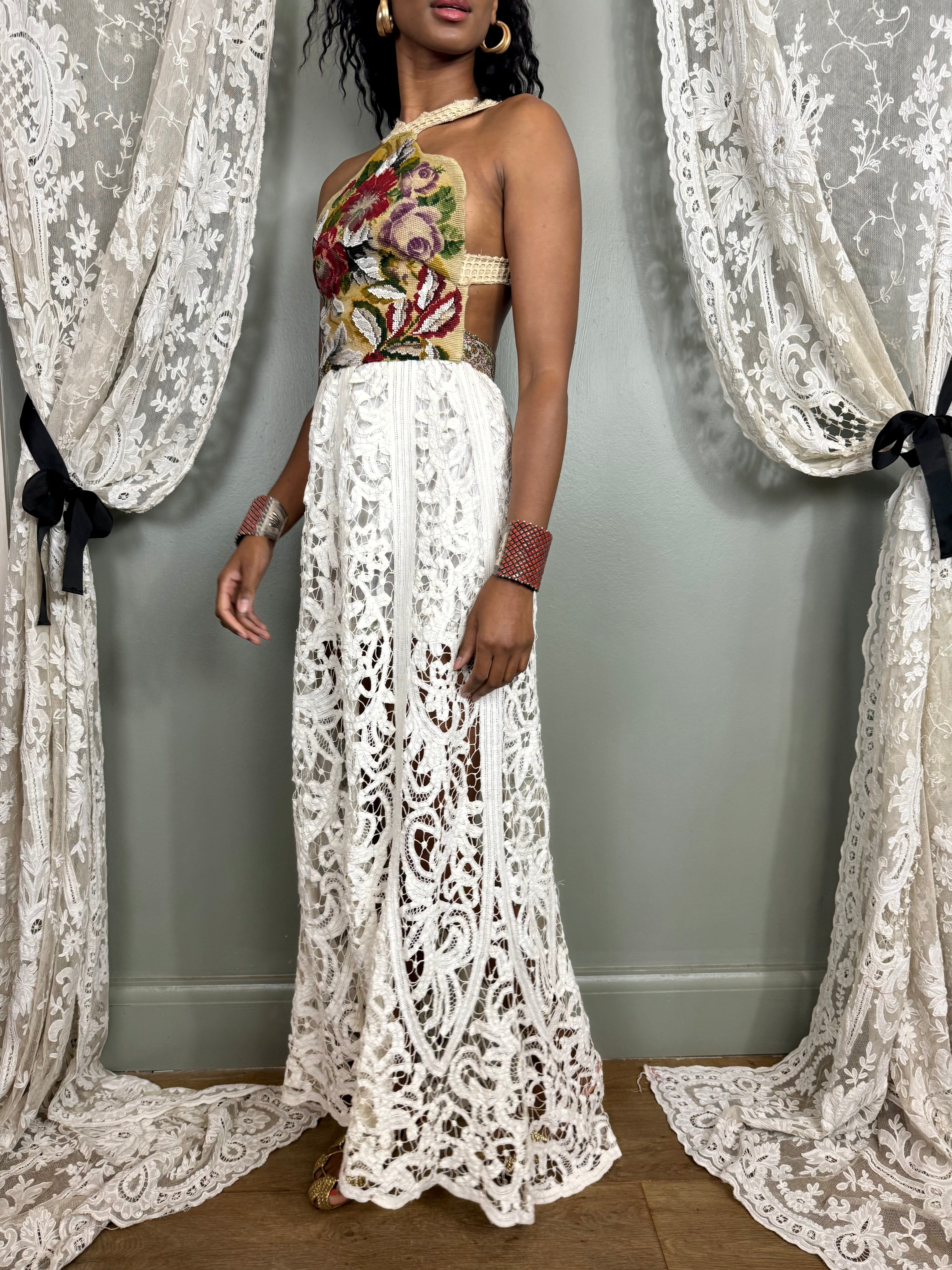 Expertly crafted, the Eghi Victorian dress exudes elegance. The beaded floral tapestry bust captures attention while the cream tape work lace skirt adds a touch of sophistication and original features. Tie straps and button fastening provide a perfect fit. Elevate your style with this fabulous dress. Has been lined to cover the bottom part.