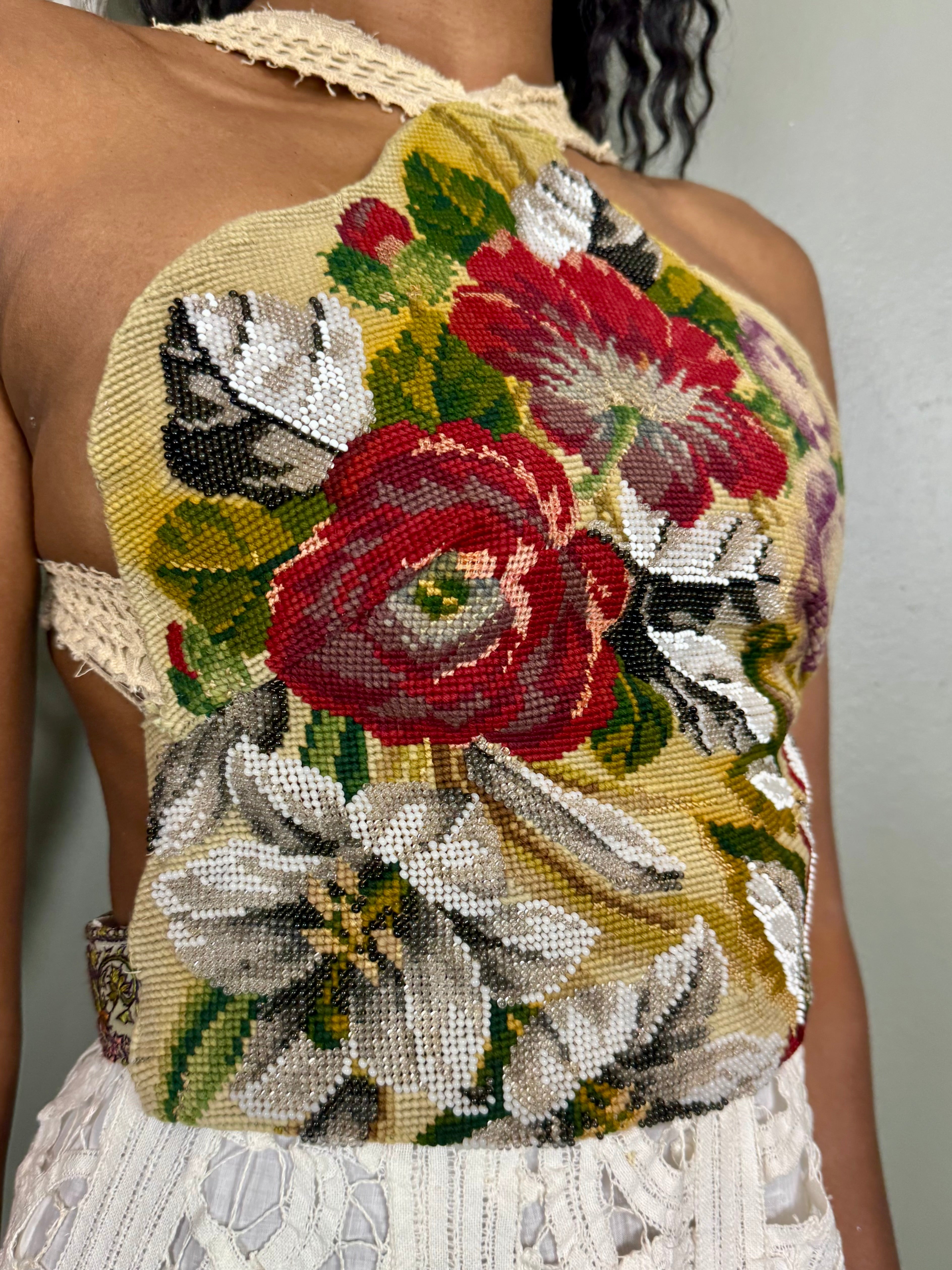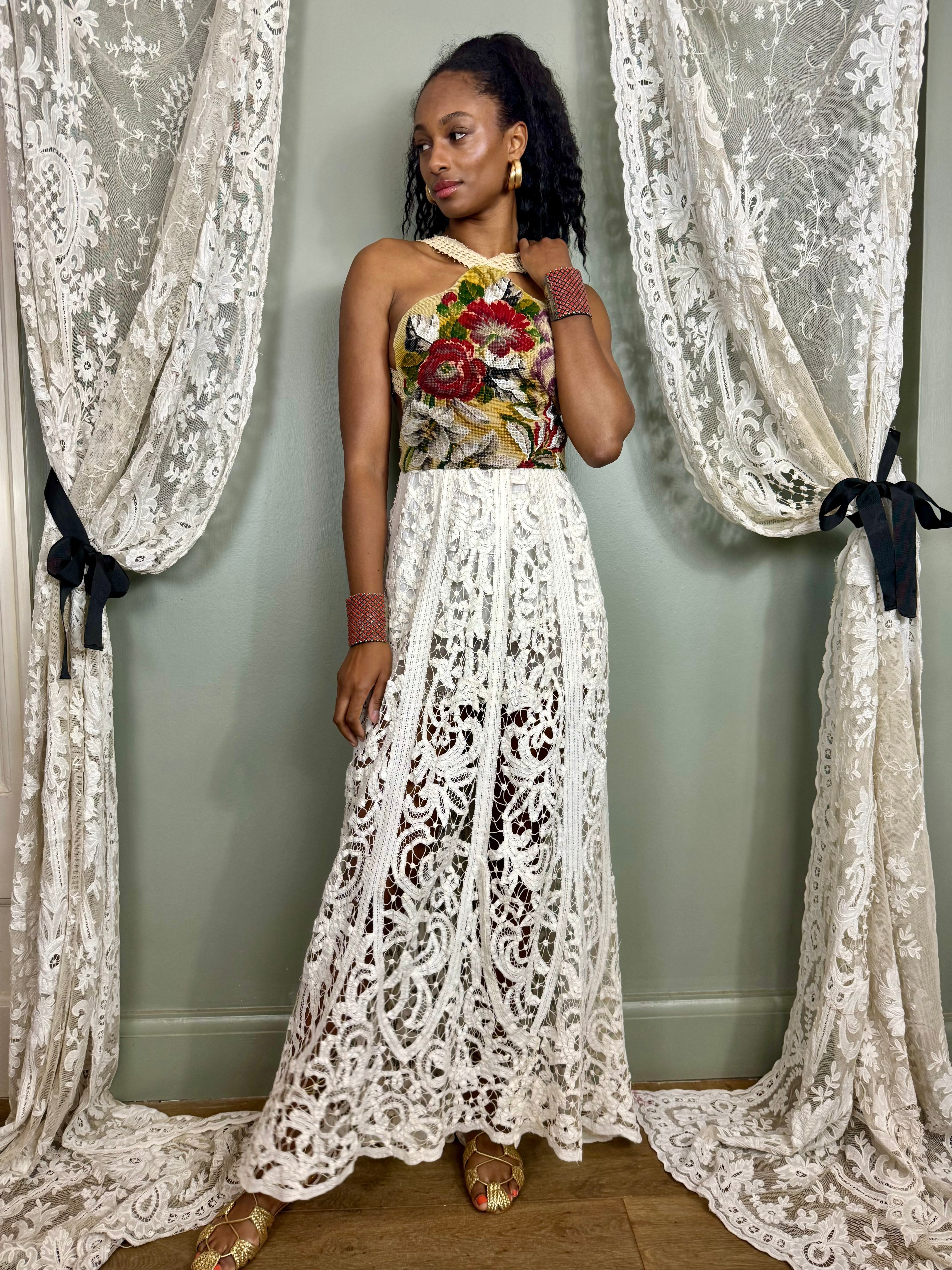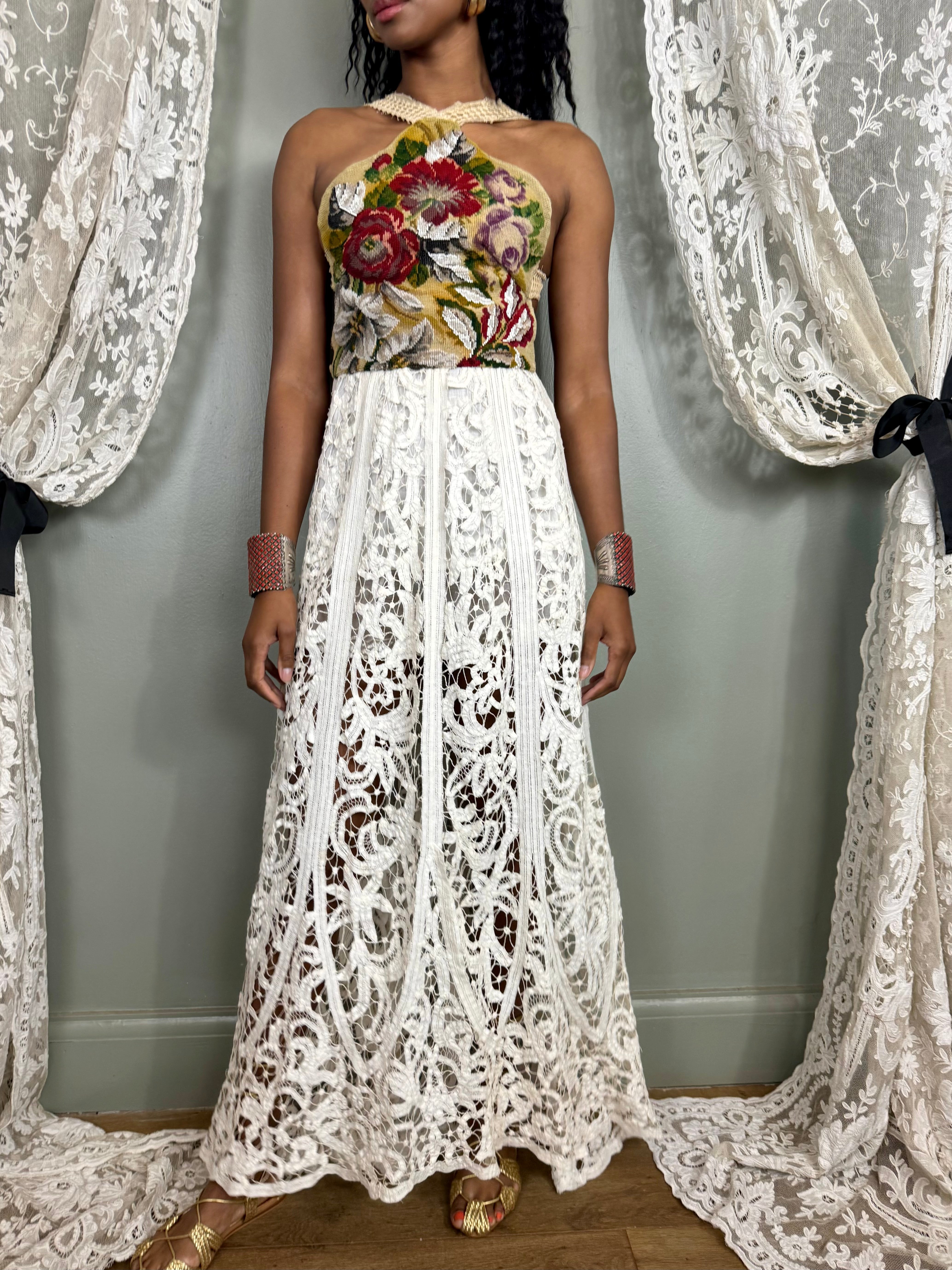 Expertly crafted, the Eghi Victorian dress exudes elegance. The beaded floral tapestry bust captures attention while the cream tape work lace skirt adds a touch of sophistication and original features. Tie straps and button fastening provide a perfect fit. Elevate your style with this fabulous dress. Has been lined to cover the bottom part.