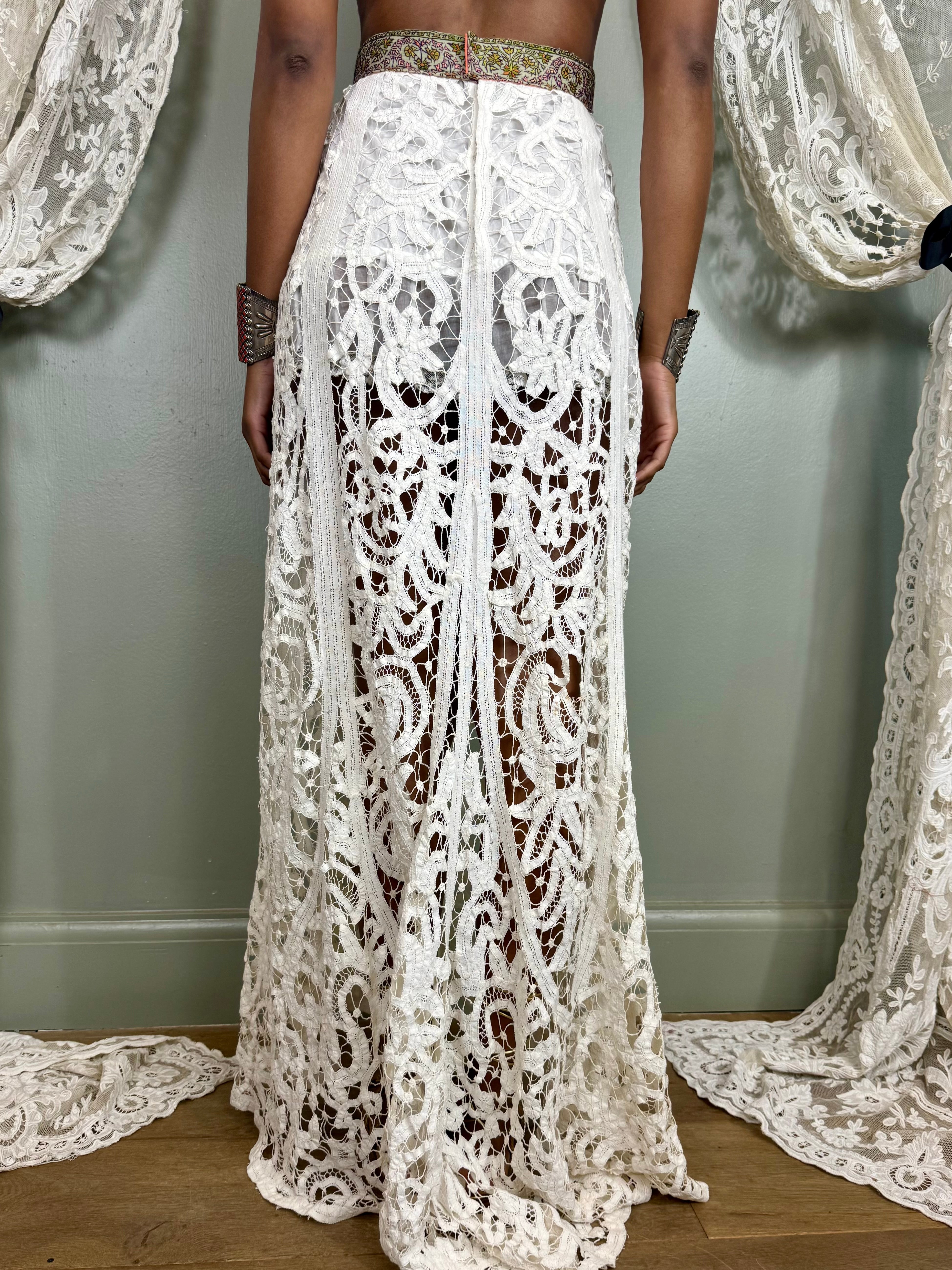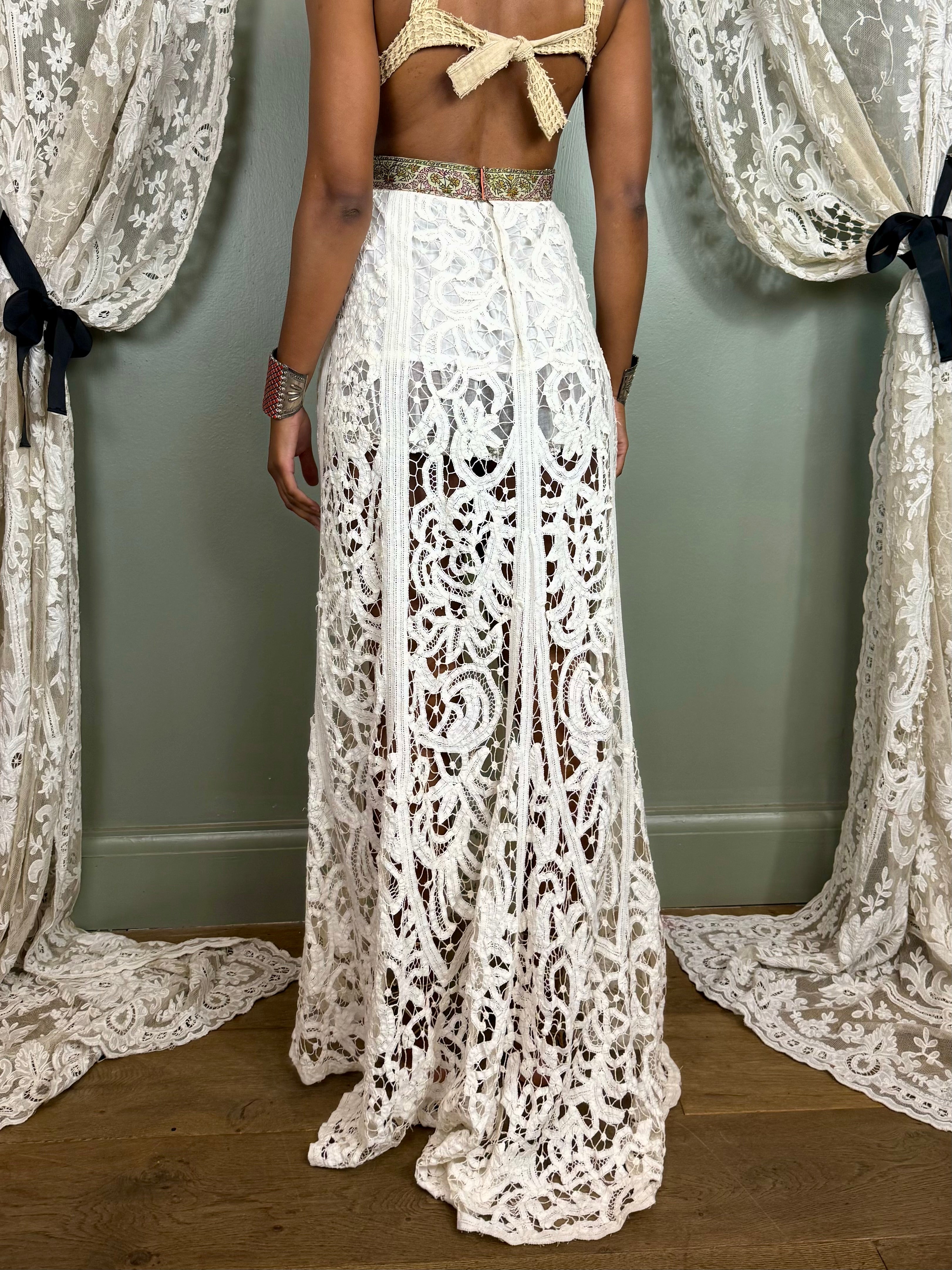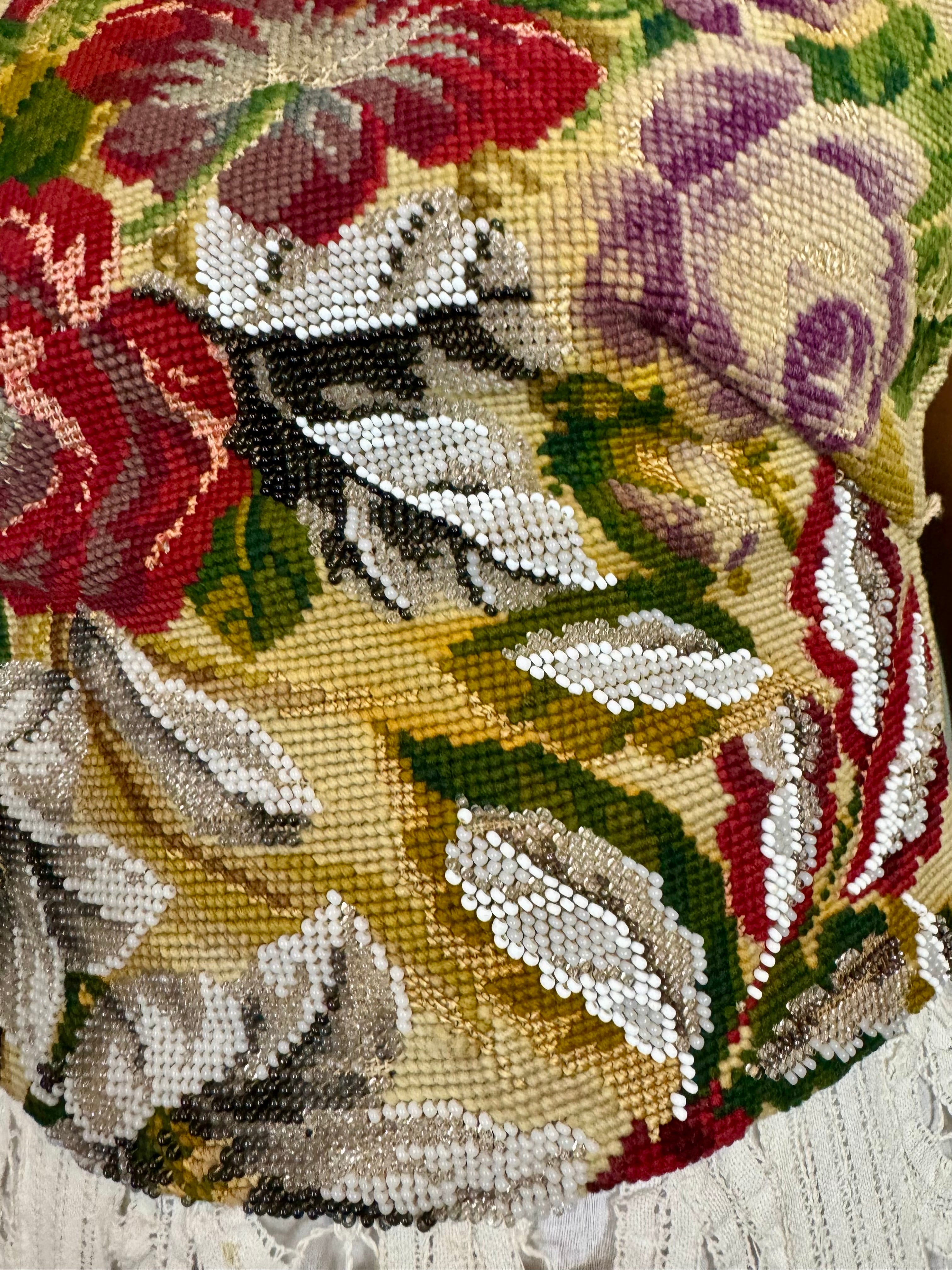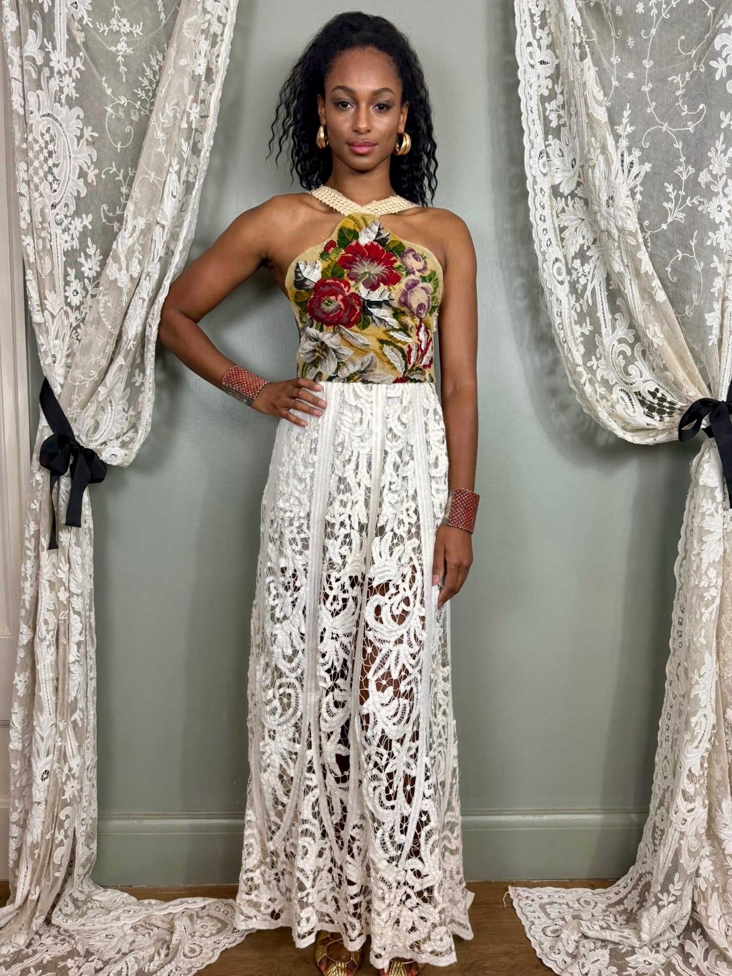 Expertly crafted, the Eghi Victorian dress exudes elegance. The beaded floral tapestry bust captures attention while the cream tape work lace skirt adds a touch of sophistication and original features. Tie straps and button fastening provide a perfect fit. Elevate your style with this fabulous dress. Has been lined to cover the bottom part.