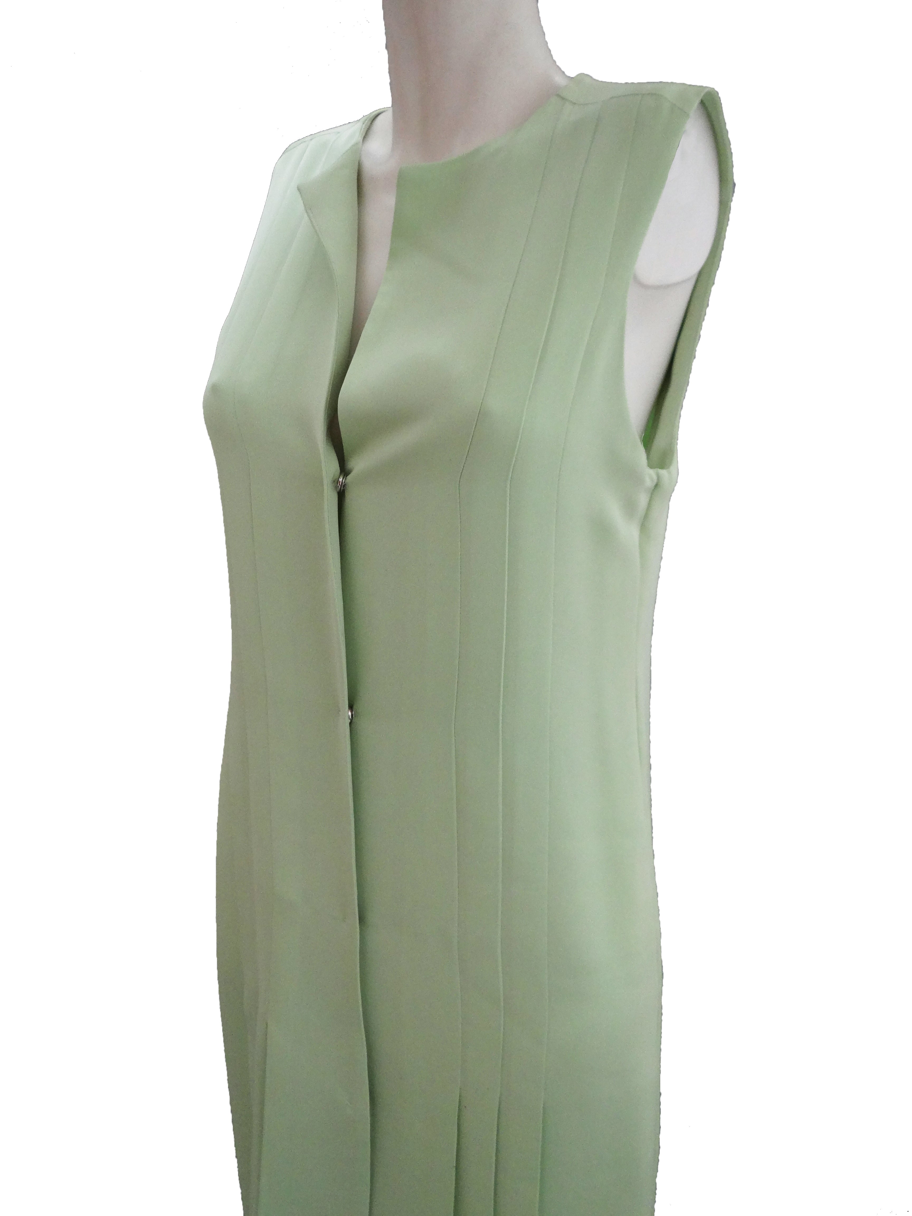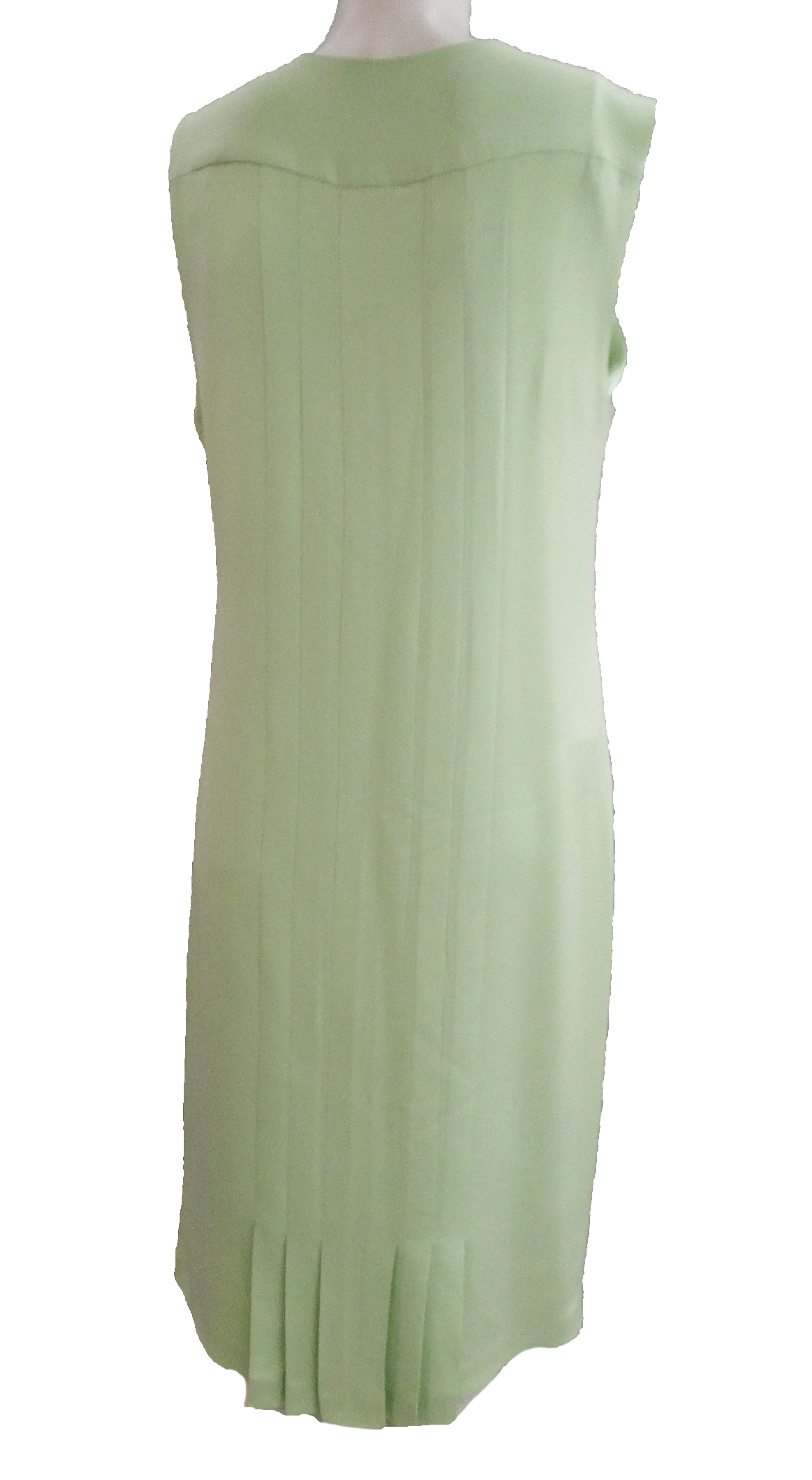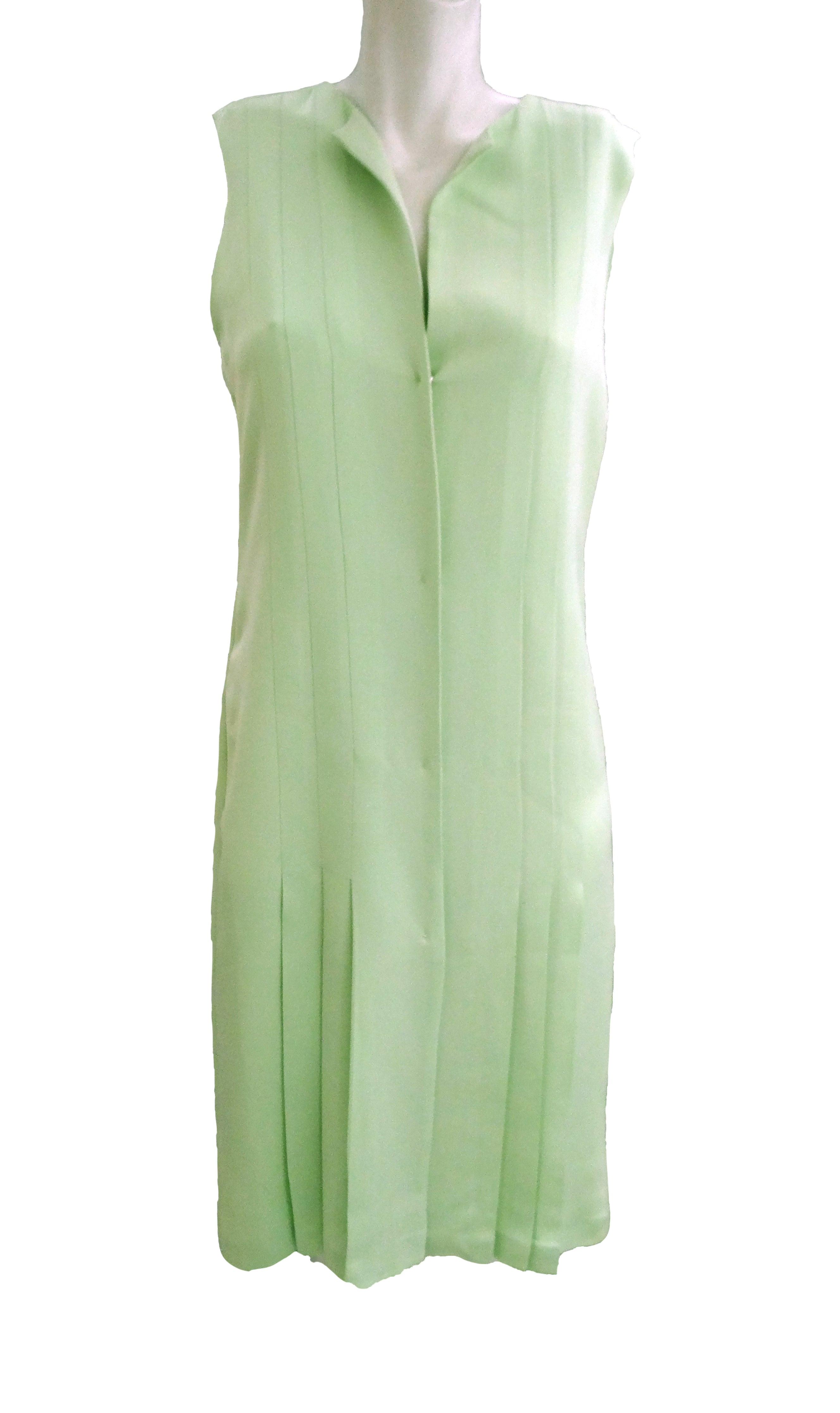 It is sleeveless with a round neck, and is cut straight to mid calf, with 6 pleats front and back, mostly closed down the length of the dress but kicking out below the hips. It fastens with invisible poppers down the front.