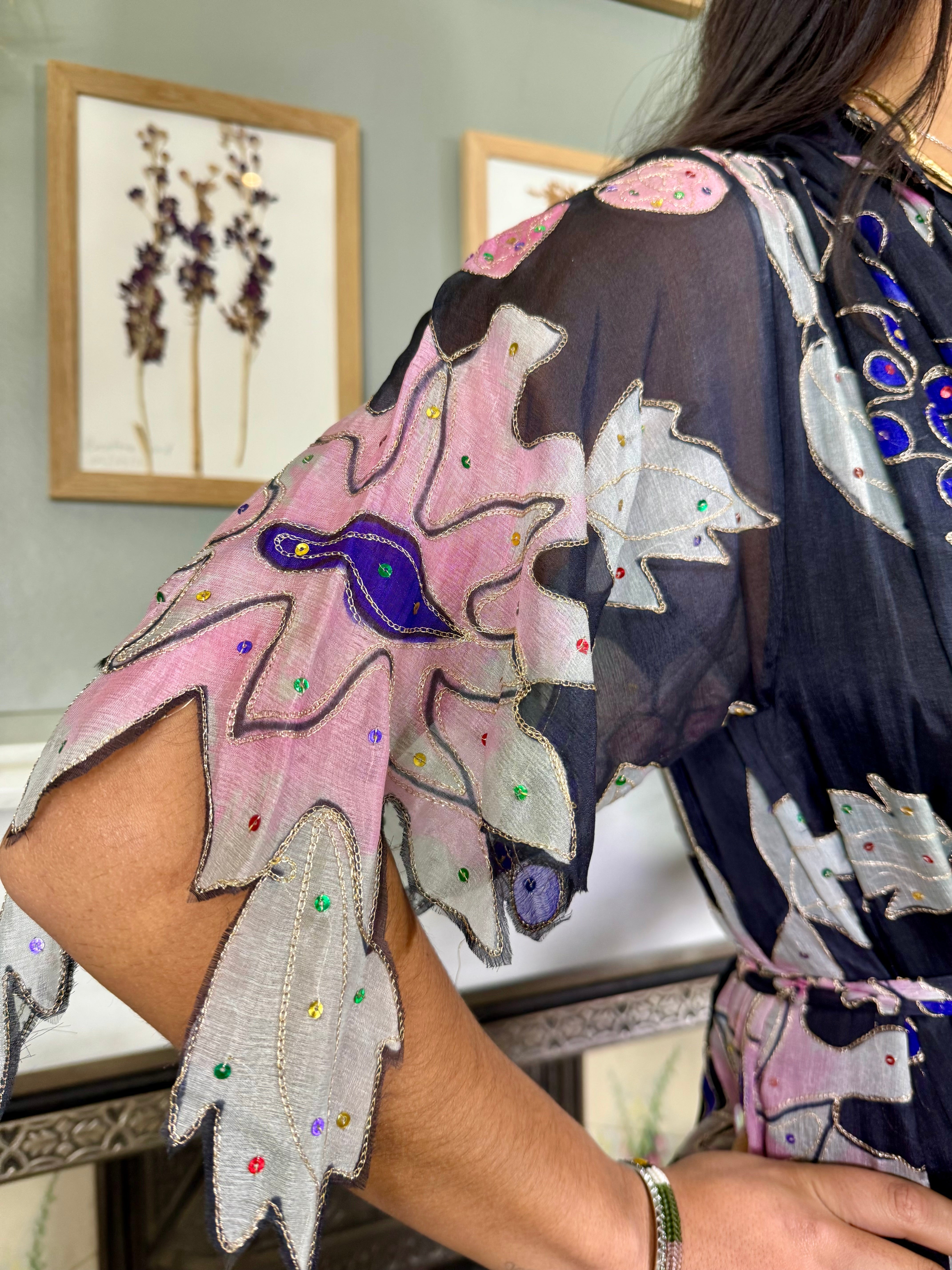 Gorgeous and unique hand painted chiffon 70s dress with pretty floral detailing adorned with tiny sequins and gold thread. Has cut out sleeves, a front V neckline with buttons and an A line silhouette. Comes fully lined and with a matching tie belt. Looks fab just slipped on with sandals.