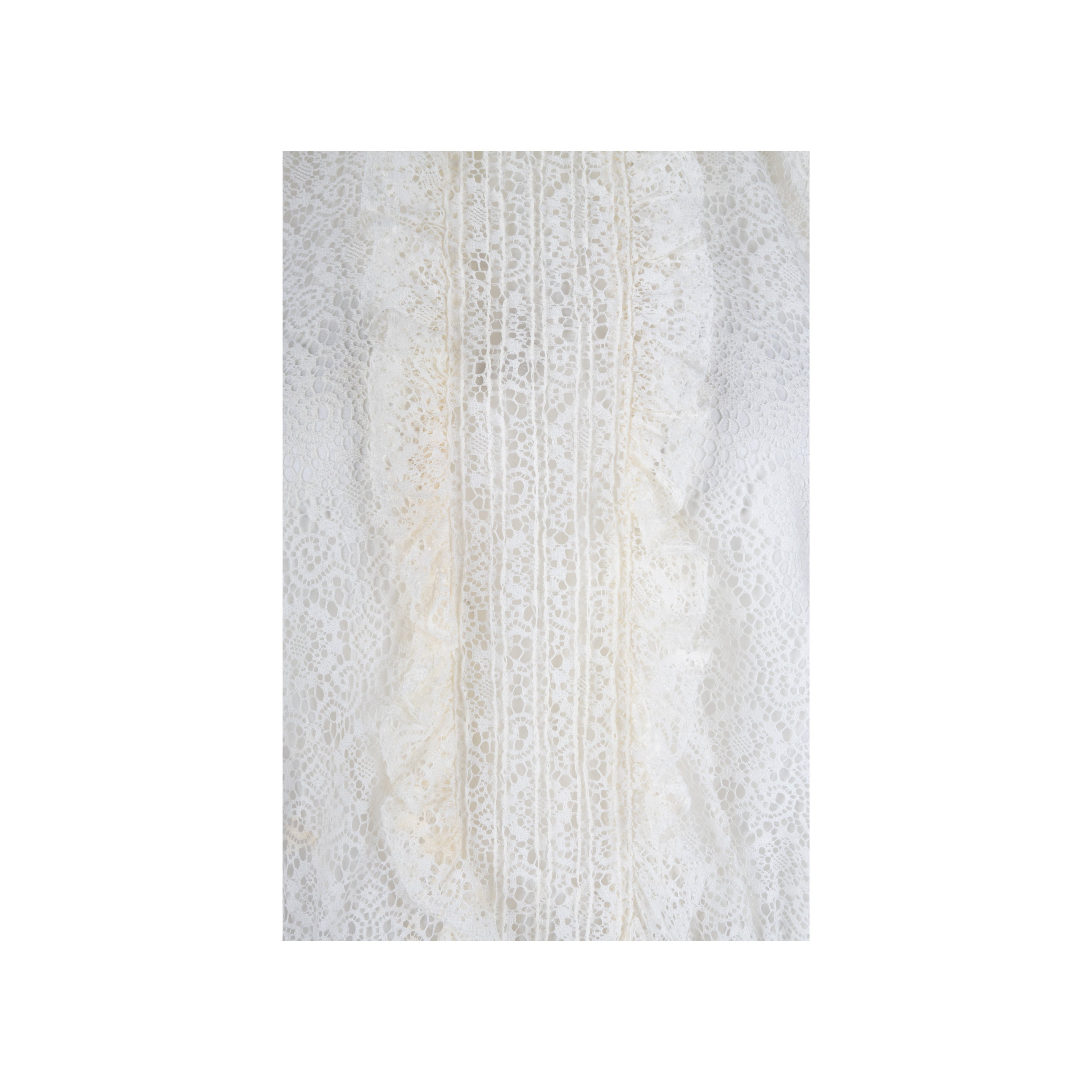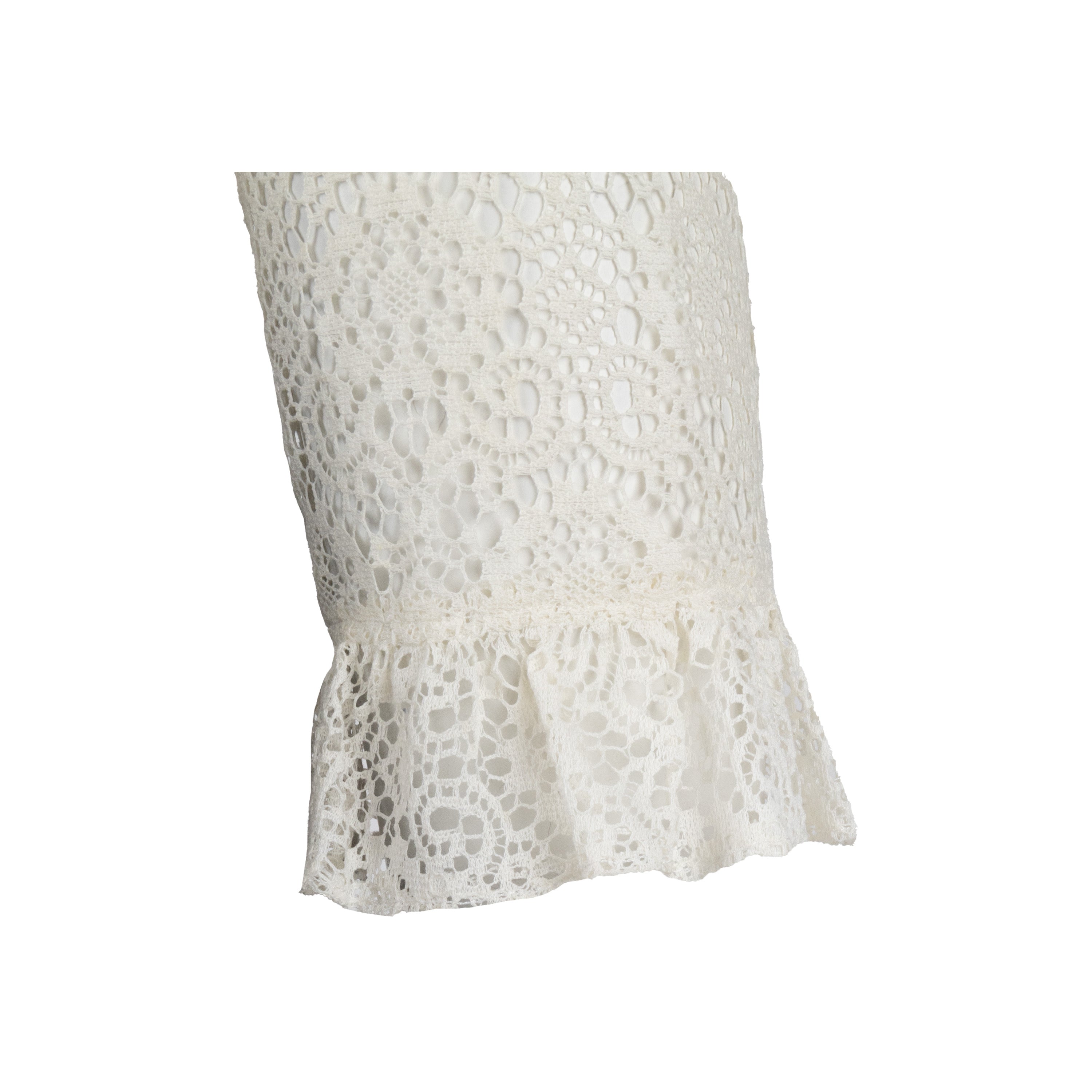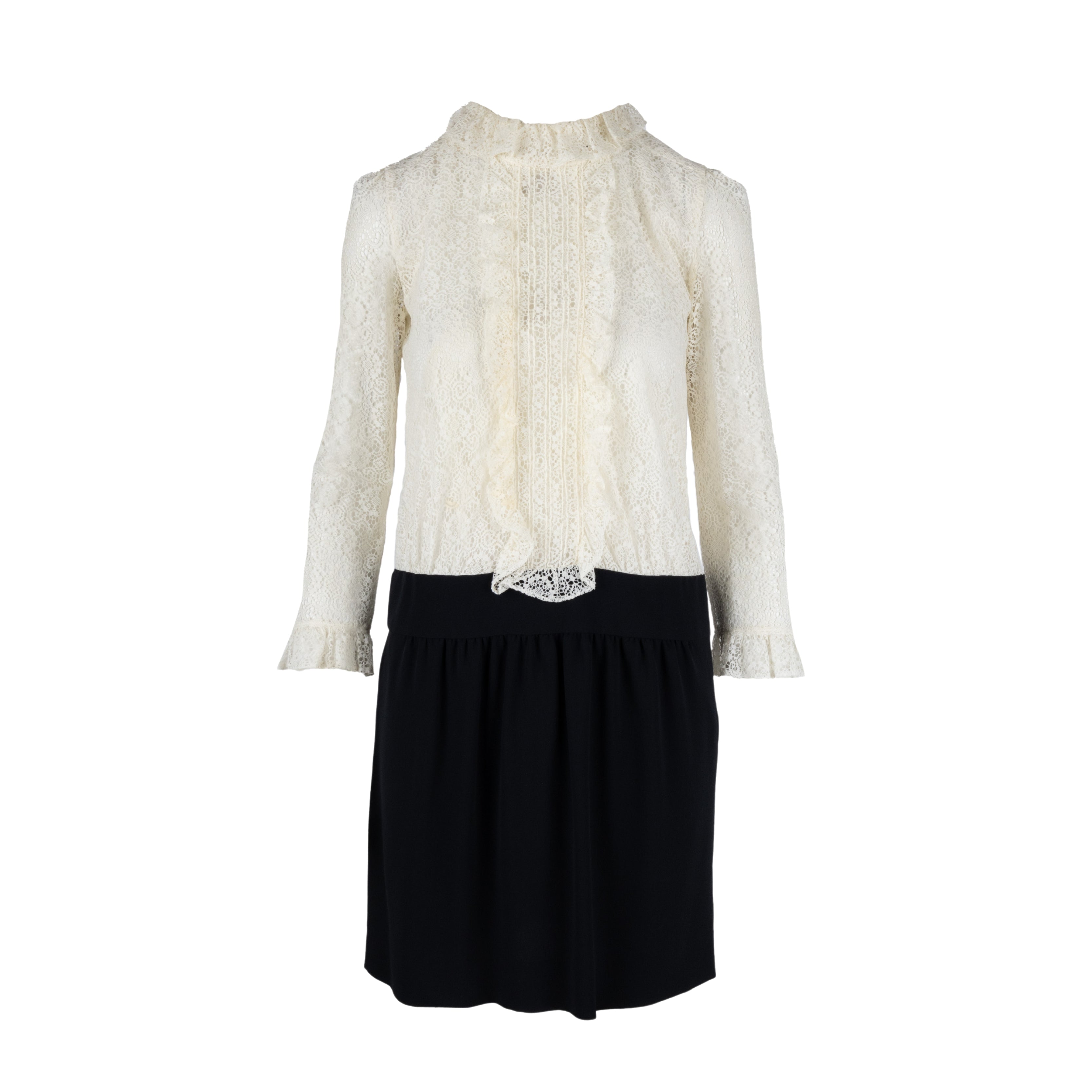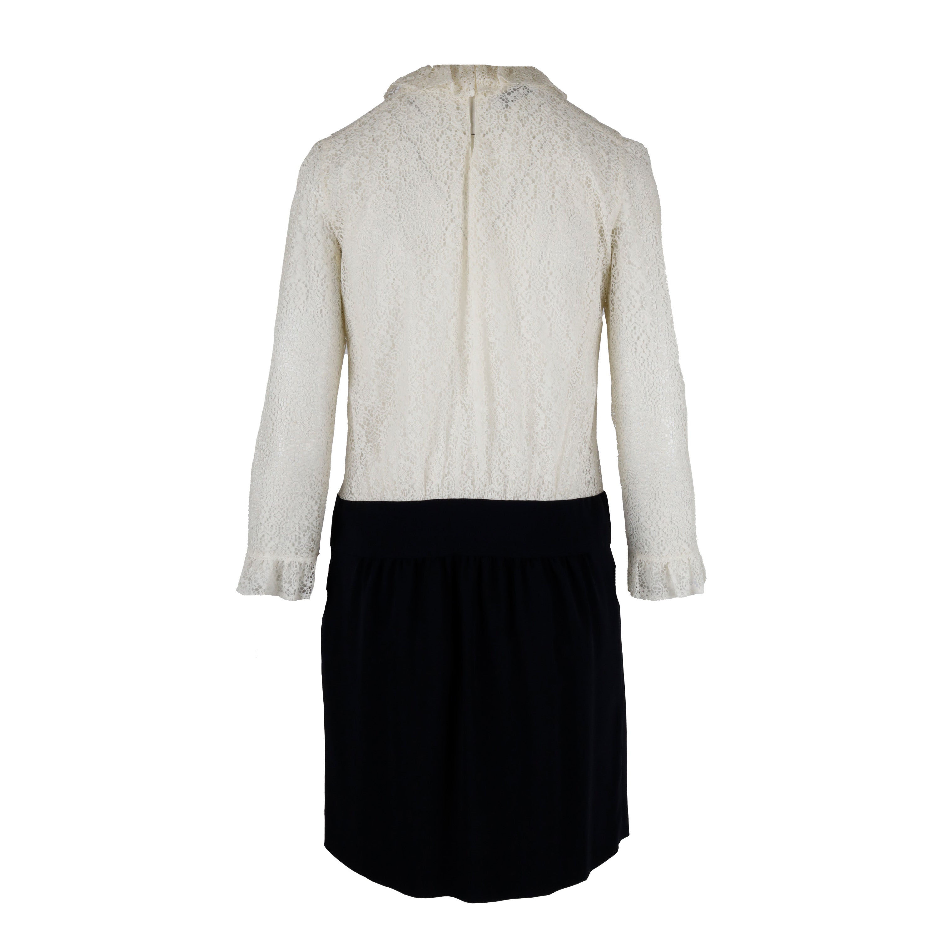 Crafted with cream lace and silk-crepe, this Moschino dress features a ruffled neckline, gathered waist, and a hook-fastening keyhole at the back. With a flattering fit and elegant two-tone design, this dress is perfect for any formal occasion.
