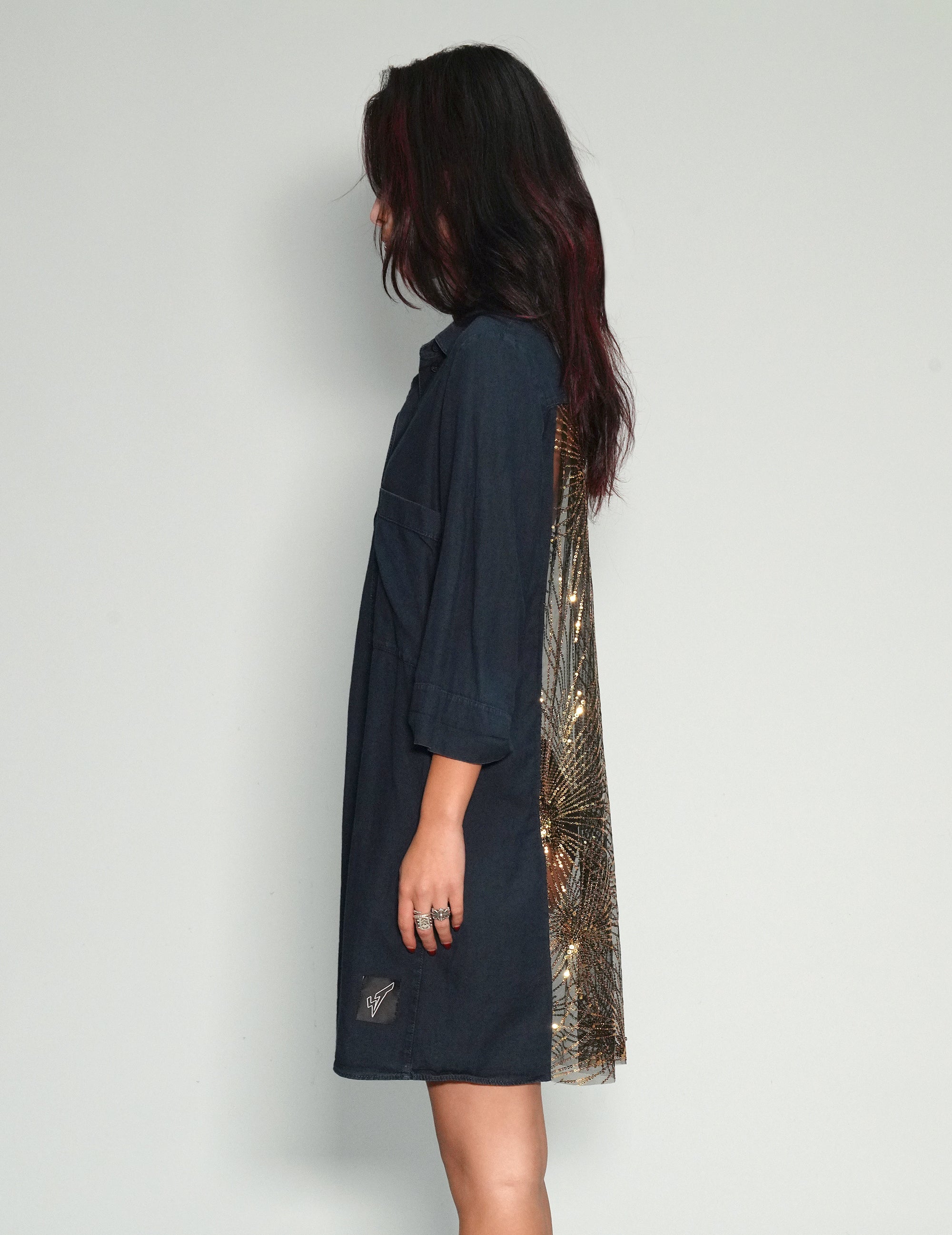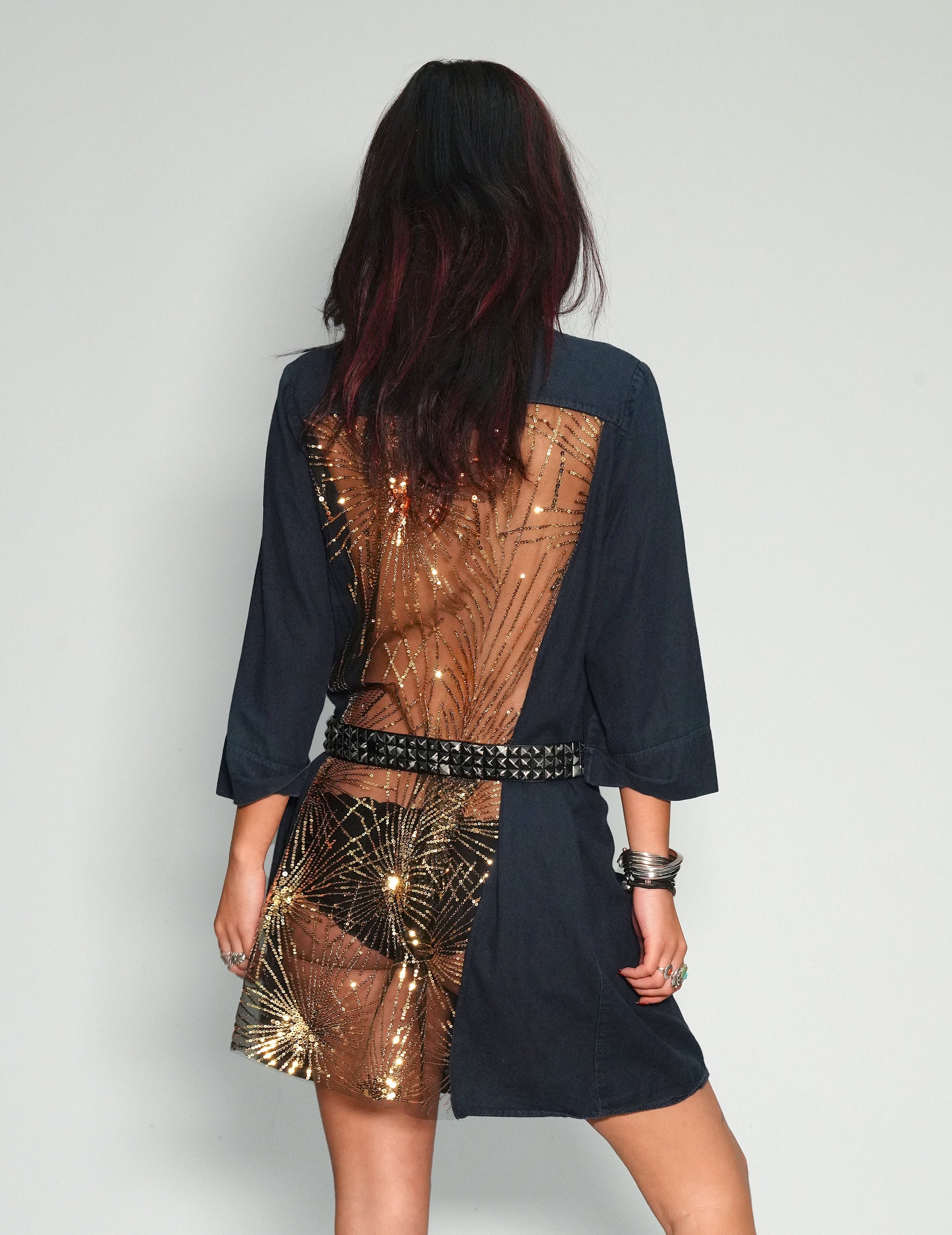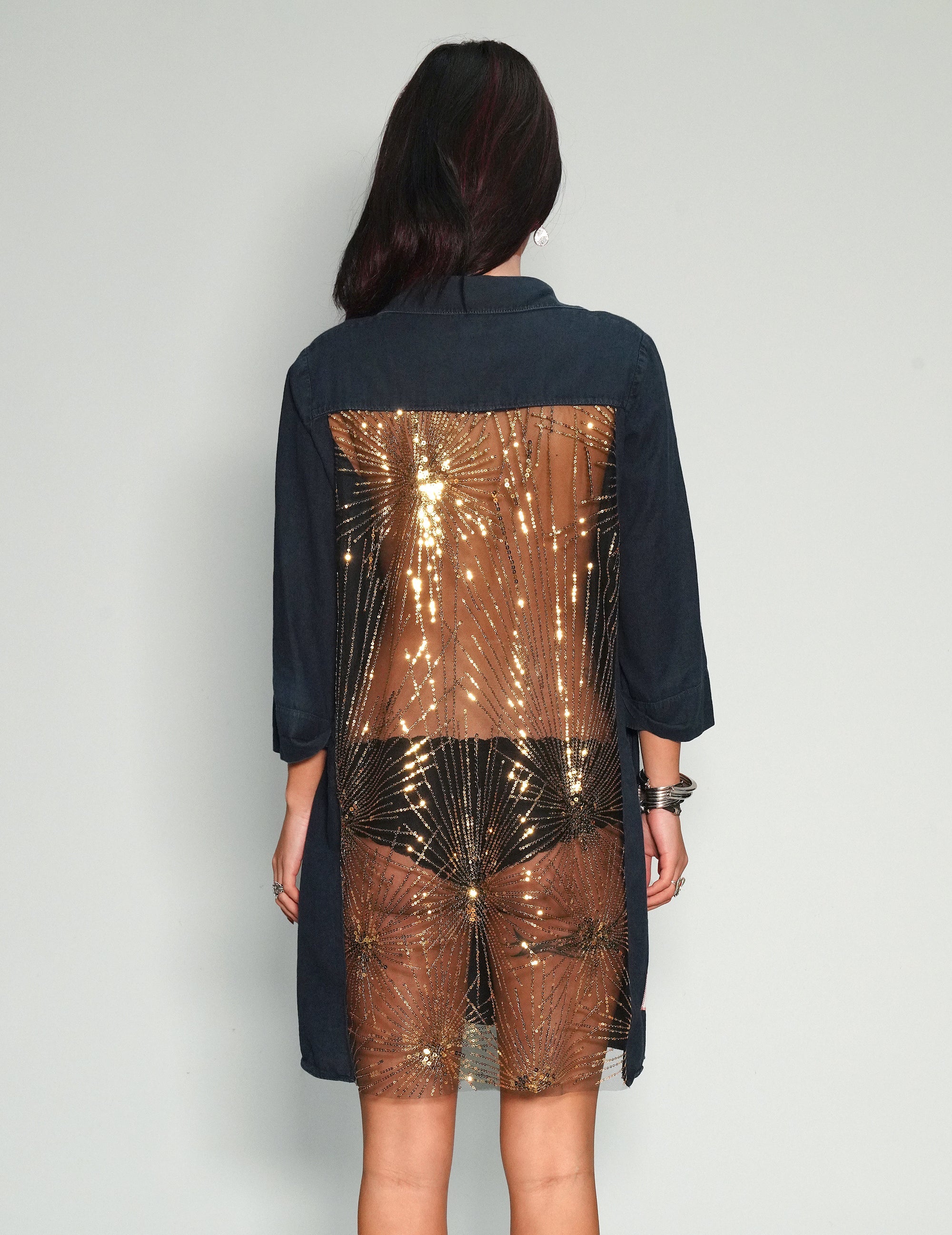 Women's navy shirt dress, customised with gold sequin, art-deco style sheer back panel.