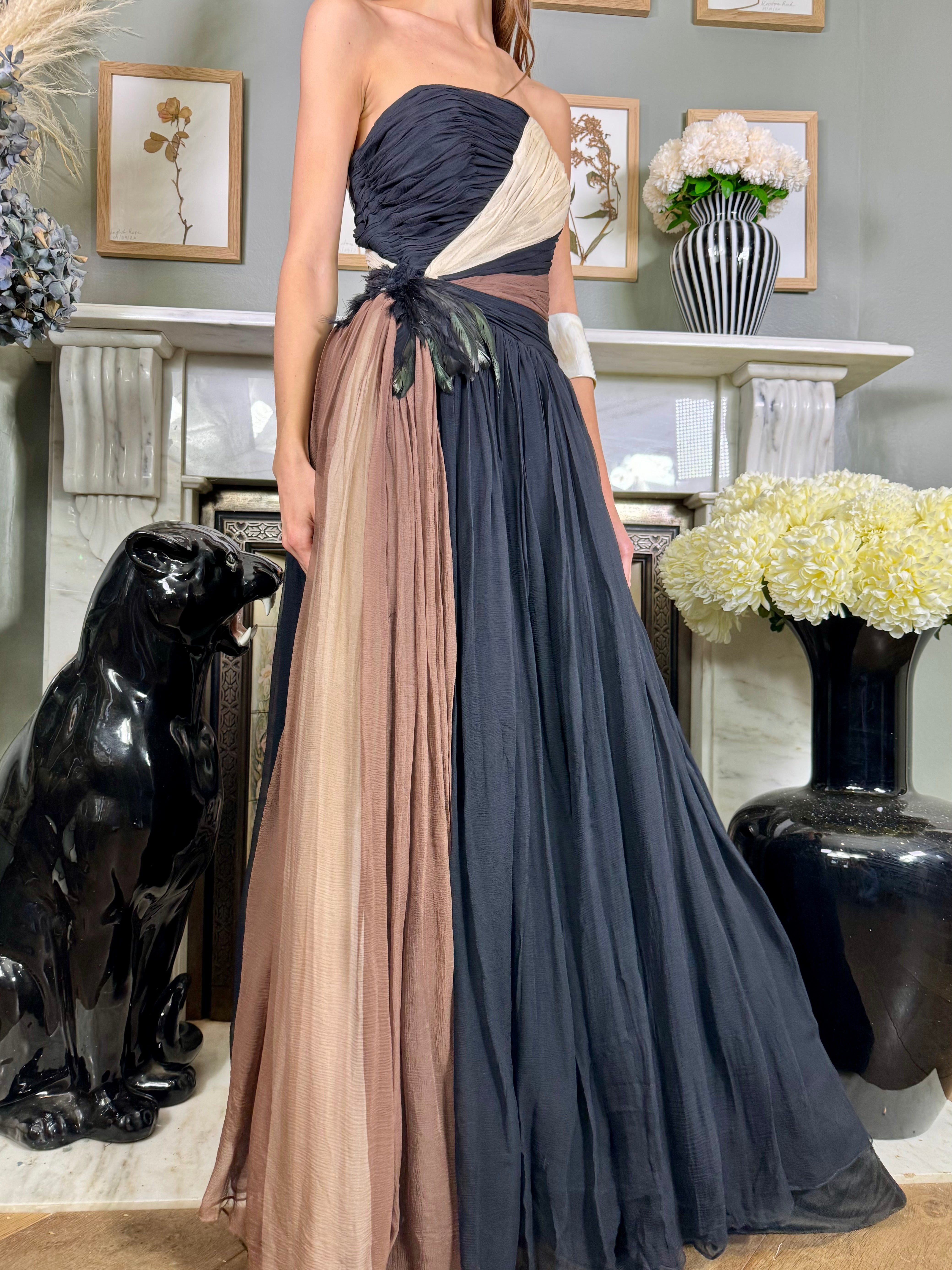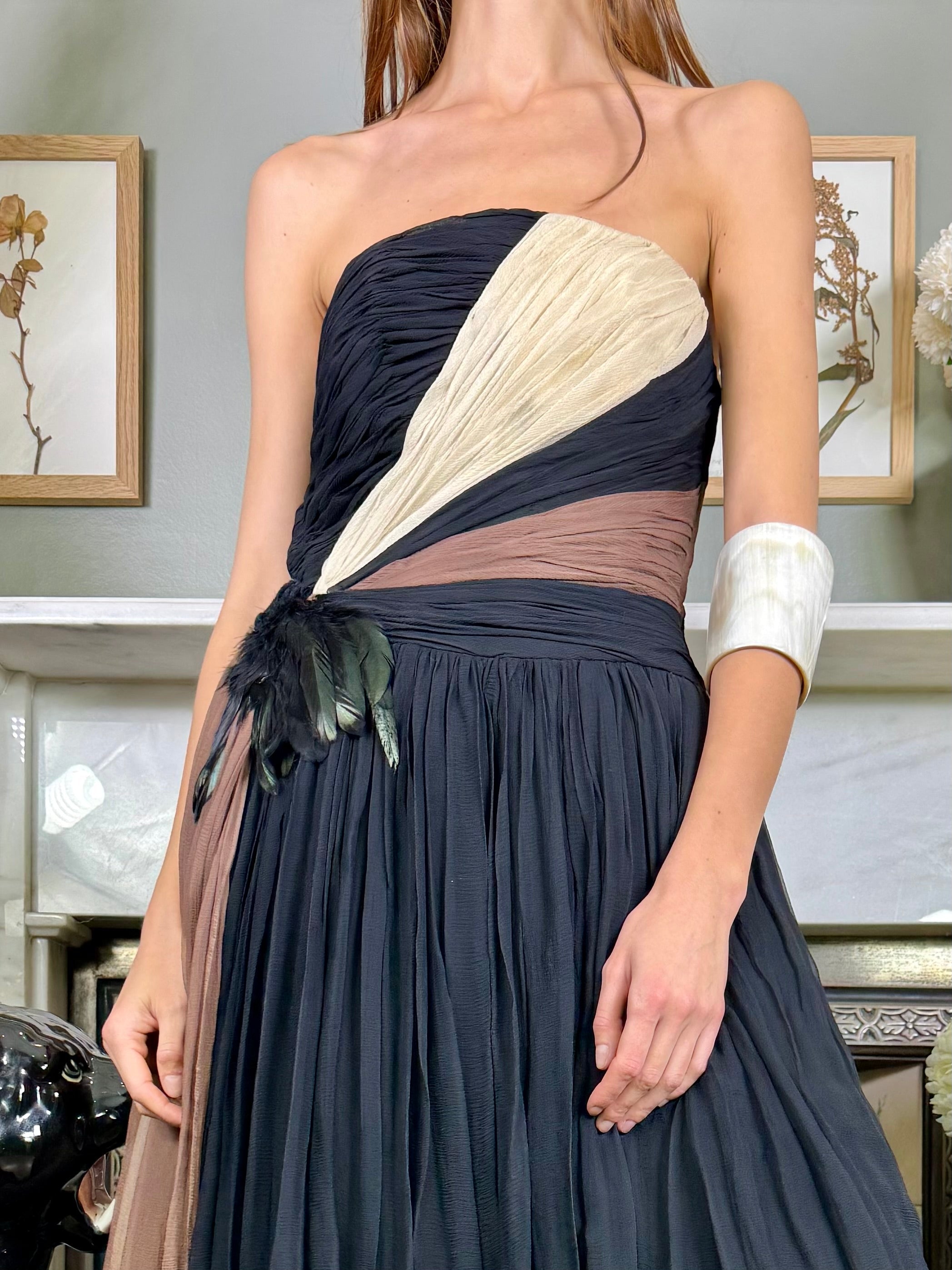Absolutely incredible 40s bustier gown. Has a pleated design on the bust in cream, brown and black that gathers non the side and drapes to the floor. Has layers of chiffon and a feather motif on the waist. Fully lined and in very good condition. A dream gown.