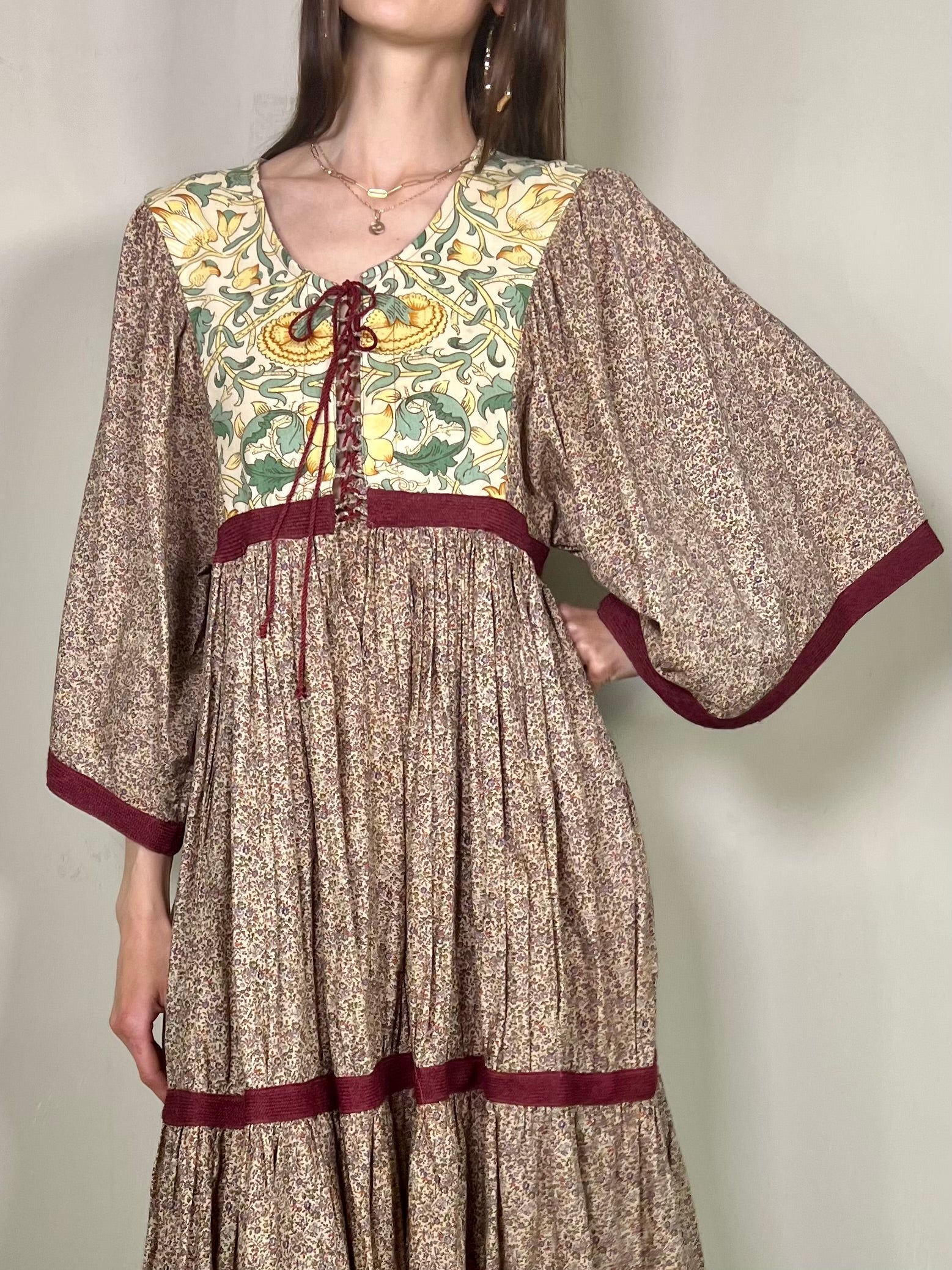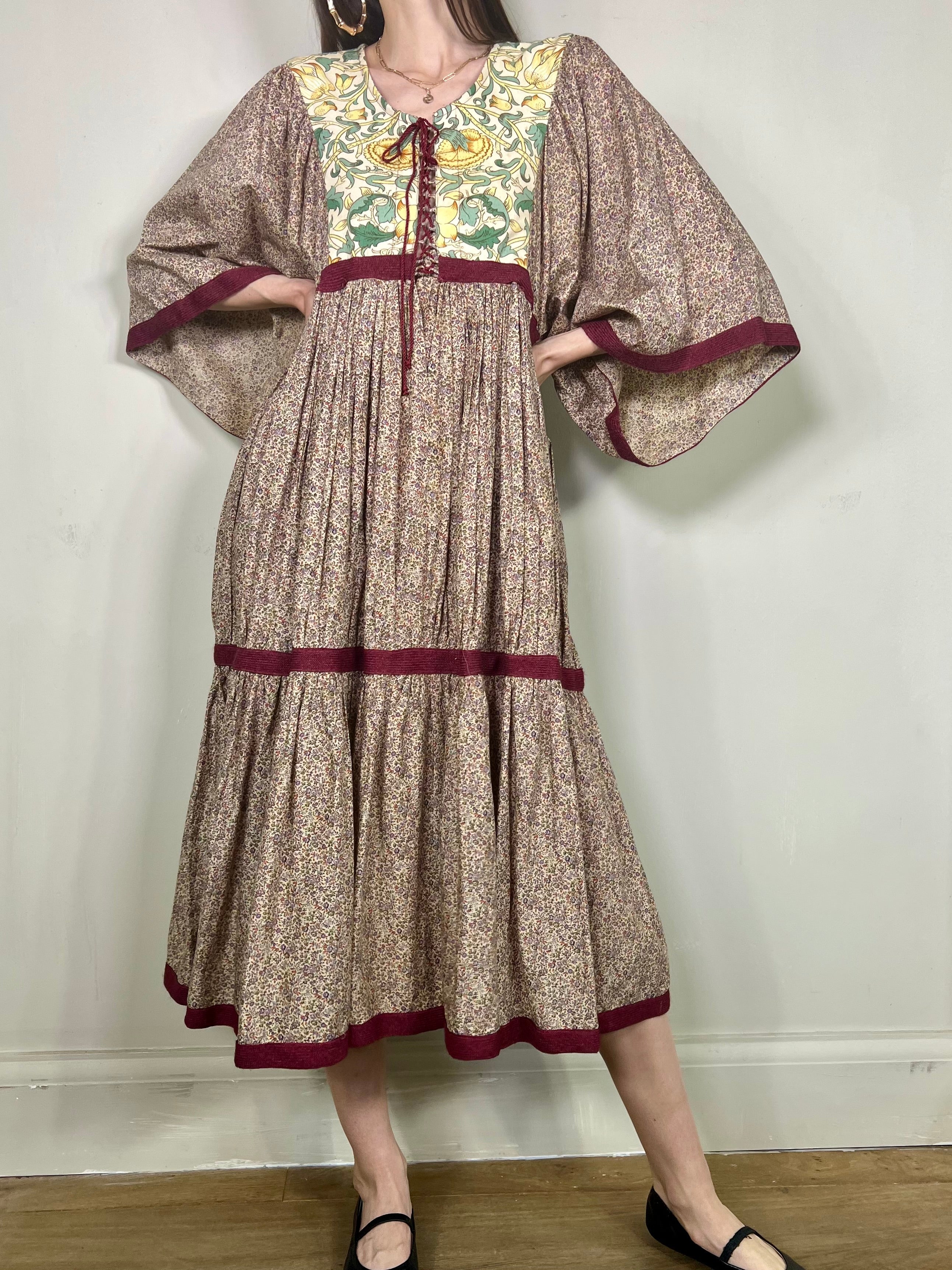 Gorgeous cotton vintage dress in a blue and rust micro floral, tiered silhouette. Has a round neck, a pretty contrasting yoke, wide sleeves and a lace up detail in the front. Slips on with no fastening and floats beautifully.