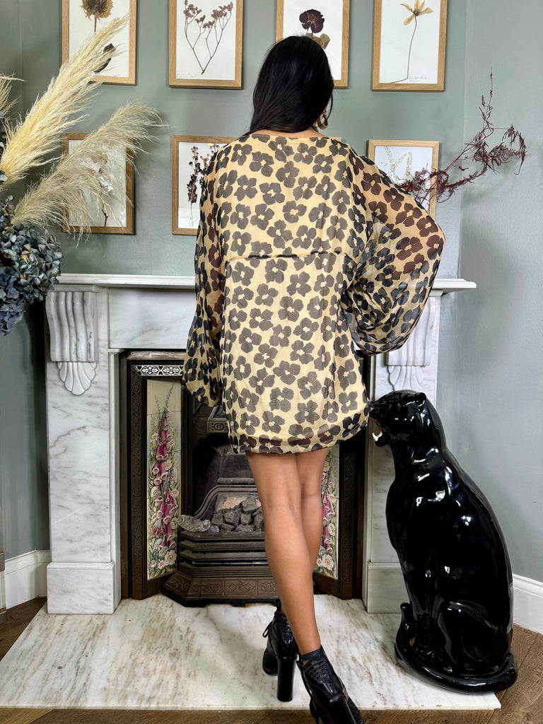 Gorgeous Y2K Dries Van Noten shift silk chiffon dress in a cream and black floral print. Has a roundneclkine, a straight fit and billowy oversized sleeves. Just slips on with no closure and is fully lined. Pair it with boots or tights!