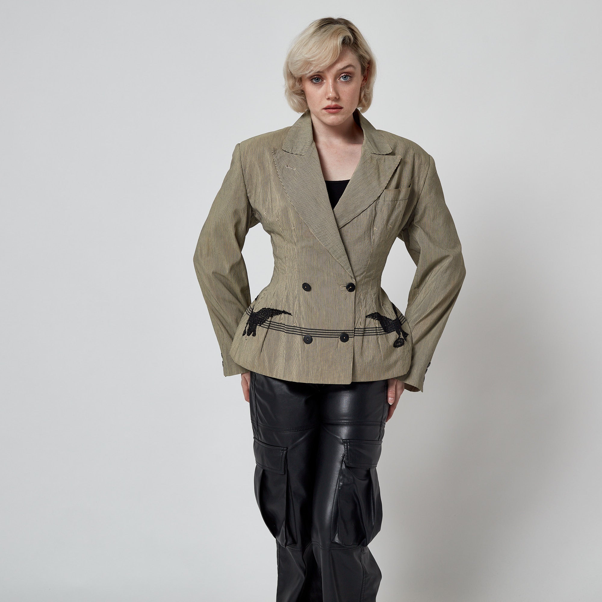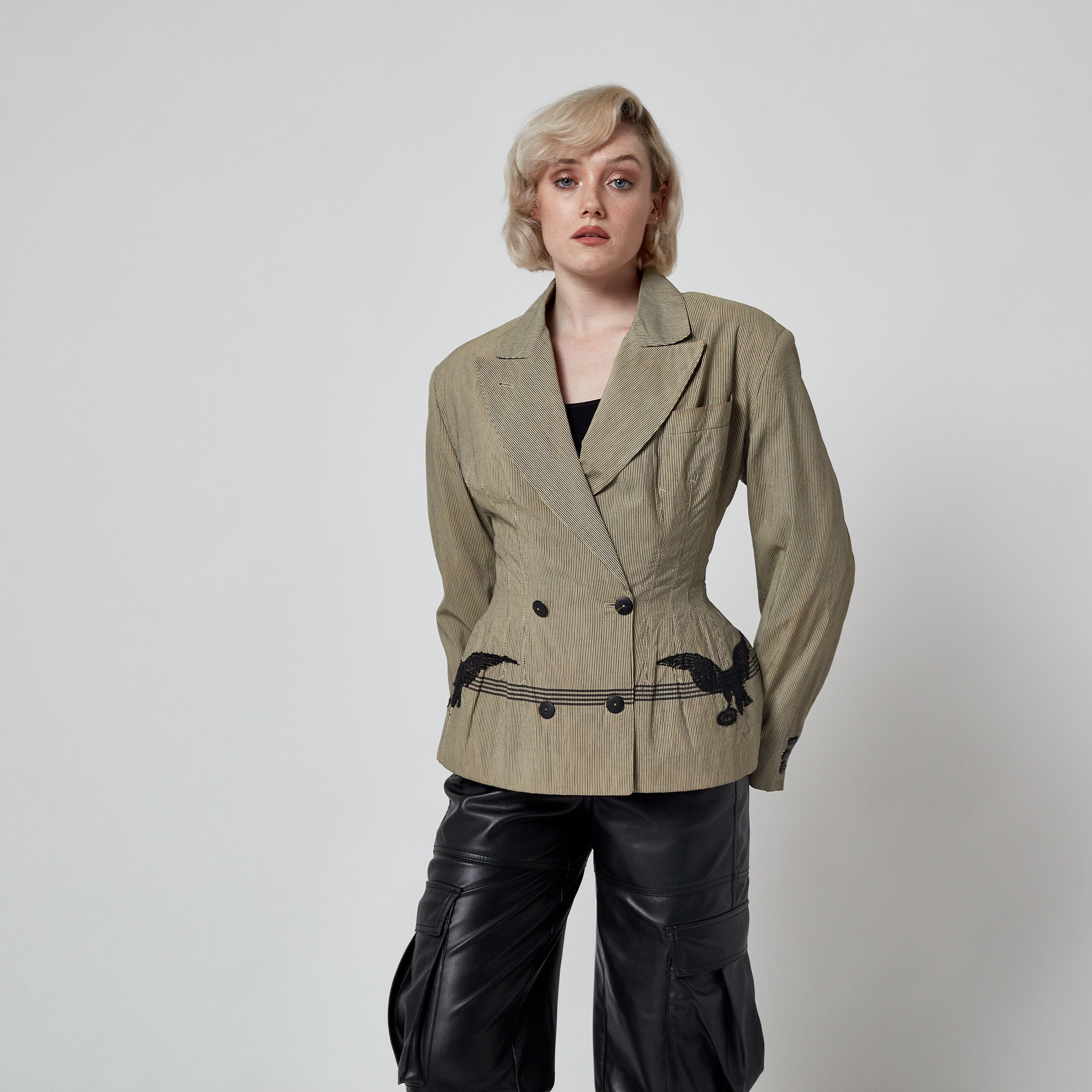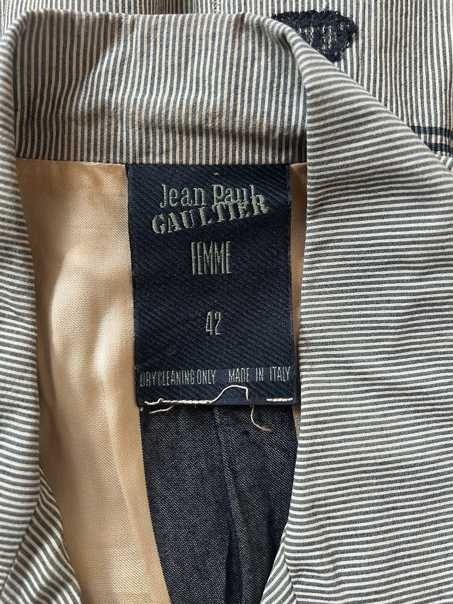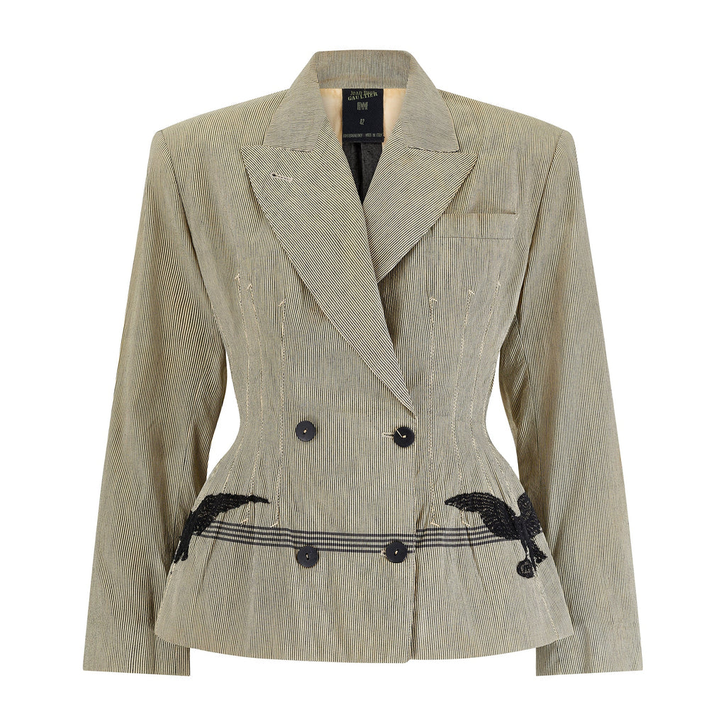This Jean Paul Gaultier jacket dates is from the ‘La Concierge Est Dans L'Escalier/The Modern Retros’ collection, Spring-Summer 1988 and we have included a recent editorial shot of the fabulous Dame Helen Mirren modeleling the full ensemble. It is tailored from dark grey and cream striped cotton to the label's trademark nipped-in waist and wide-lapel silhouette. It has a double-breasted front, playing to the brand's love of nautical detailing. It is the lace appliqué that really sets this piece apart. Three flying eagles adorn the front and rear, carrying medallions emblazoned with 'JPG'. Three black polished buttons secure the cuffs. The label reads 'Jean Paul Gaultier Femme' and is lined with dark-grey and champagne striped cloth.