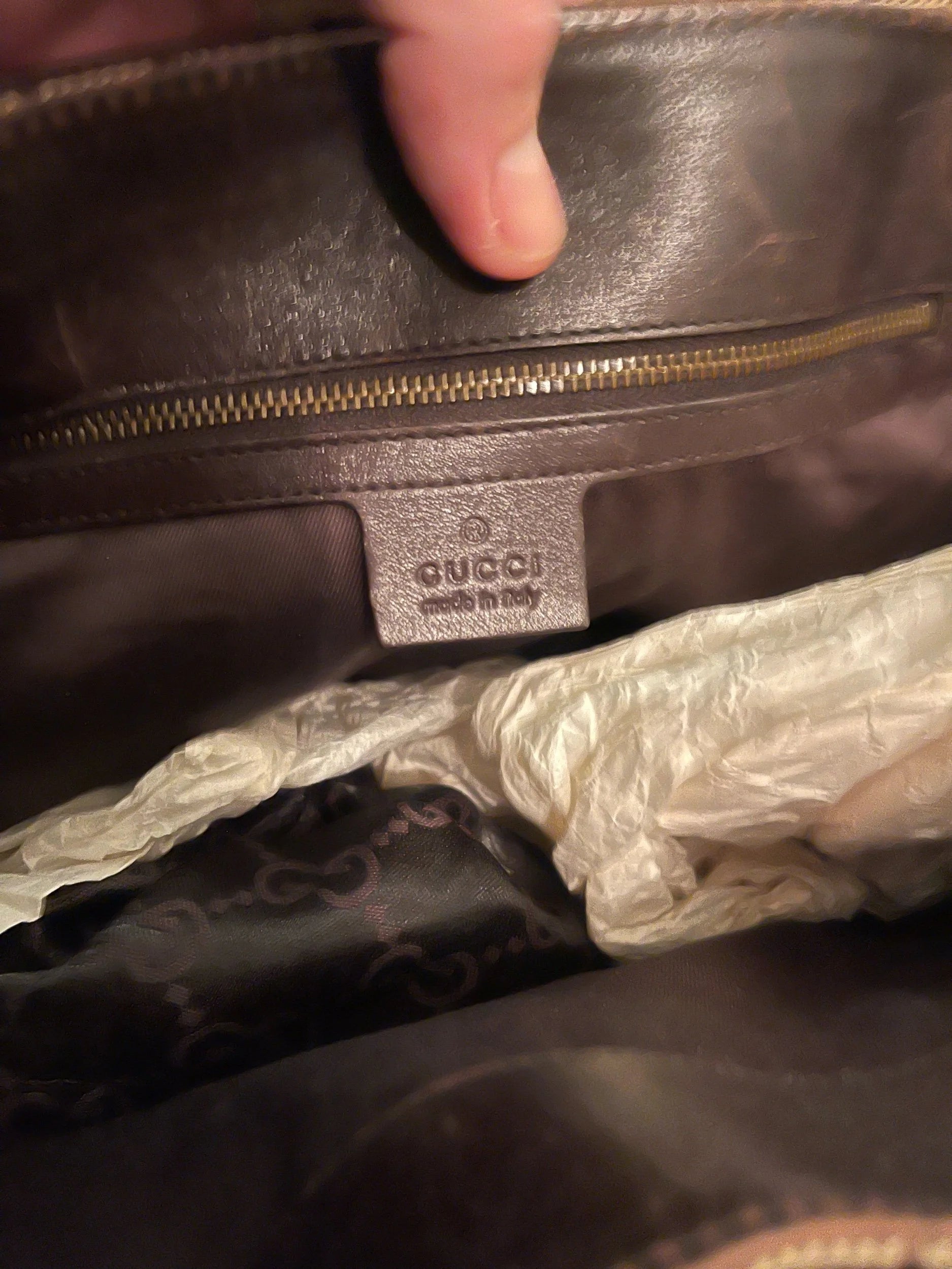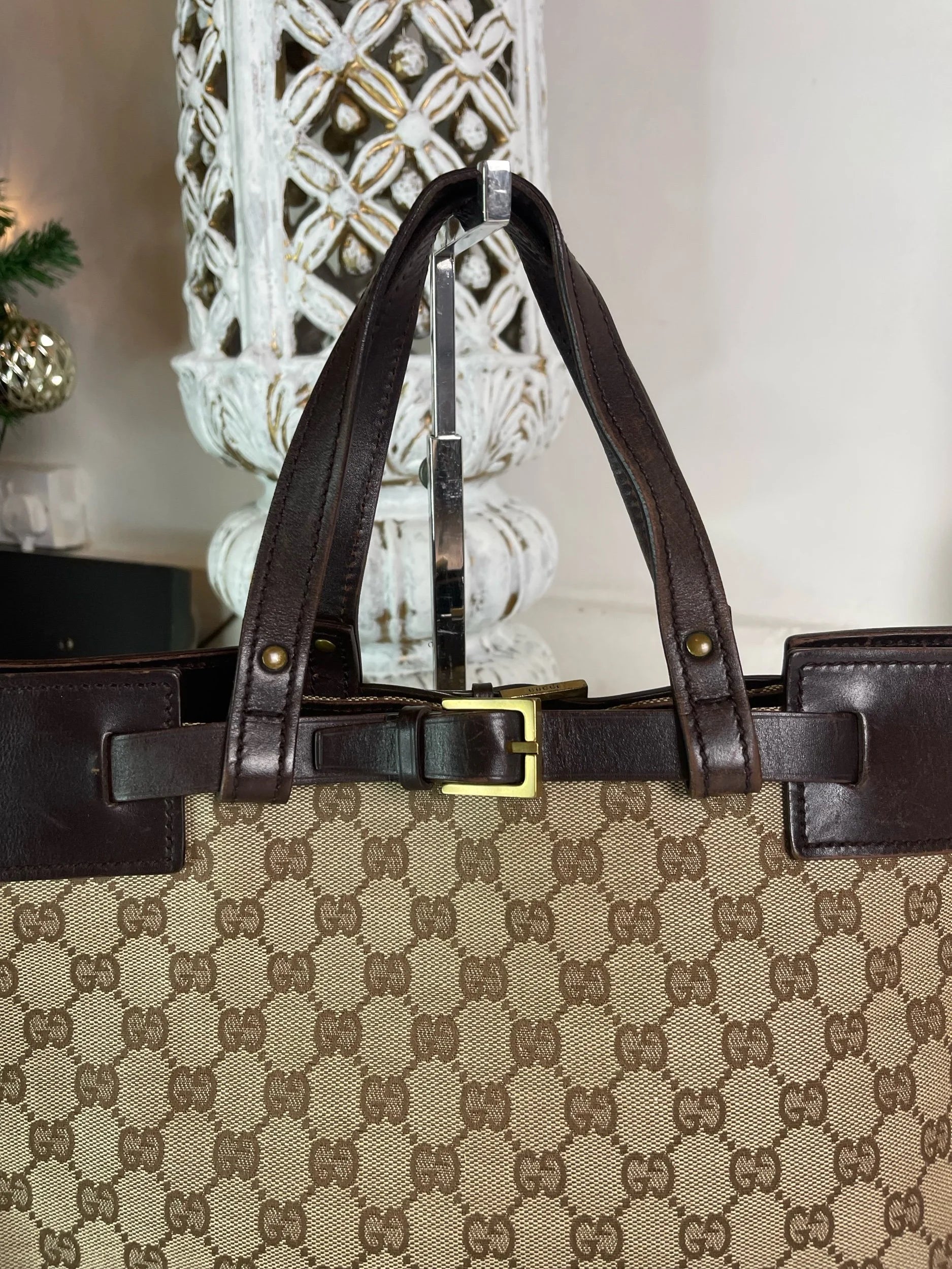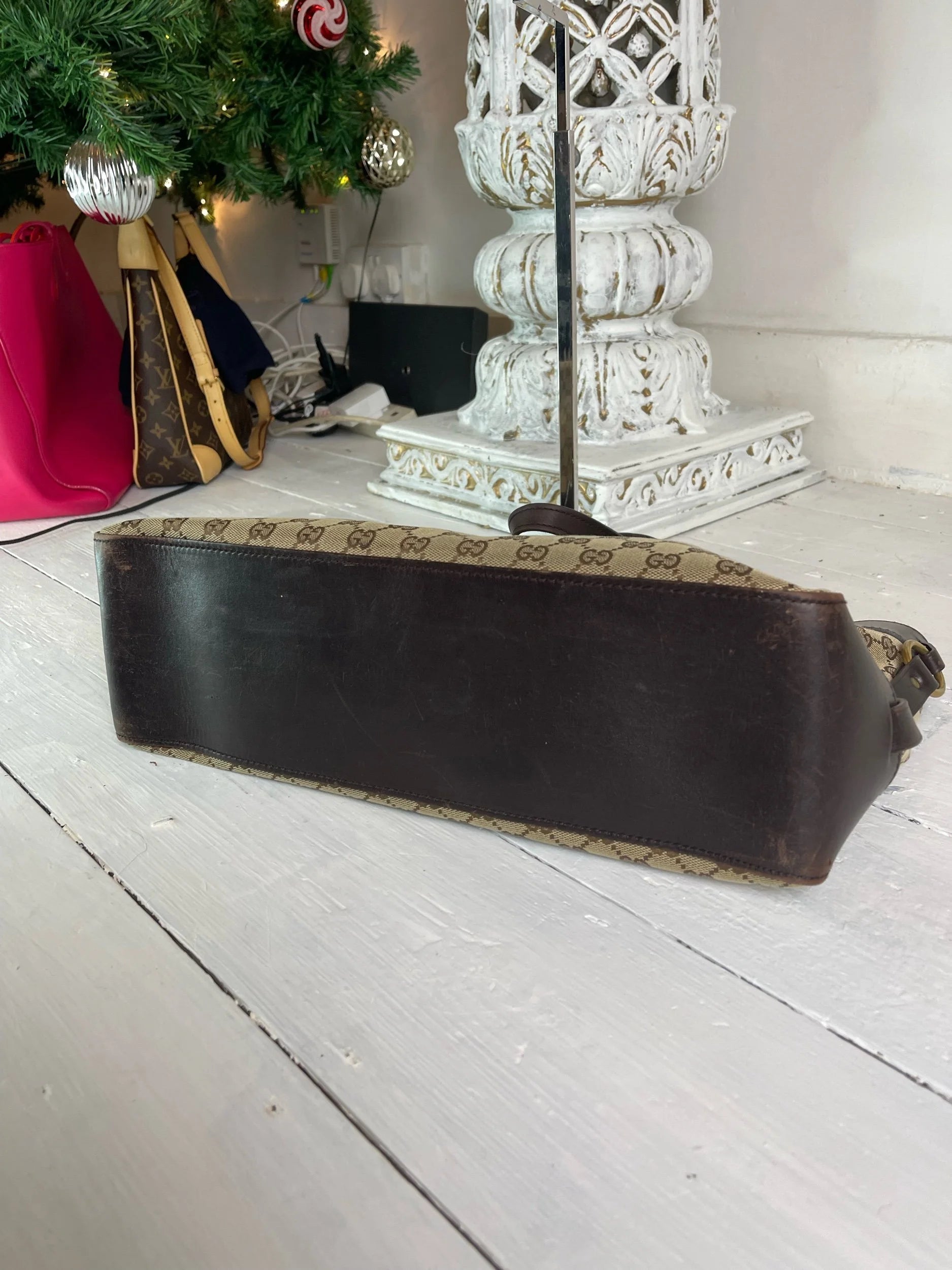• Classic Gucci GG monogram canvas with rich dark brown leather trim and base