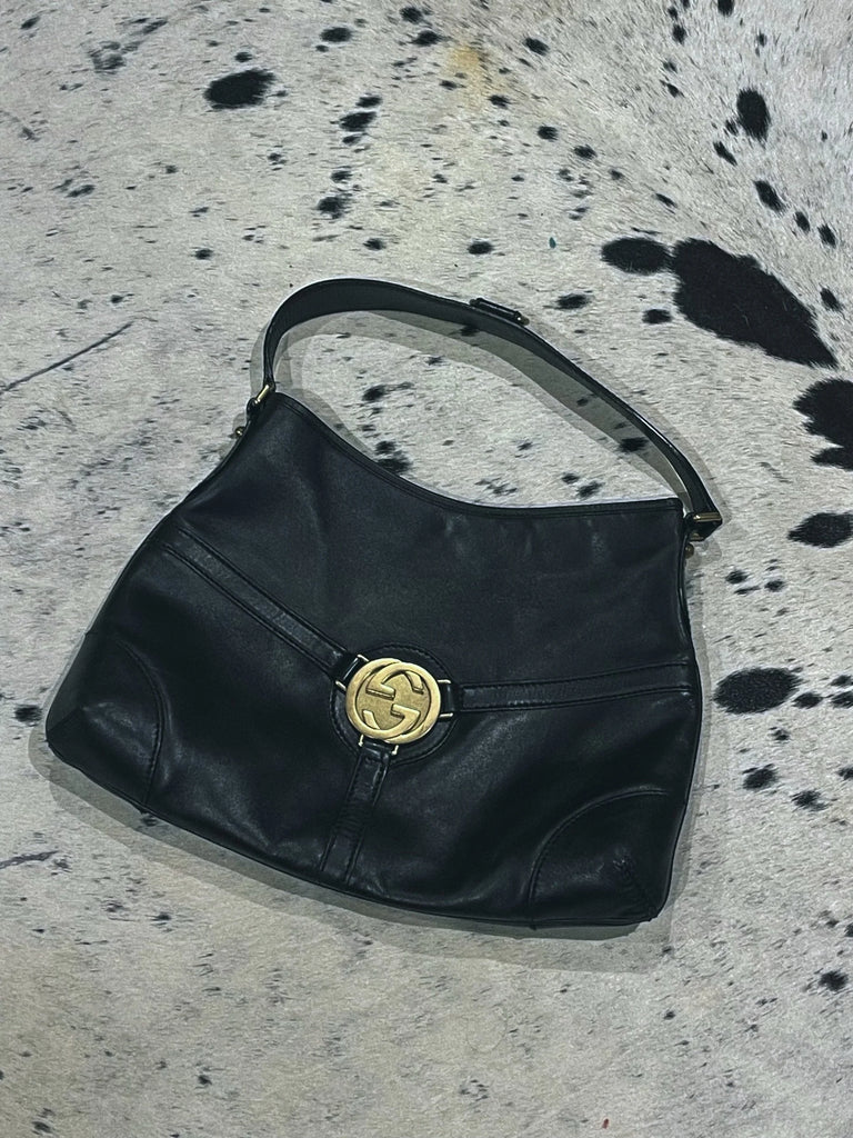 Crafted from buttery black leather, this bag features Gucci’s signature curved hobo silhouette with a sleek piston clasp closure. The front is adorned with a gold-toned interlocking GG emblem, adding a bold yet timeless statement of luxury. Inside, you’ll find a sumptuous suede lining and just enough space for your essentials — a perfect mix of practicality and allure.