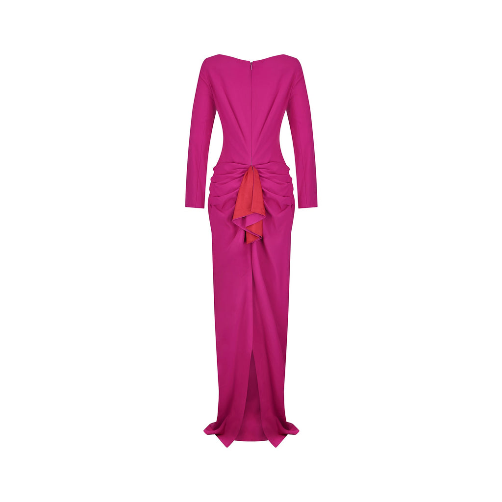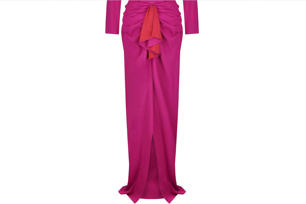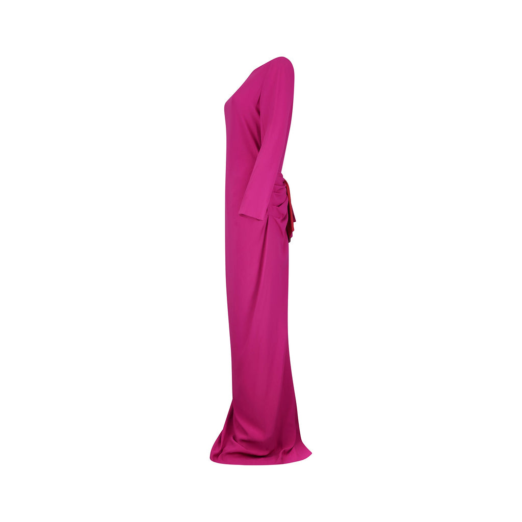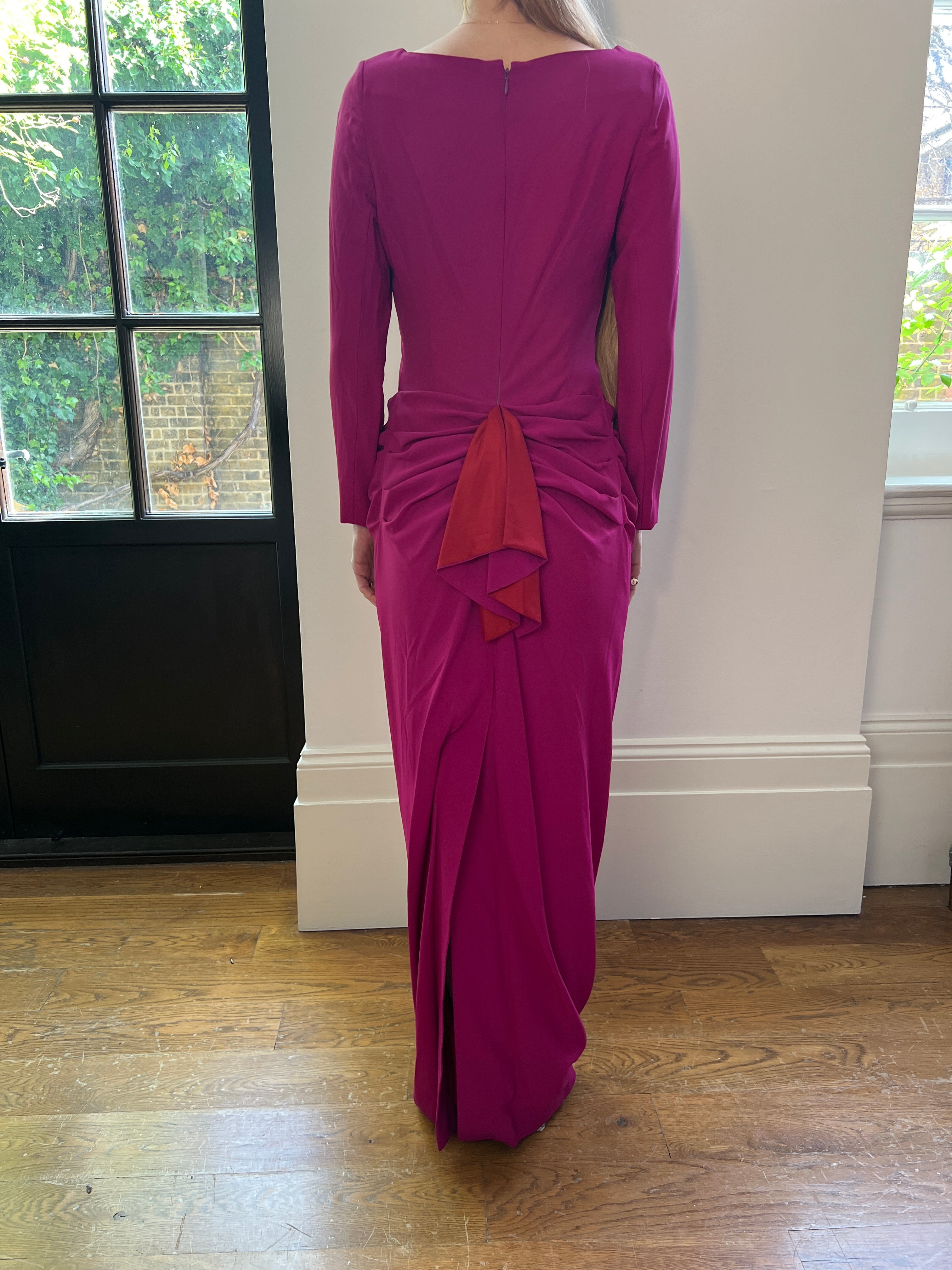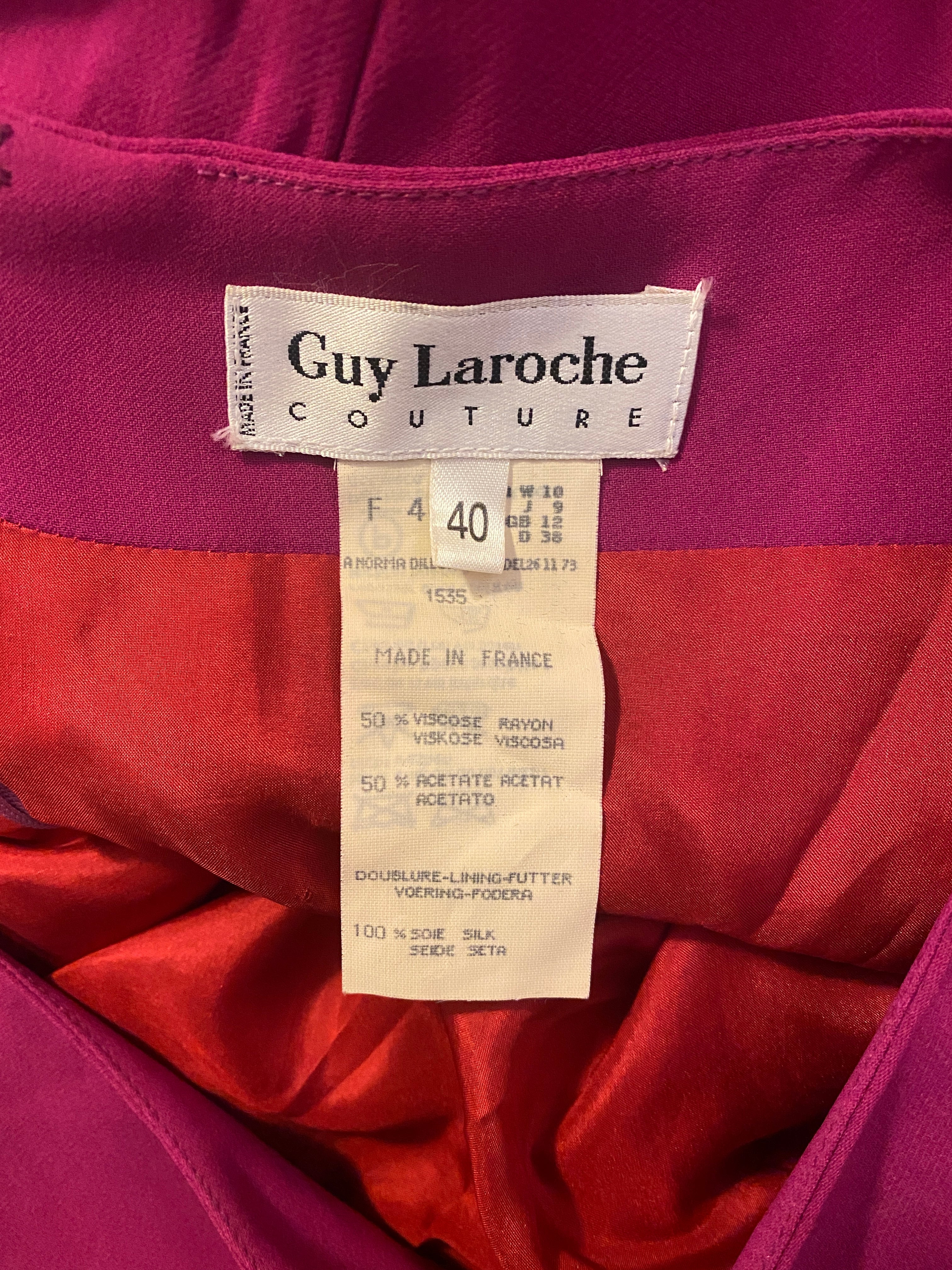 Exceptional Guy Laroche couture colour block evening gown which dates to between 1985 and 1991 and was most likely designed by Laroche himself prior to his death in 1989. Cut from a soft silk crepe fabric, it has a wide boat neck and long sleeves, with lovely shaping to the bodice to create a flattering shape. It is lined in a warm, almost terracotta red viscose blend, and fastens with a concealed zip running all the way down the back, finished off with a hook and eye closure. The lower back and bottom area is heavily gathered and features a large bow detail, with contrasting red silk to the underside. At the hem the dress has a rear split for ease of movement, and drapes beautifully to floor length.