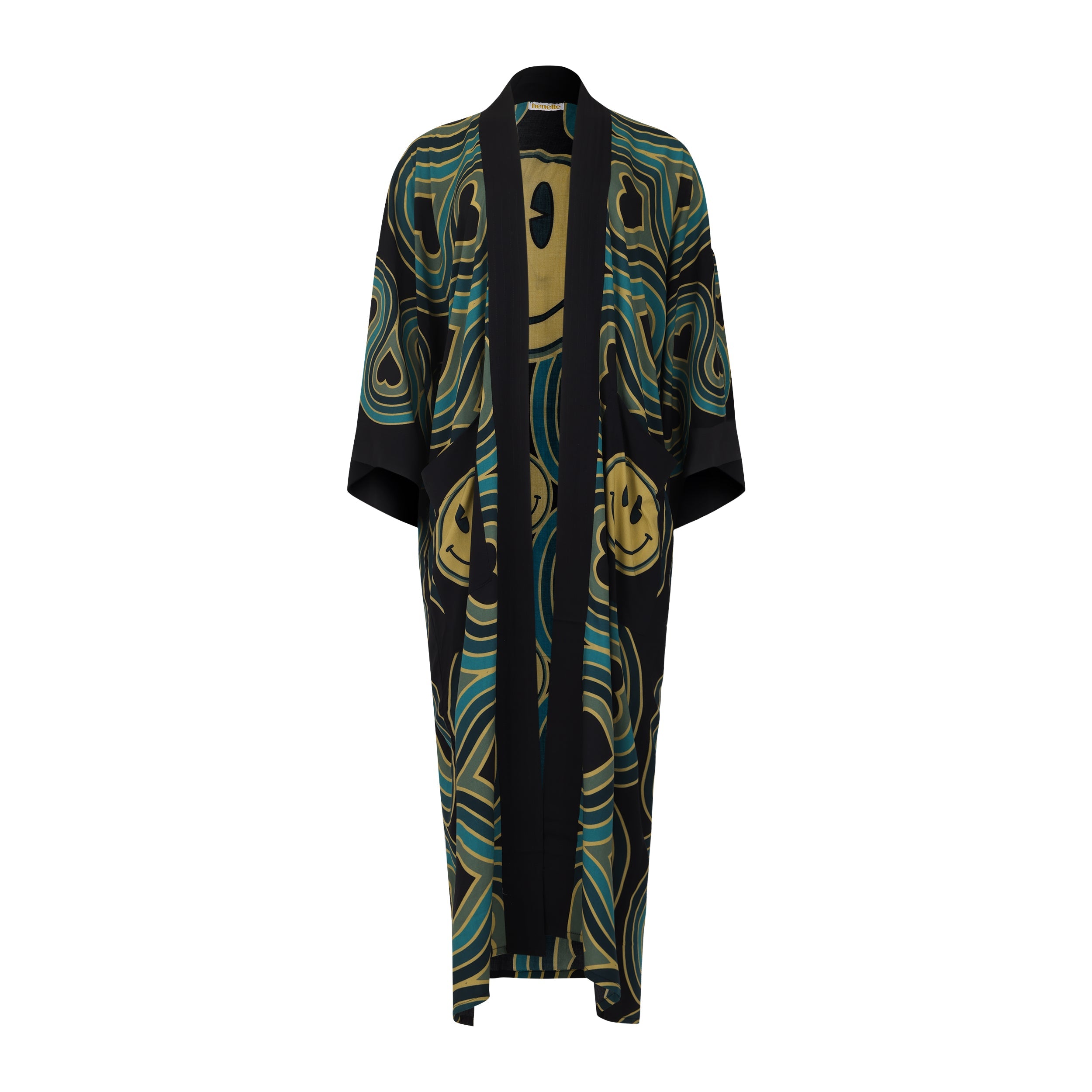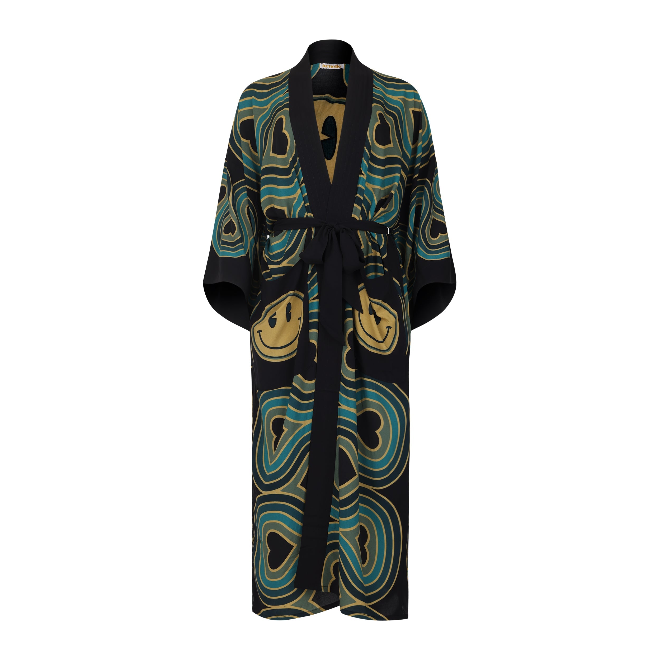 Step into retro bliss with this 1970's inspired robe designed to radiate good vibes and effortless style. Featuring smiley faces and hearts set against groovy wavy lines straight out of the disco era. The bold, feel-good print captures the free-spirited energy of the 1970s, making it perfect for lounging, layering, or turning everyday moments into a fashion statement. The flowy lightweight fabric with wide sleeves and relaxed silhouette create an easy, flattering fit;  while the open-front design makes it versatile enough to wear at home, by the pool, or styled over your favorite outfit.