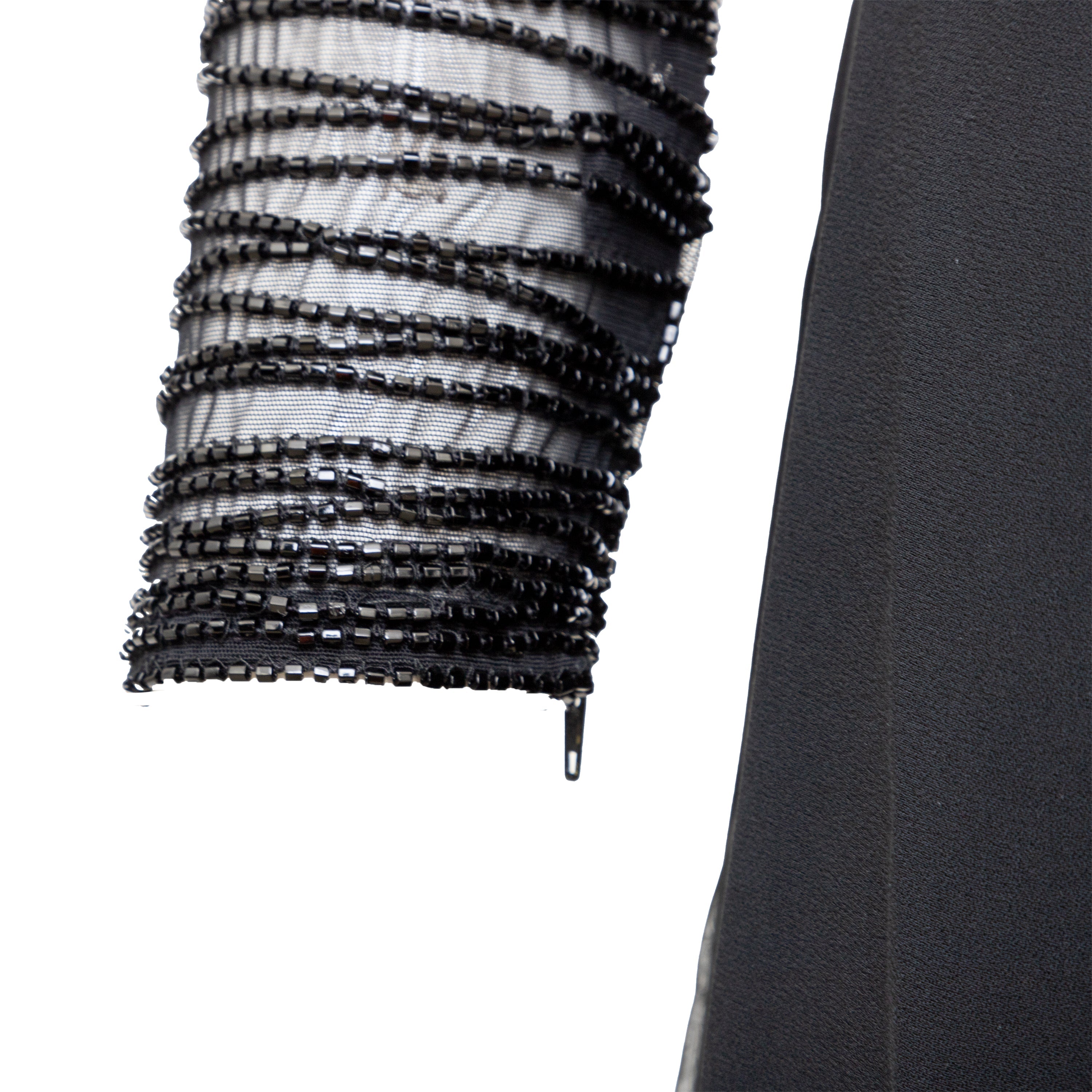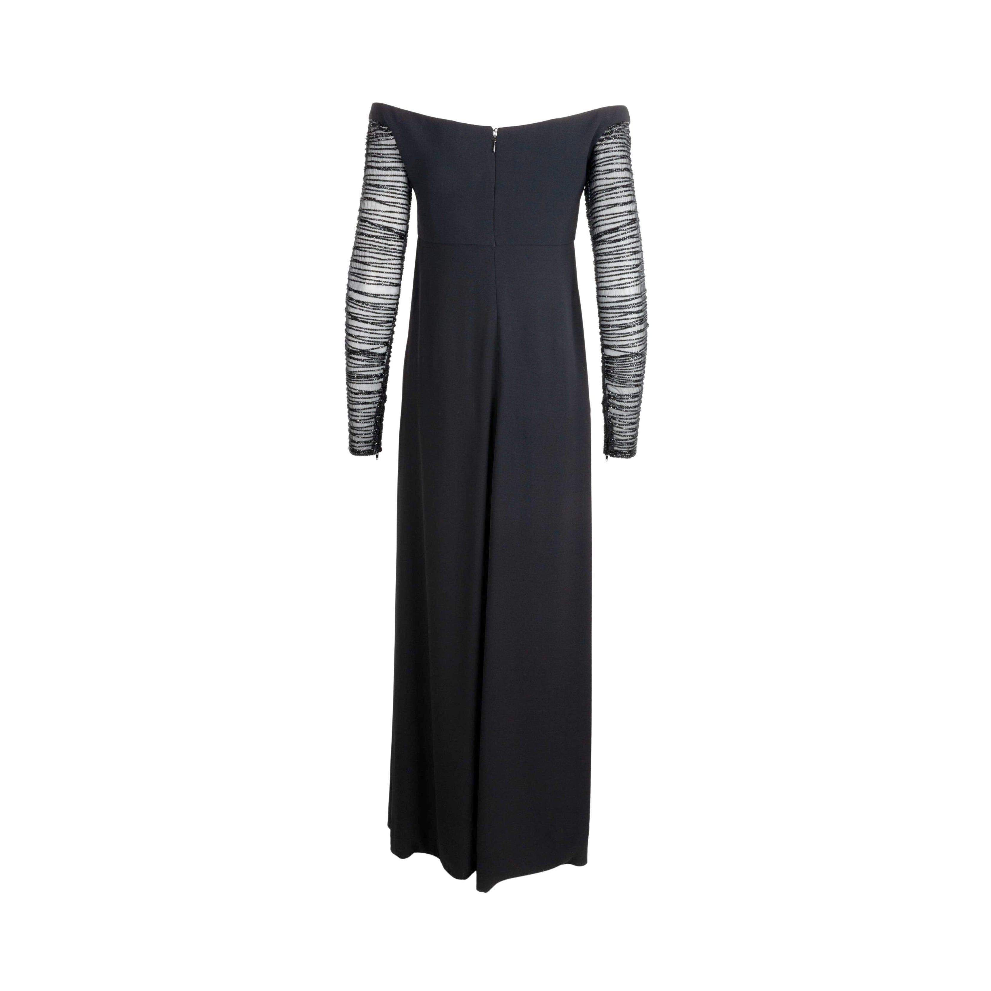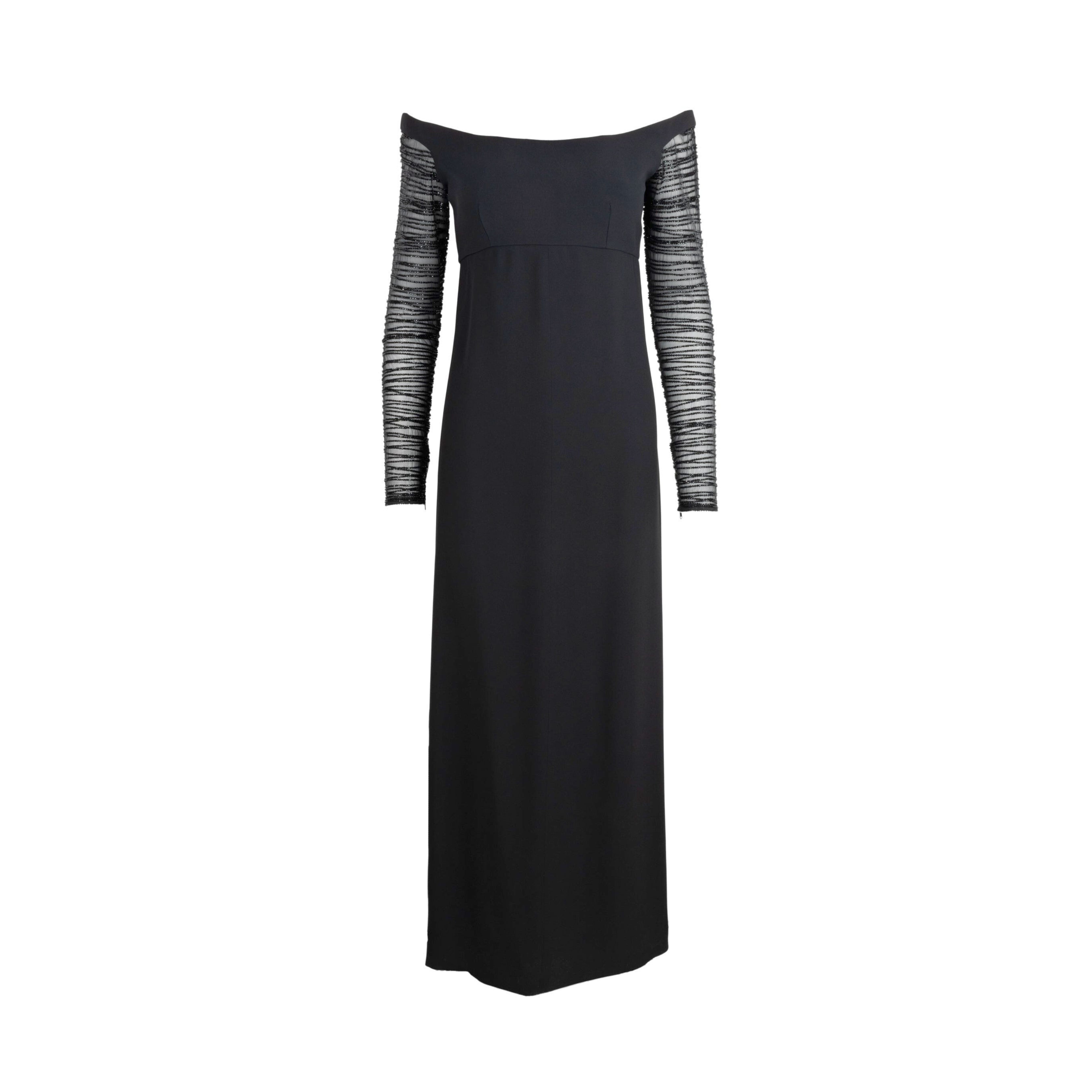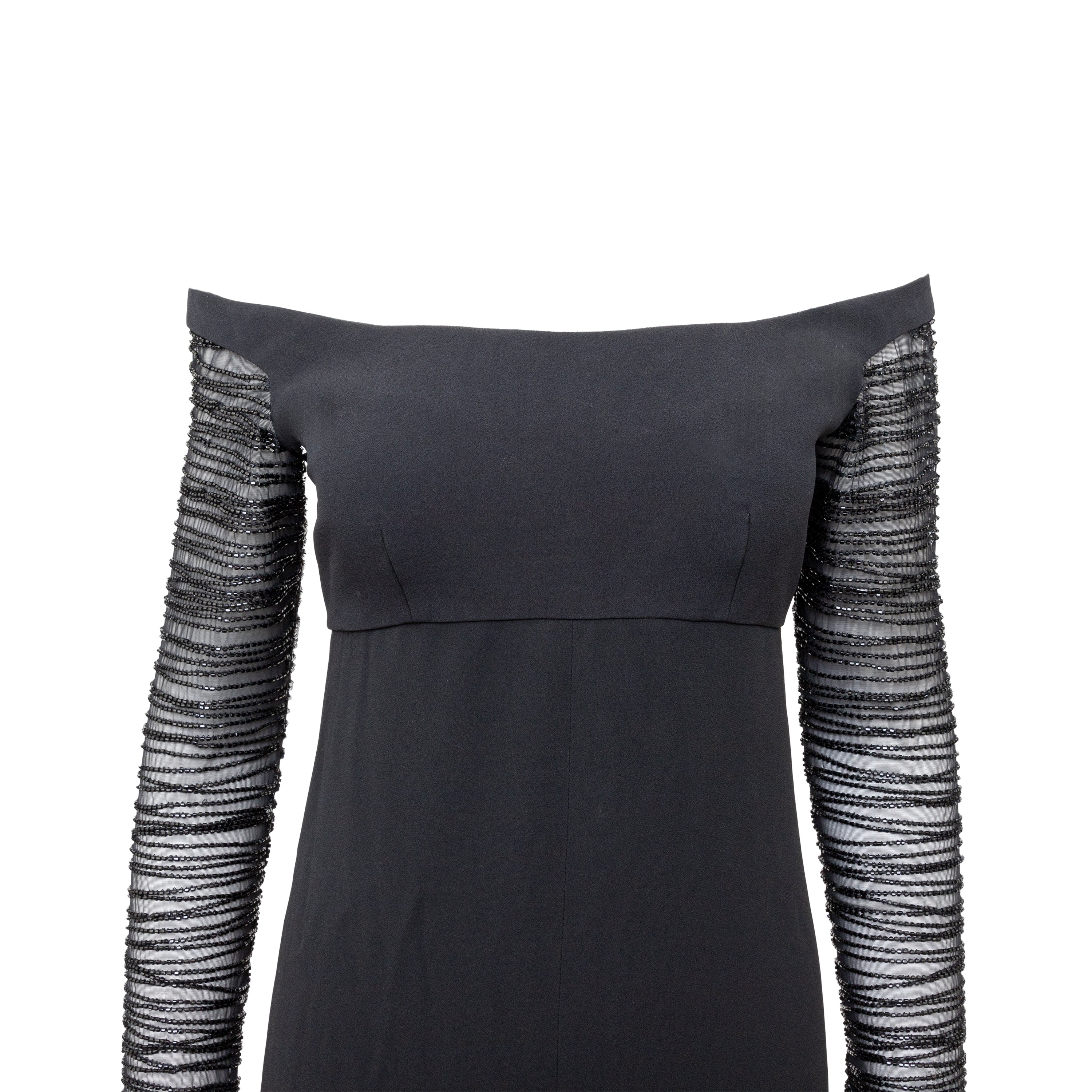 Elegant and timeless, this Gianfranco Ferré off-shoulder long dress captures the essence of the 90s. Adorned with black tubular crystals, the sheer long sleeves with the off-shoulder design add a touch of glamour to the classic silhouette.