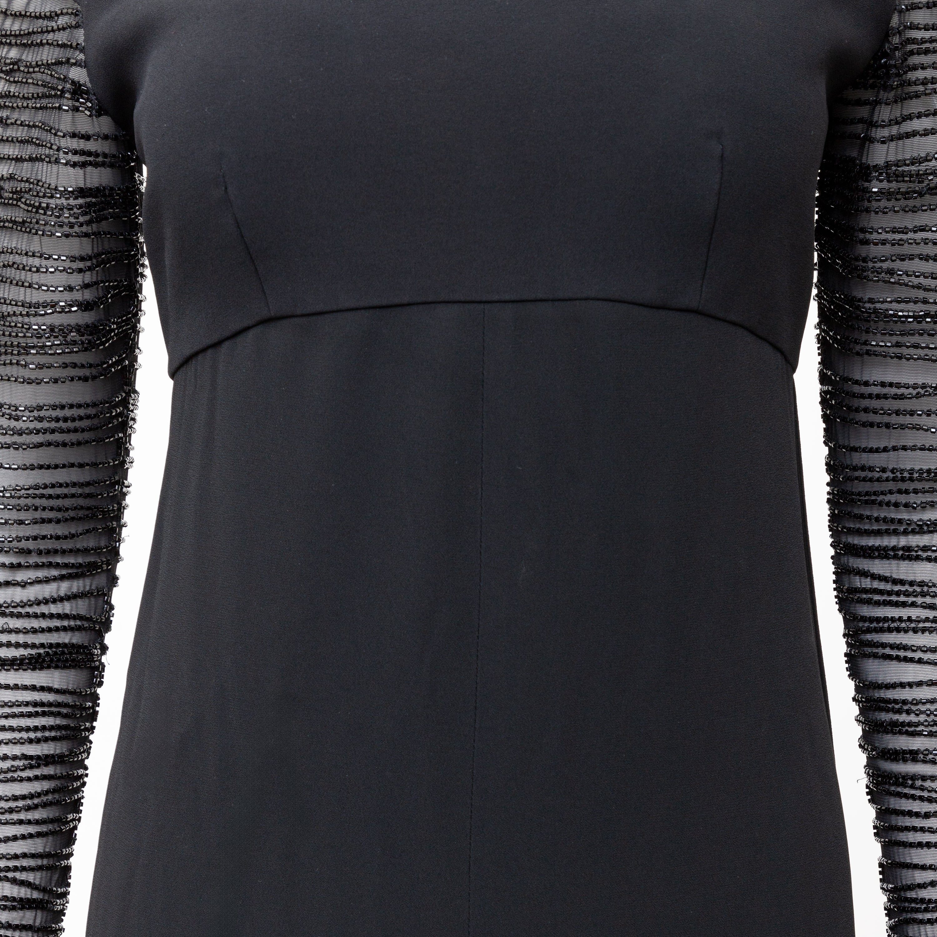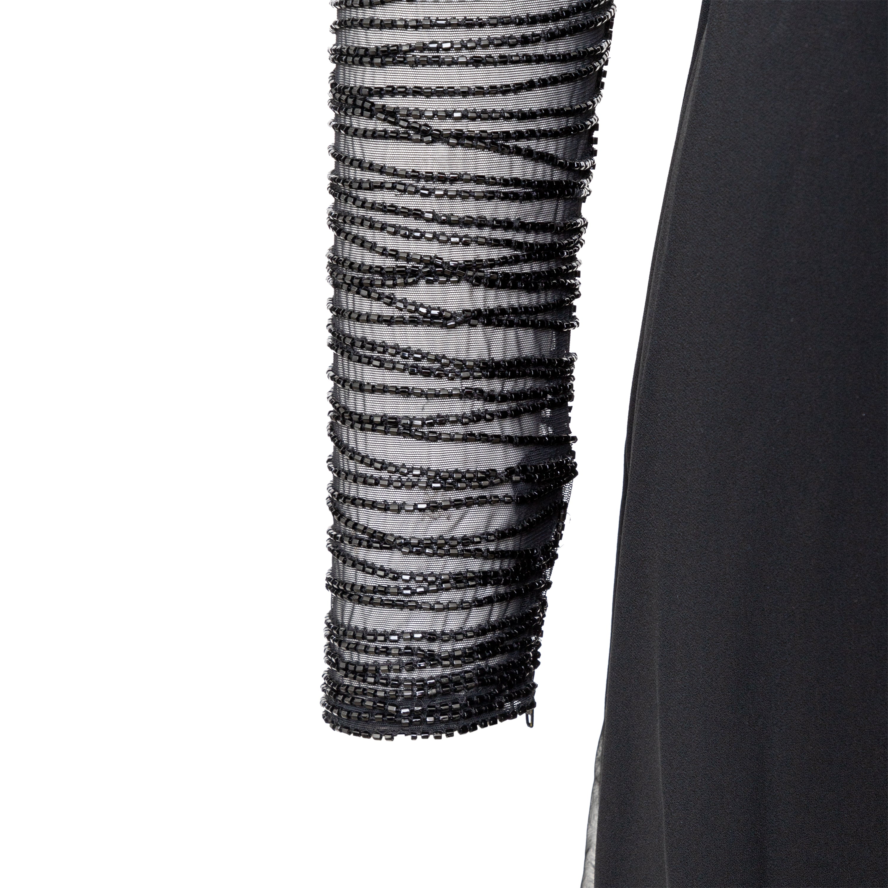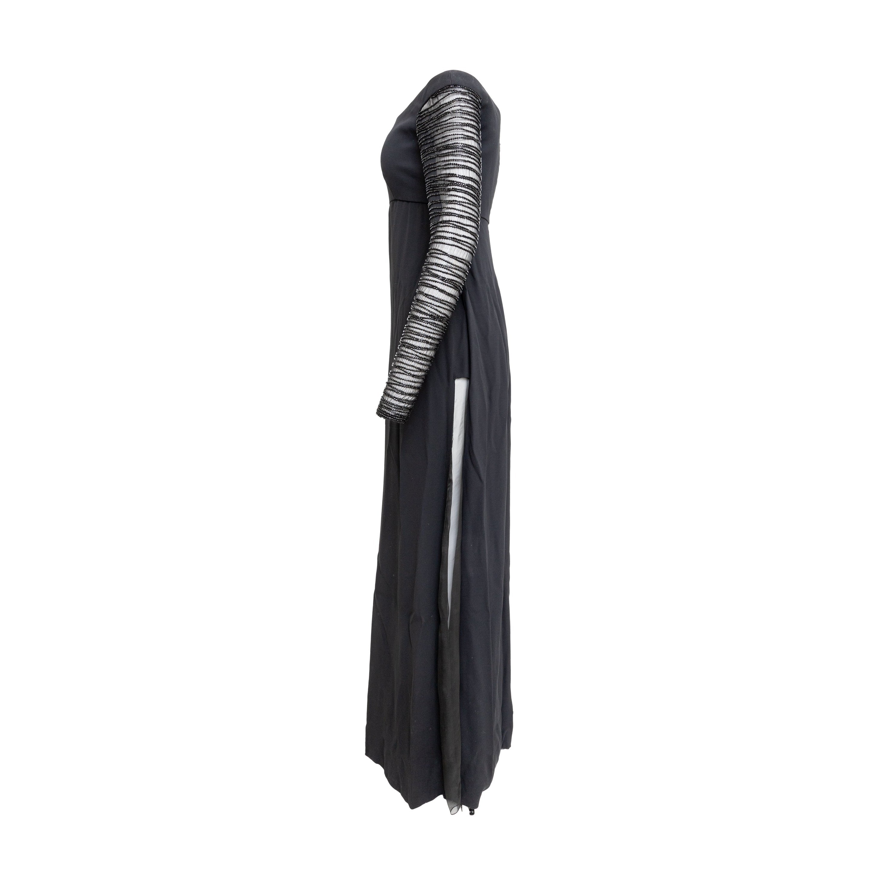 Elegant and timeless, this Gianfranco Ferré off-shoulder long dress captures the essence of the 90s. Adorned with black tubular crystals, the sheer long sleeves with the off-shoulder design add a touch of glamour to the classic silhouette.