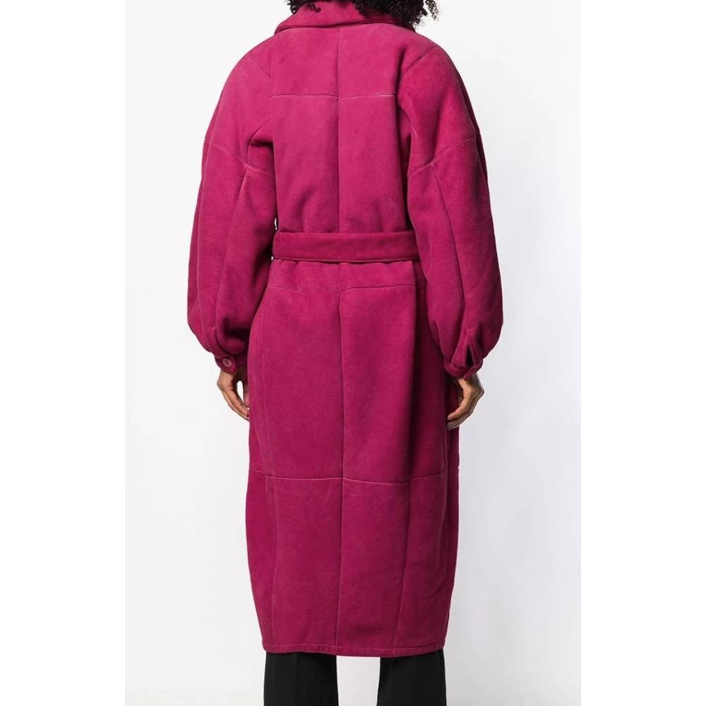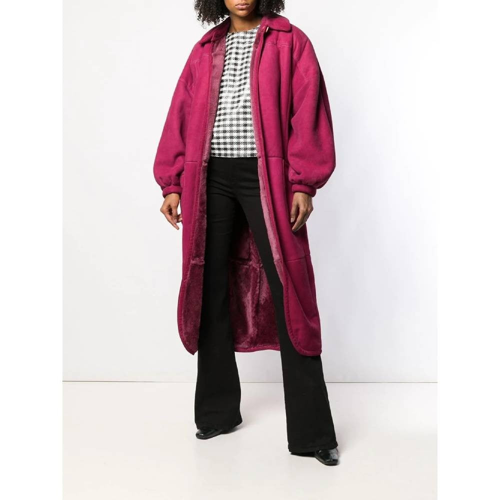 Gianfranco Ferré fuchsia sheepskin oversize coat. Classic collar, drop shoulders, long sleeves and tight cuffs. Single button fastening and waist belt.