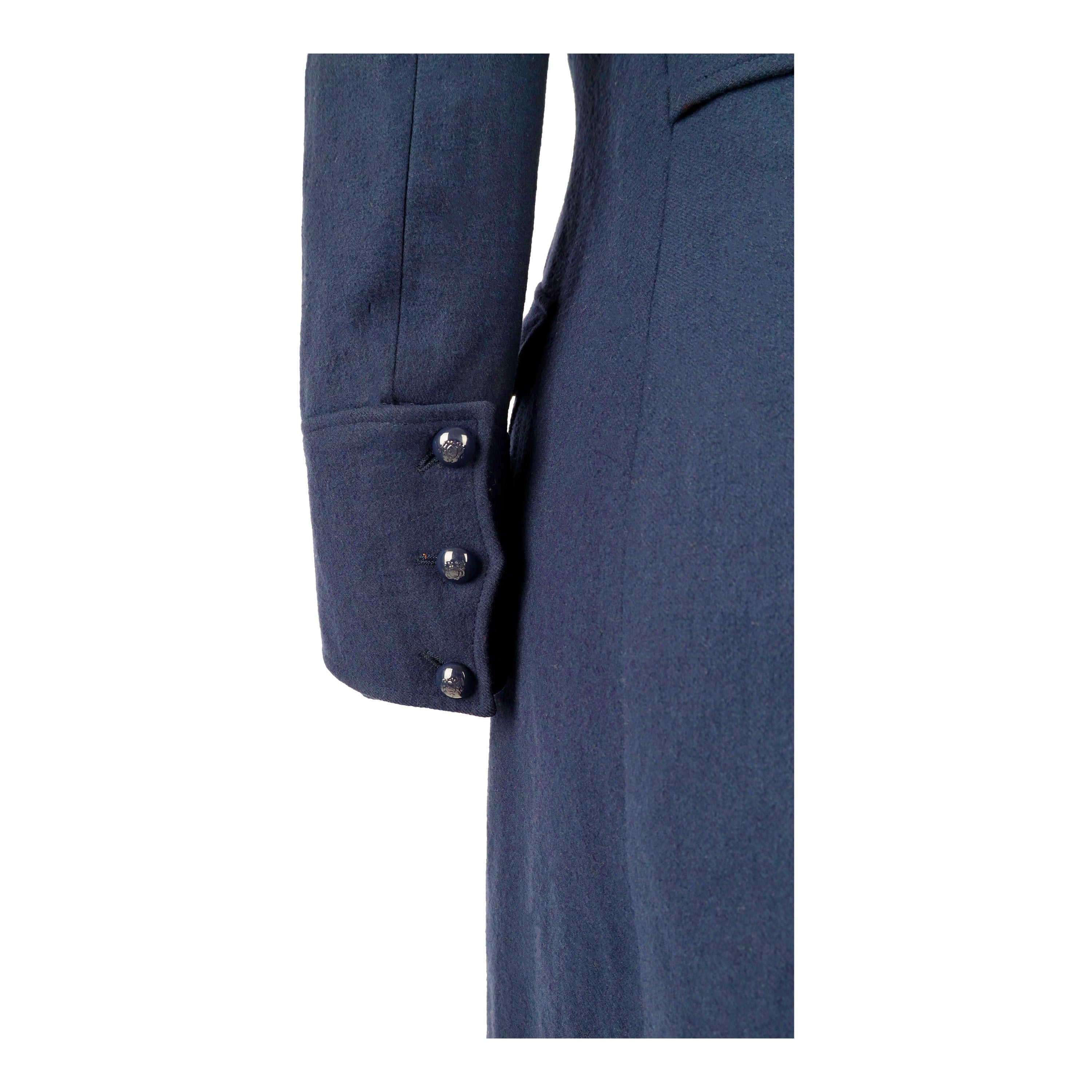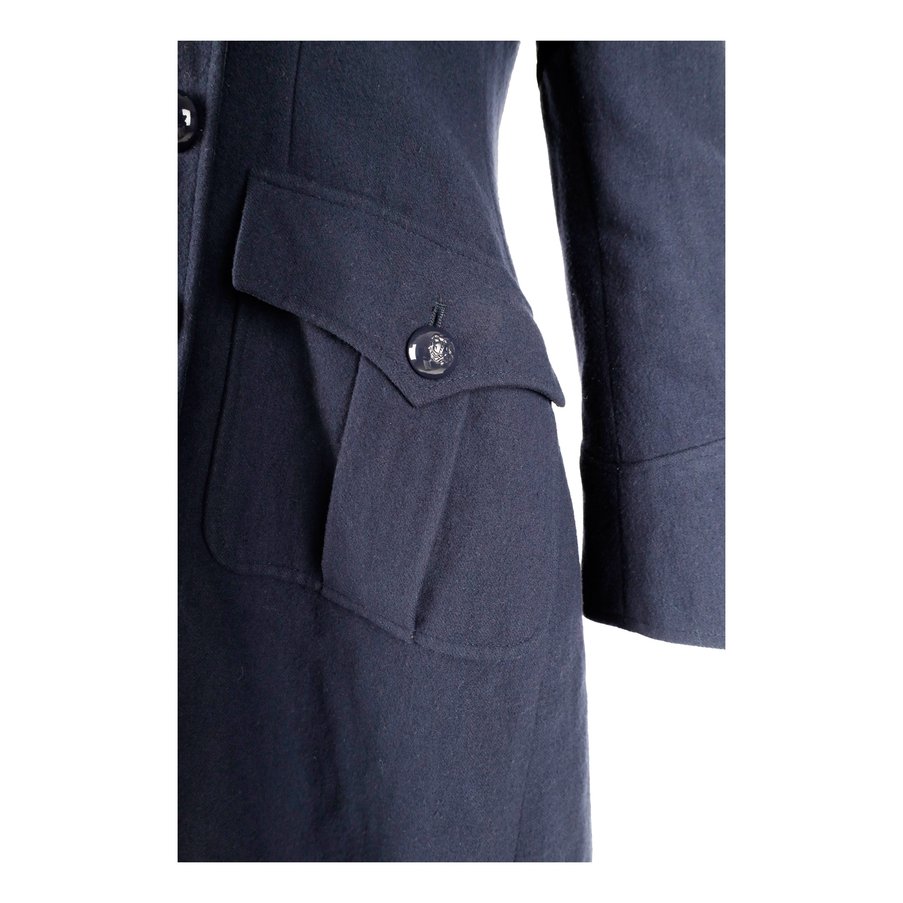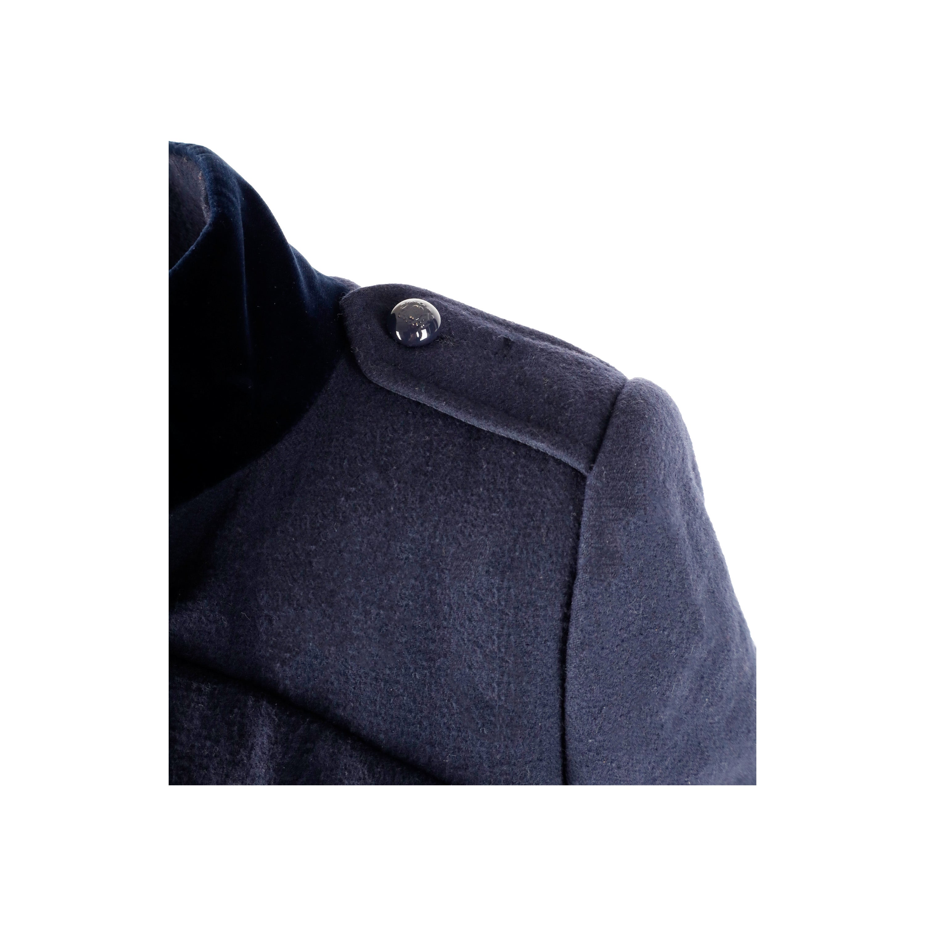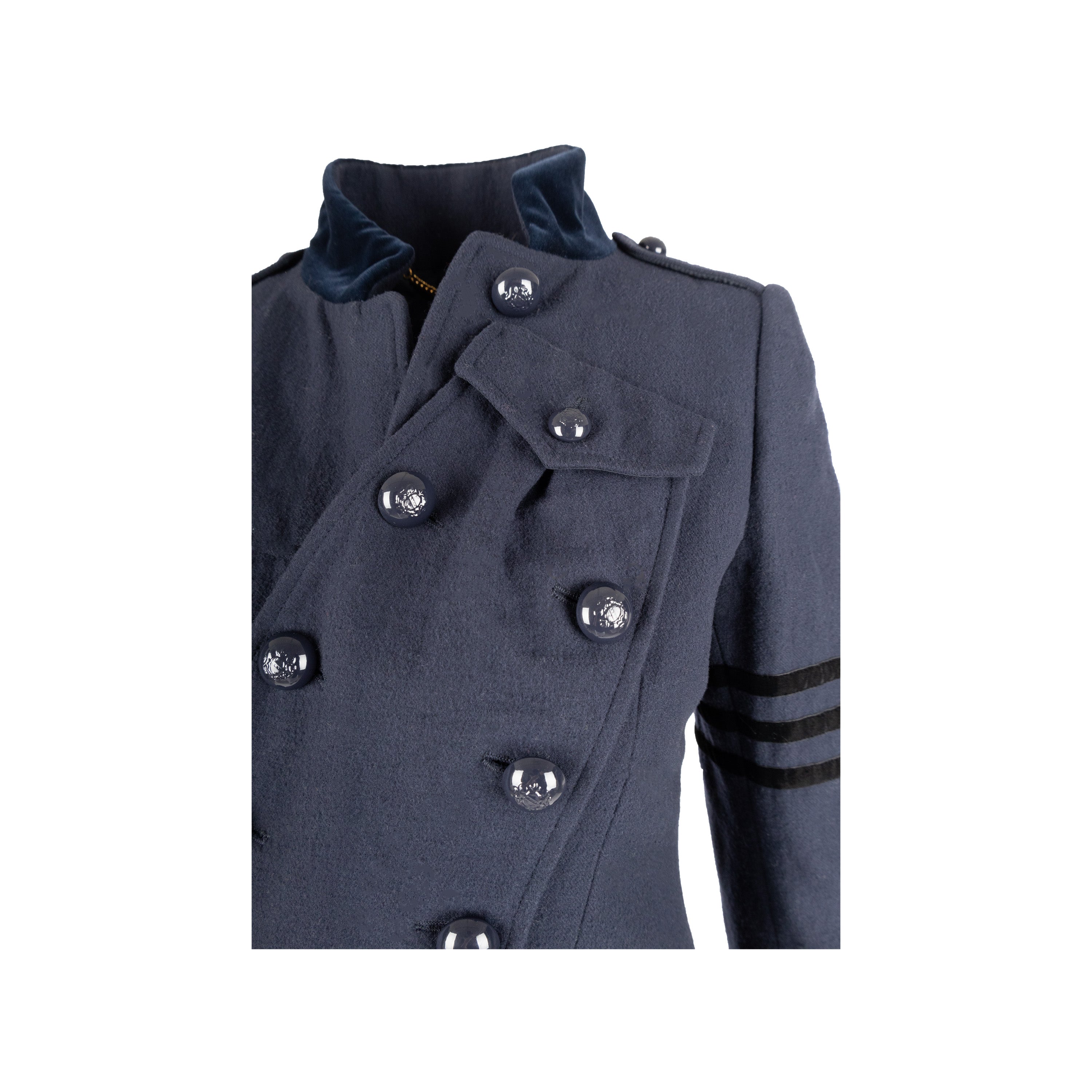 This dark blue wool blend double breasted coat exudes elegance and sophistication. The luxurious velvet collar and sleeve trimmings add a touch of opulence, while the brand insignia on the buttons showcases quality and style. The unique panel, attached with buttons, sets this coat apart from the rest.