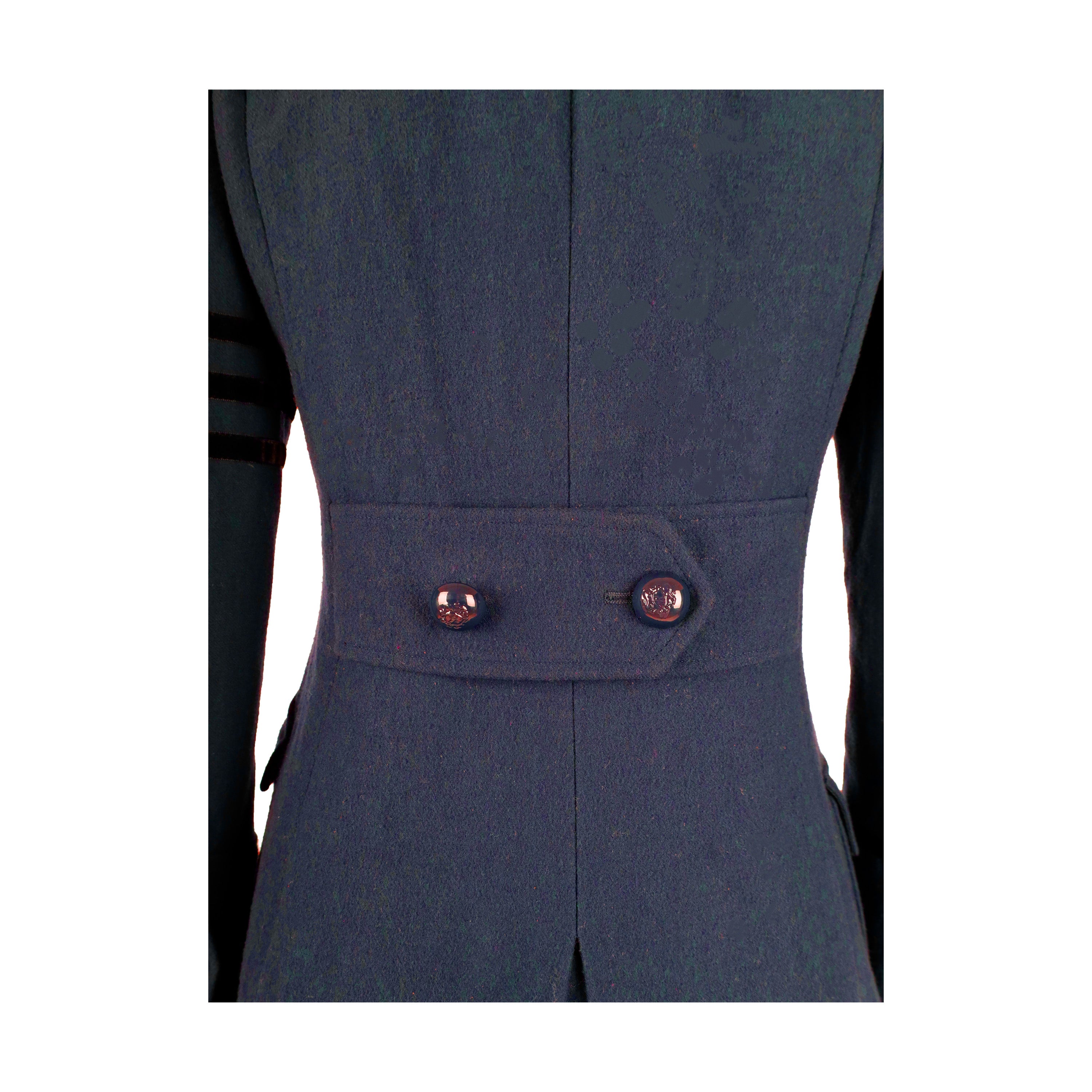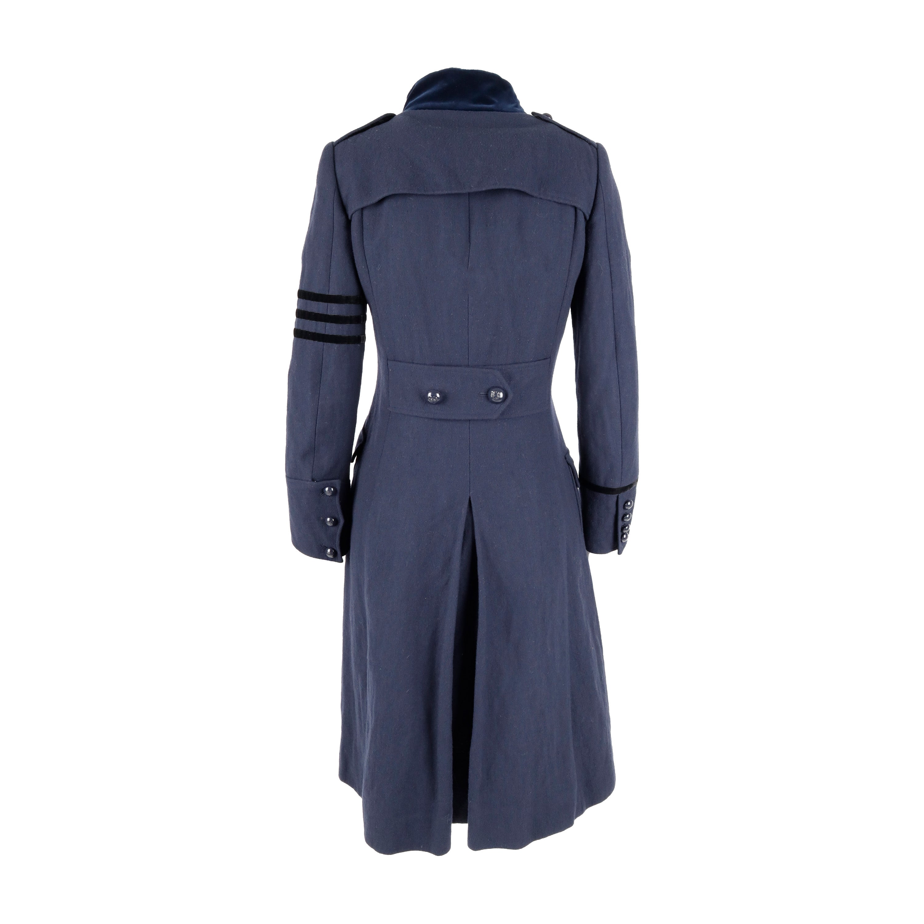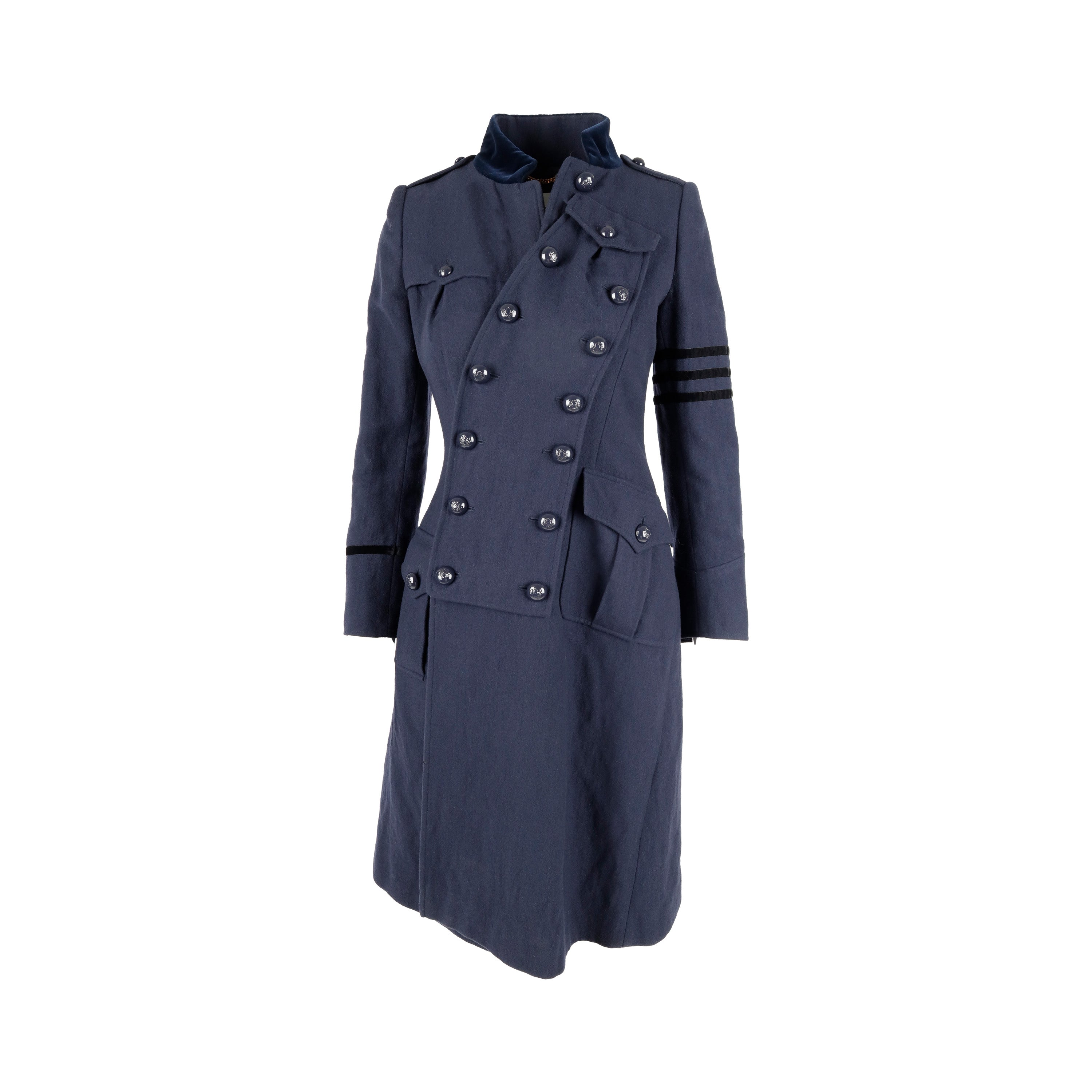 This dark blue wool blend double breasted coat exudes elegance and sophistication. The luxurious velvet collar and sleeve trimmings add a touch of opulence, while the brand insignia on the buttons showcases quality and style. The unique panel, attached with buttons, sets this coat apart from the rest.