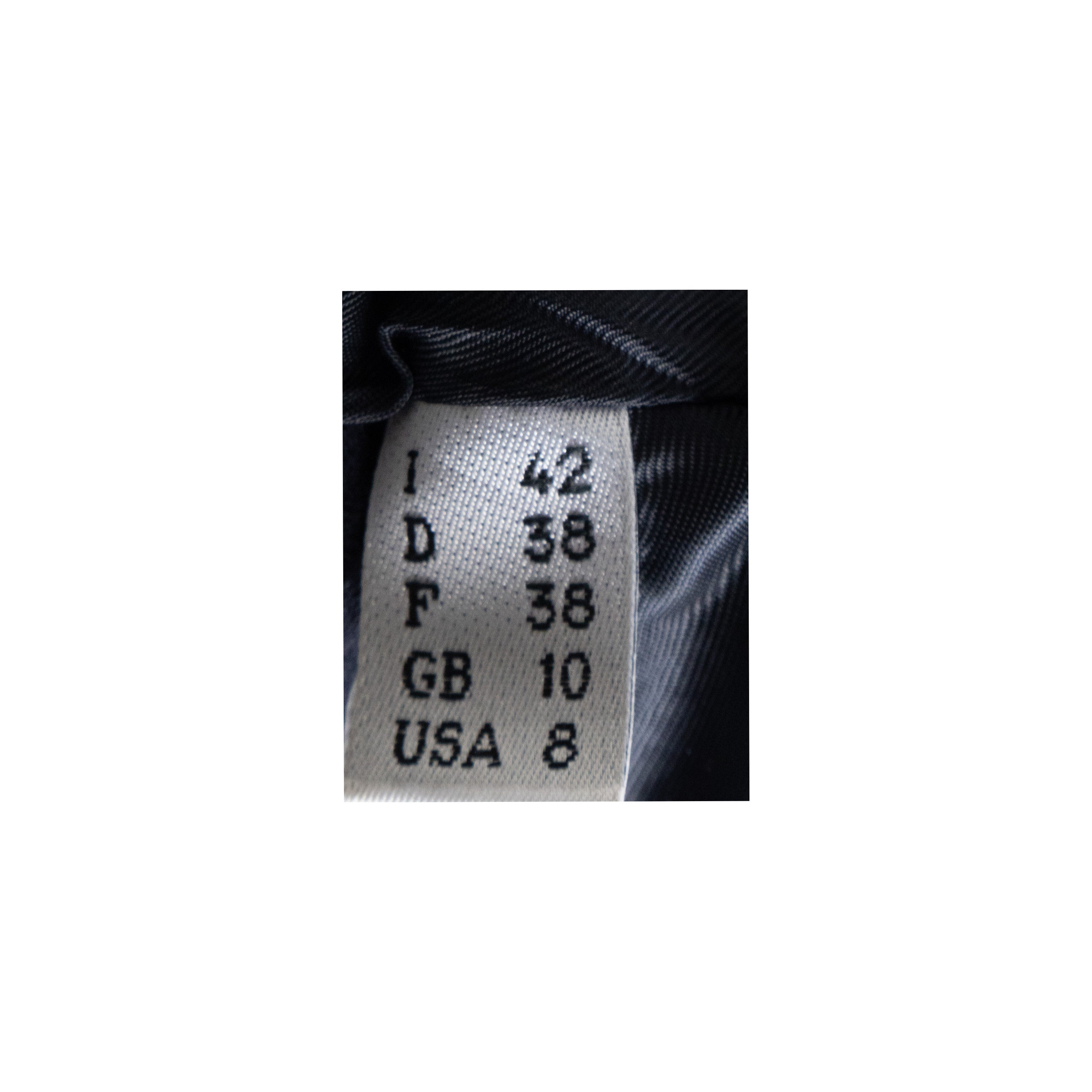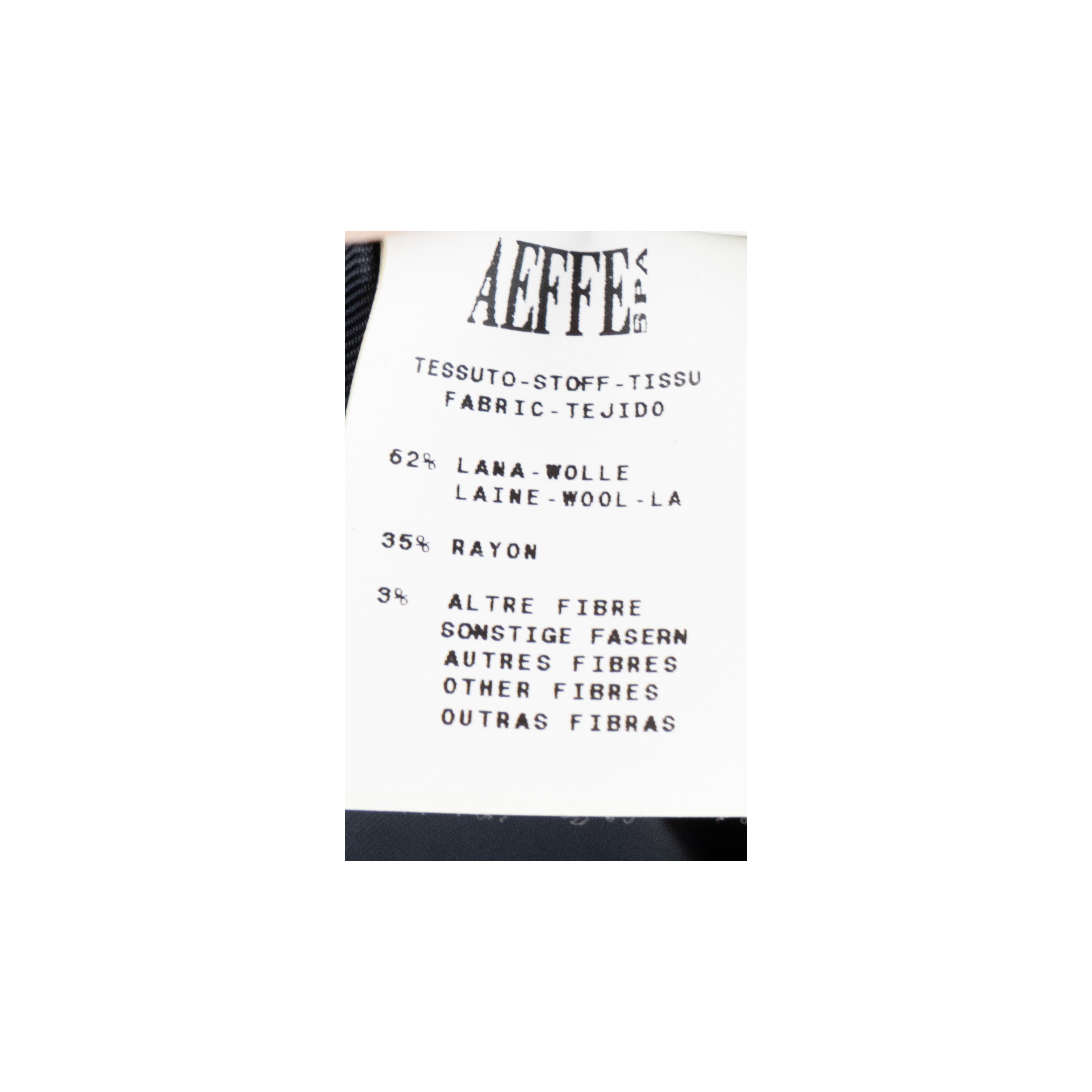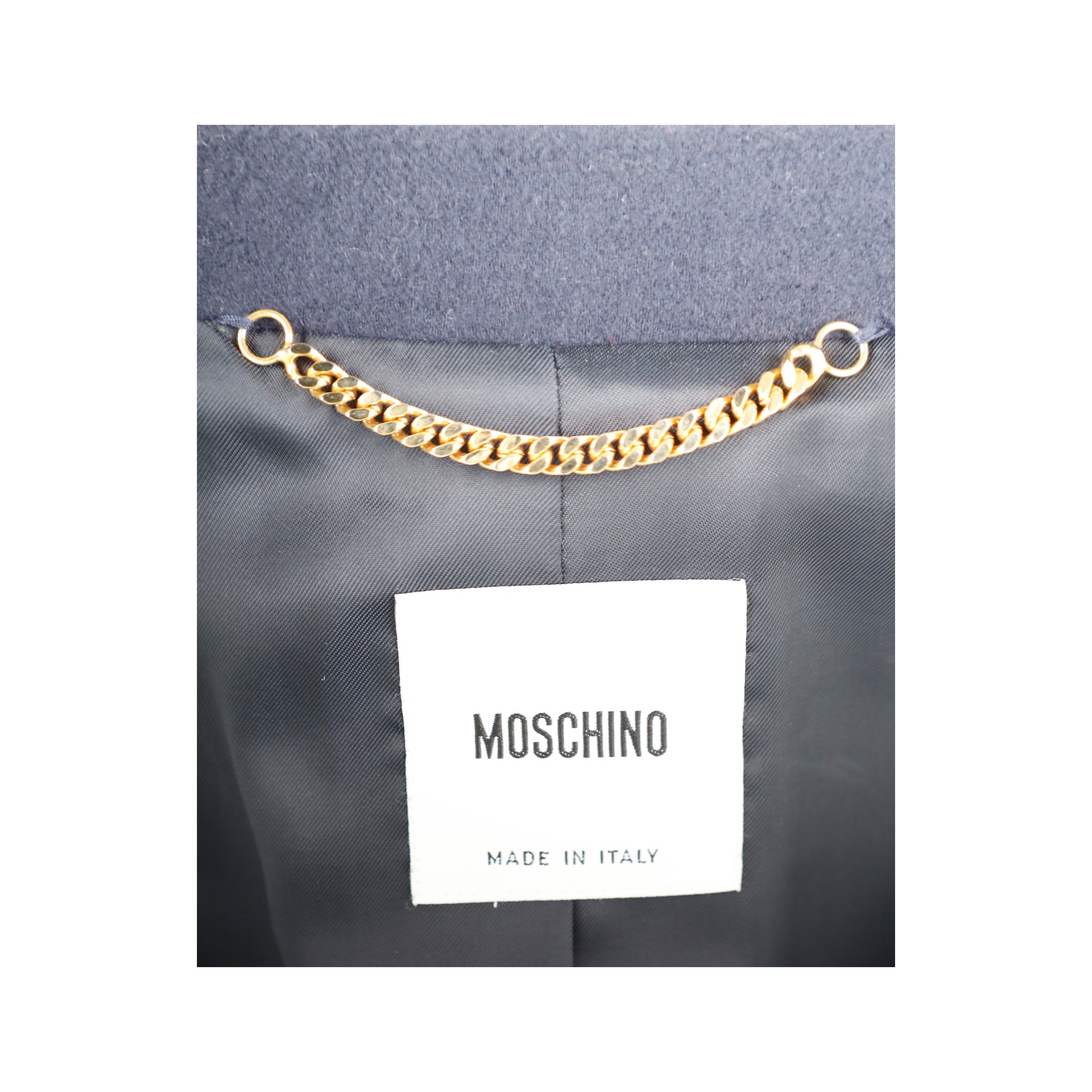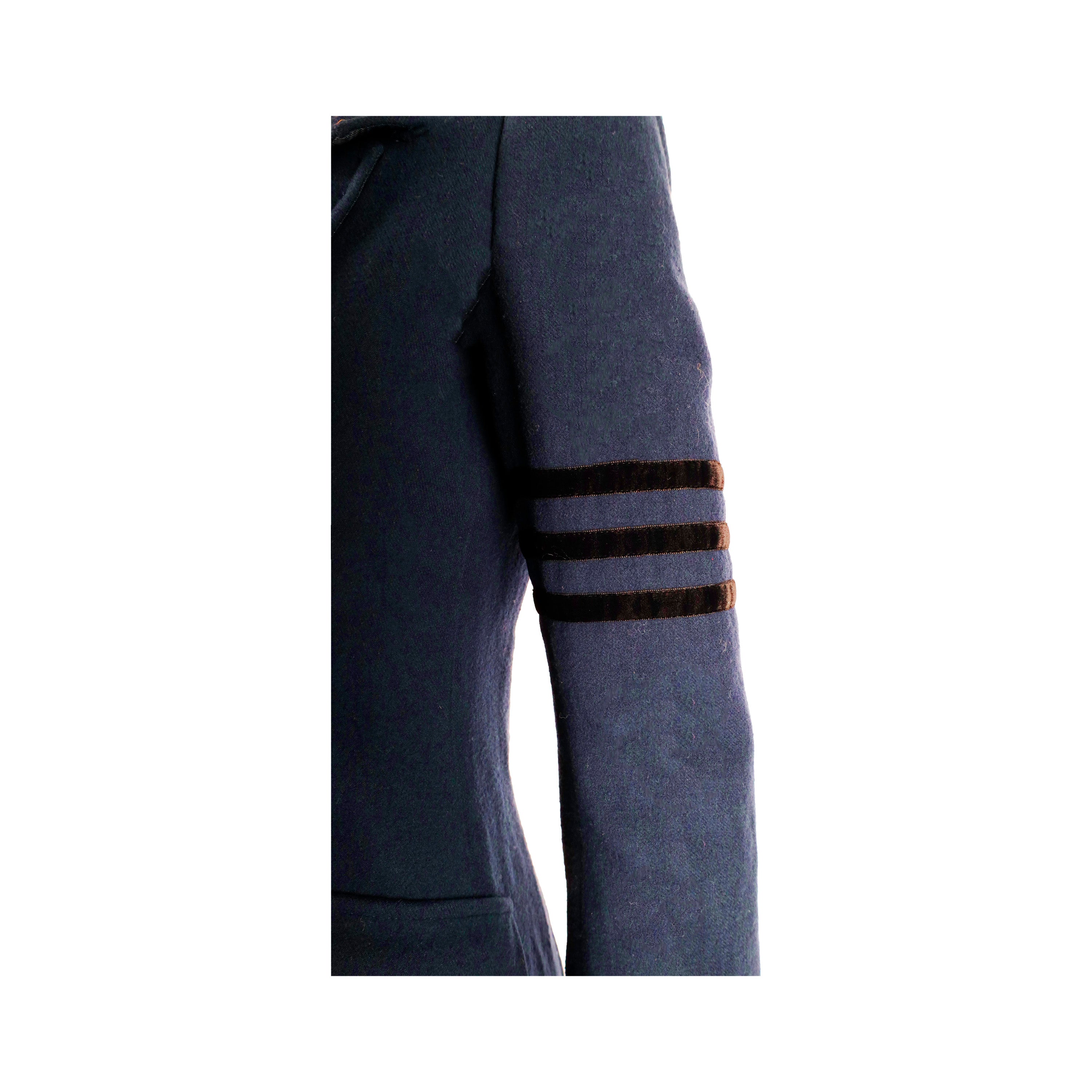 This dark blue wool blend double breasted coat exudes elegance and sophistication. The luxurious velvet collar and sleeve trimmings add a touch of opulence, while the brand insignia on the buttons showcases quality and style. The unique panel, attached with buttons, sets this coat apart from the rest.