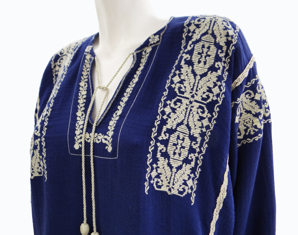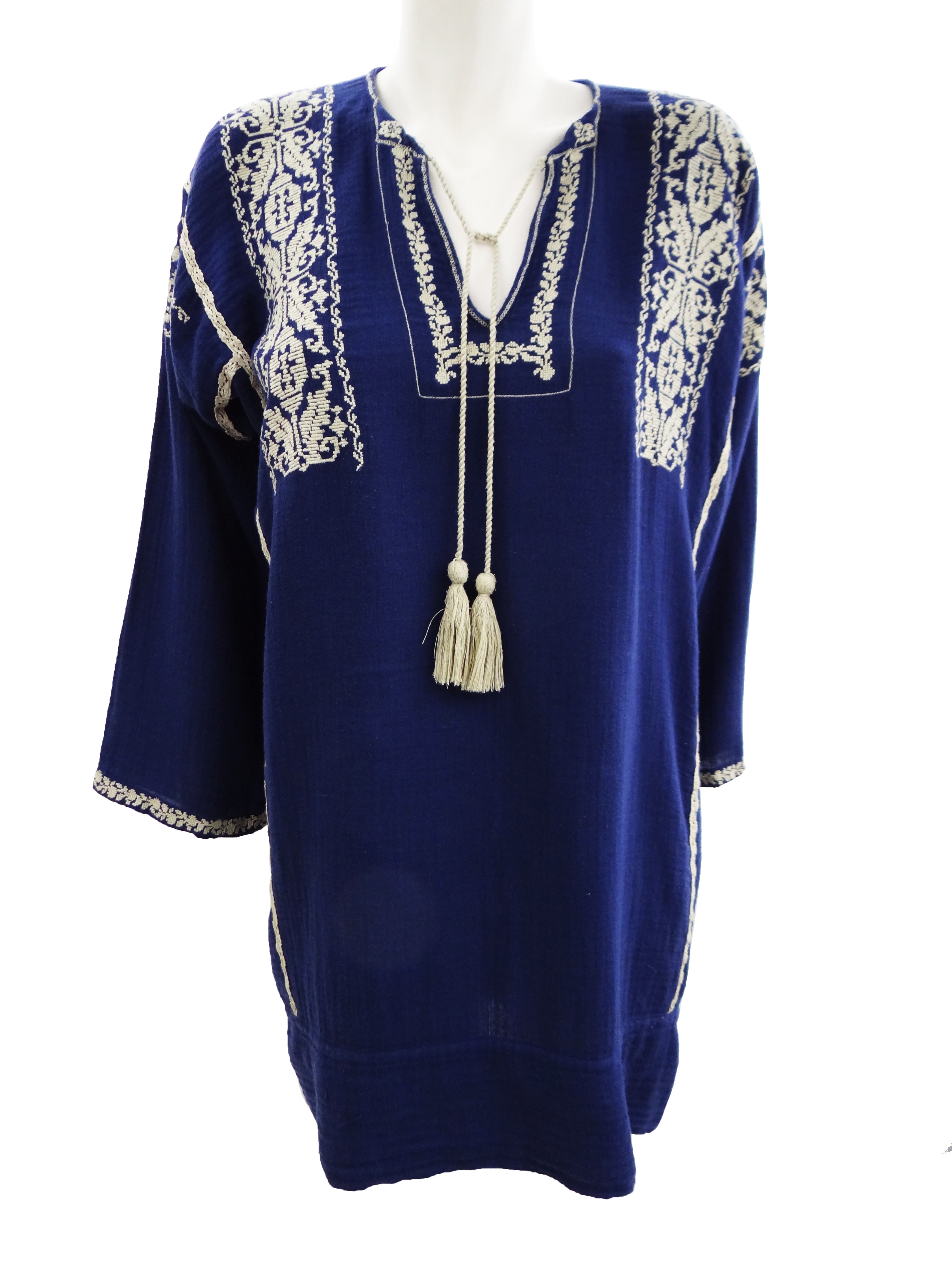 A lovely tunic dress by Isabel Marant Etoile, in soft navy blue cotton with ivory embroidery. It is loose fitting, mid-thigh length, with long sleeves, and a deep V neck with tasselled ties.