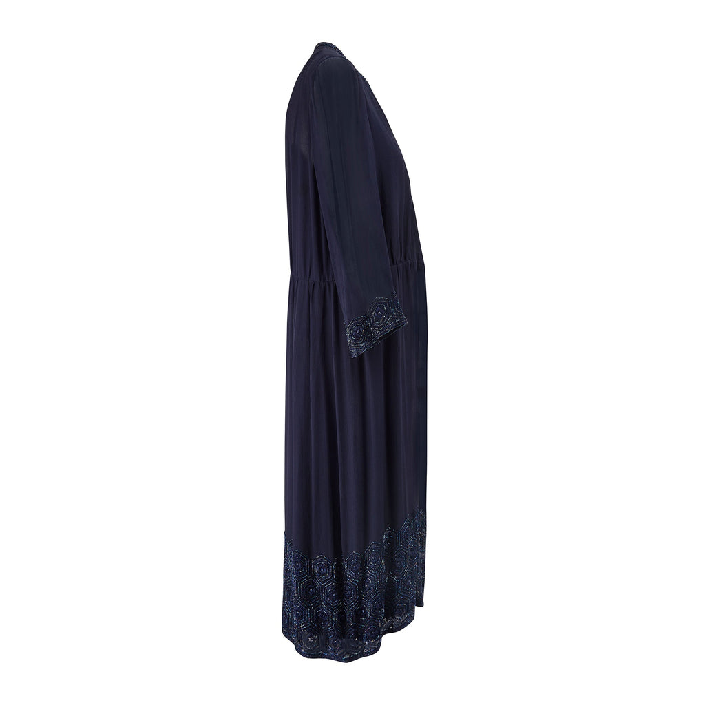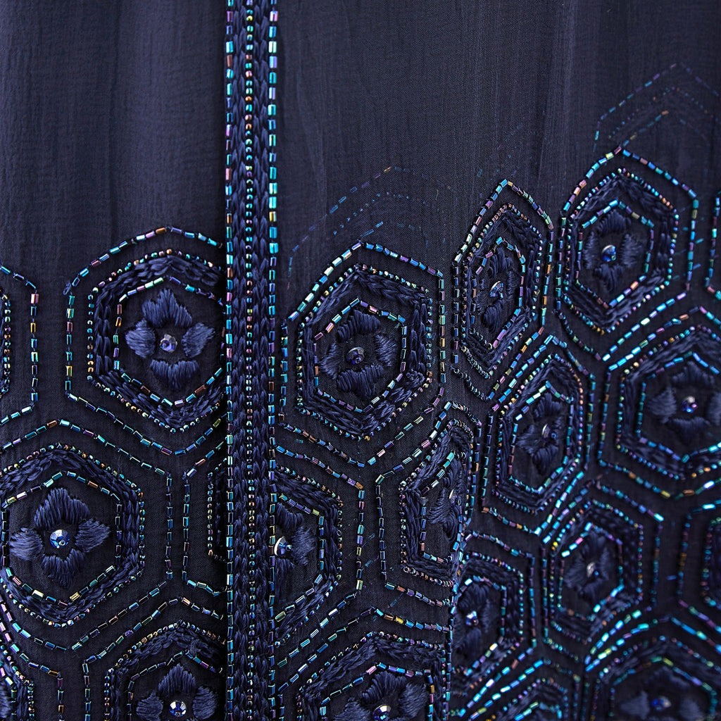 The slip dress is made of fine navy silk with narrow spaghetti straps made from ribbon and a sensuous, V-shaped bust. It is fully lined and falls in a column shape to the mid-calf. It is fastened by a hidden tonal zip and hook-and-eye clasp under the left arm. The chiffon silk cover-up is sheer and fastens in a wrap style across the front with a snap closure and two hook-and-eye clasps. It falls to the same length as the slip. The beadwork on this piece is exquisite; rows of iridescent bugle beads and glossy navy embroidery frame the neckline and, running along the bottom half of the jacket, there is a foot of beads and tonal embroidery. Here, embroidered navy petals surround a central blue bead, whilst hexagonal stitching and beadwork encircle these floral shapes. This beautiful detailing is echoed at each cuff.
