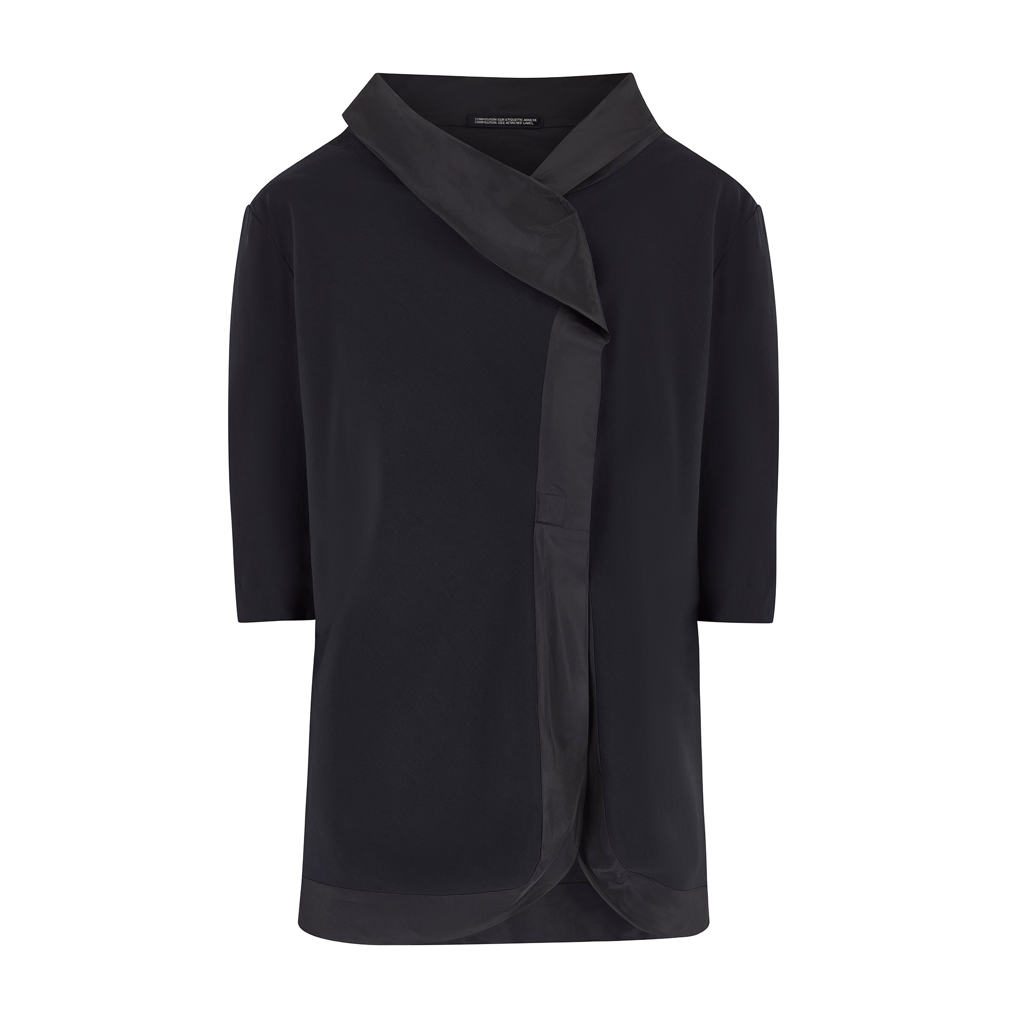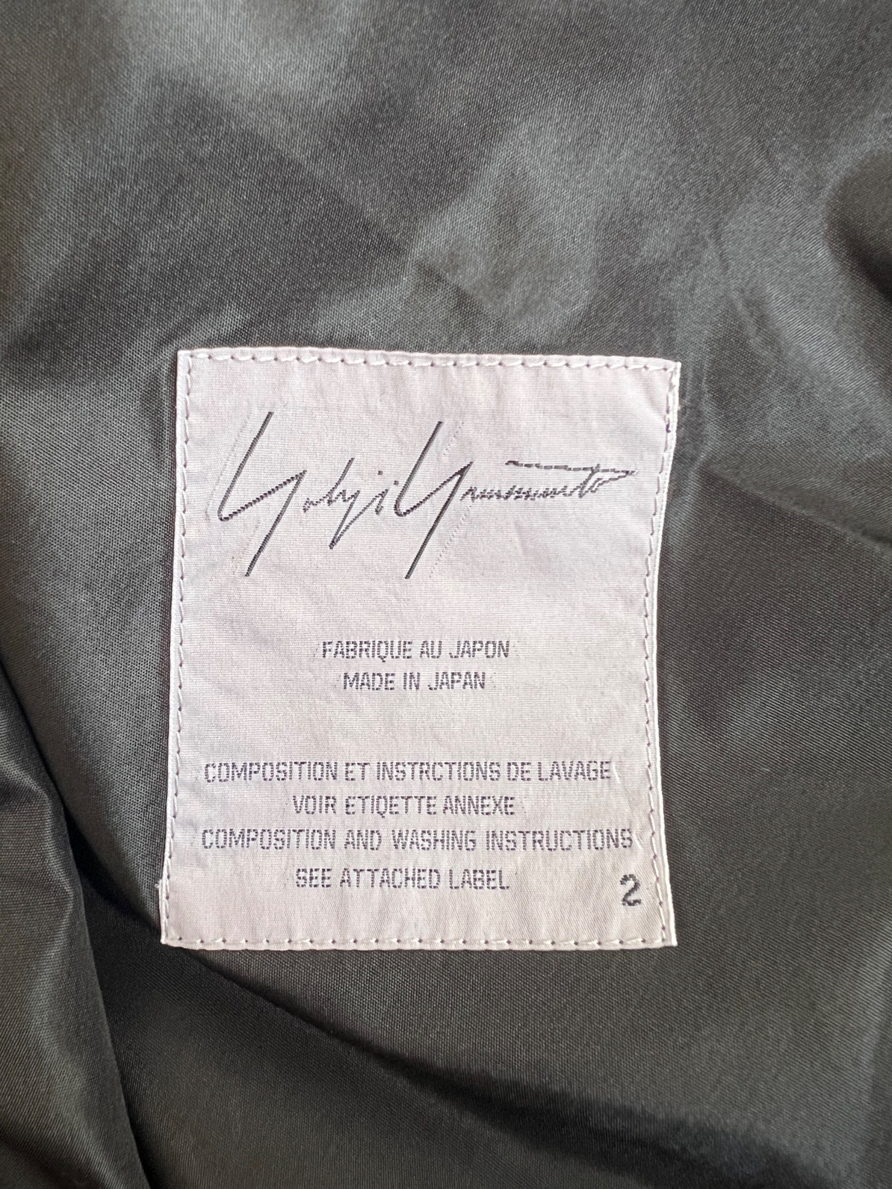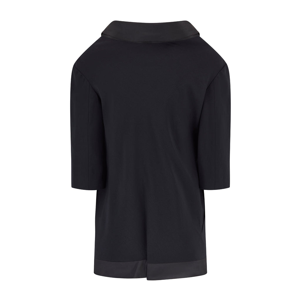 Lauded fashion designer and master tailor, Yohji Yamamoto is known for his avant-garde designs rooted in Japanese aesthetics. Made in Japan, this jacket was modelled by Erin O'Connor for the designer’s Spring 2001 collection as look 33/35. The Vogue review described how in this collection Yamamoto was “swathing and wrapping the body in his unique, highly evolved manner.” This jacket embodies his passion for experimentation and pushing the boundaries of what we consider tailoring. Cut to a cocooning fit from black wool, it is trimmed and lined with a crisp black taffeta. There is a soft collar that reveals the lining and gives way to a twisting hemline of the same fabric that continues all the way down the lapels and round the back of the jacket. The sleeves offer a relaxed fit and are cropped to a three-quarter length. The jacket fastens at the front with a single square of tonal Velcro - not visible when the jacket is closed.