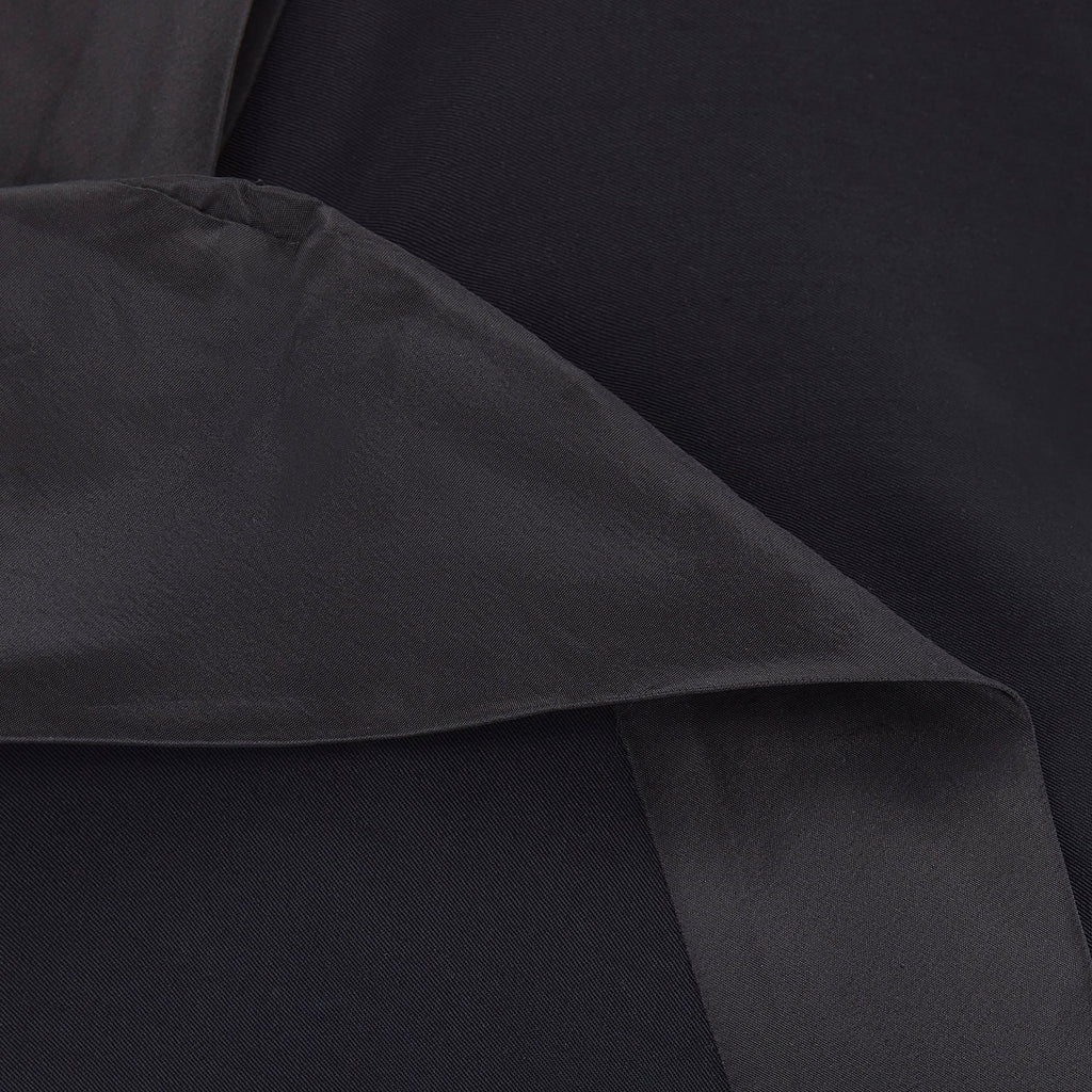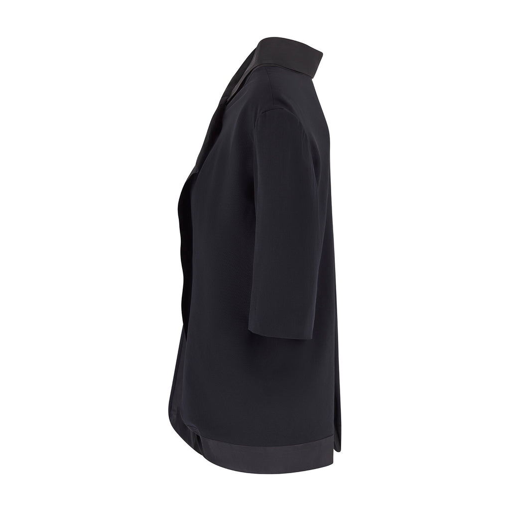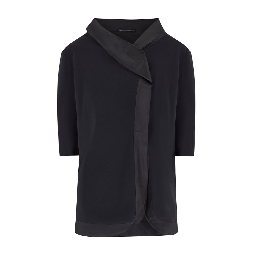 Lauded fashion designer and master tailor, Yohji Yamamoto is known for his avant-garde designs rooted in Japanese aesthetics. Made in Japan, this jacket was modelled by Erin O'Connor for the designer’s Spring 2001 collection as look 33/35. The Vogue review described how in this collection Yamamoto was “swathing and wrapping the body in his unique, highly evolved manner.” This jacket embodies his passion for experimentation and pushing the boundaries of what we consider tailoring. Cut to a cocooning fit from black wool, it is trimmed and lined with a crisp black taffeta. There is a soft collar that reveals the lining and gives way to a twisting hemline of the same fabric that continues all the way down the lapels and round the back of the jacket. The sleeves offer a relaxed fit and are cropped to a three-quarter length. The jacket fastens at the front with a single square of tonal Velcro - not visible when the jacket is closed.