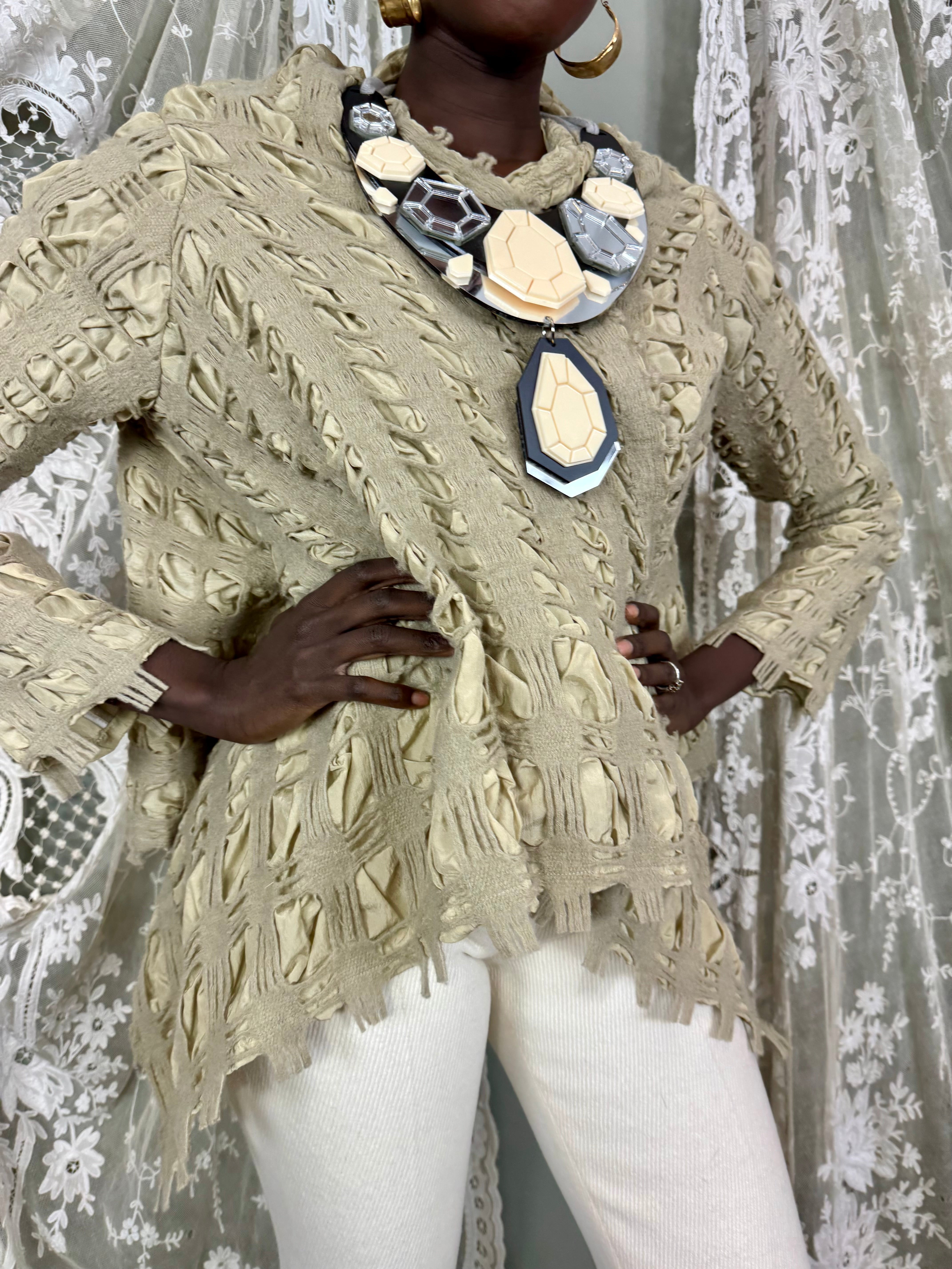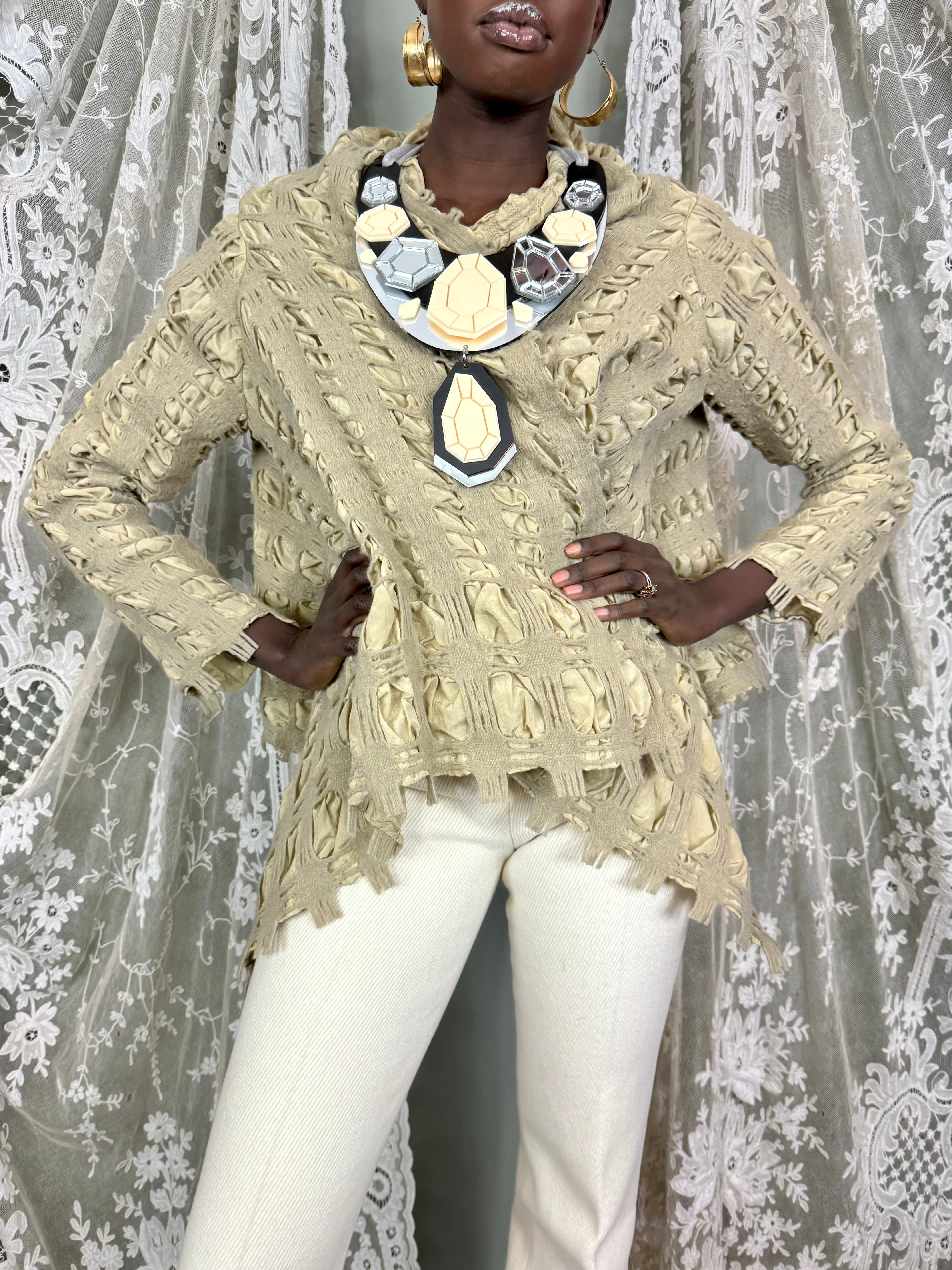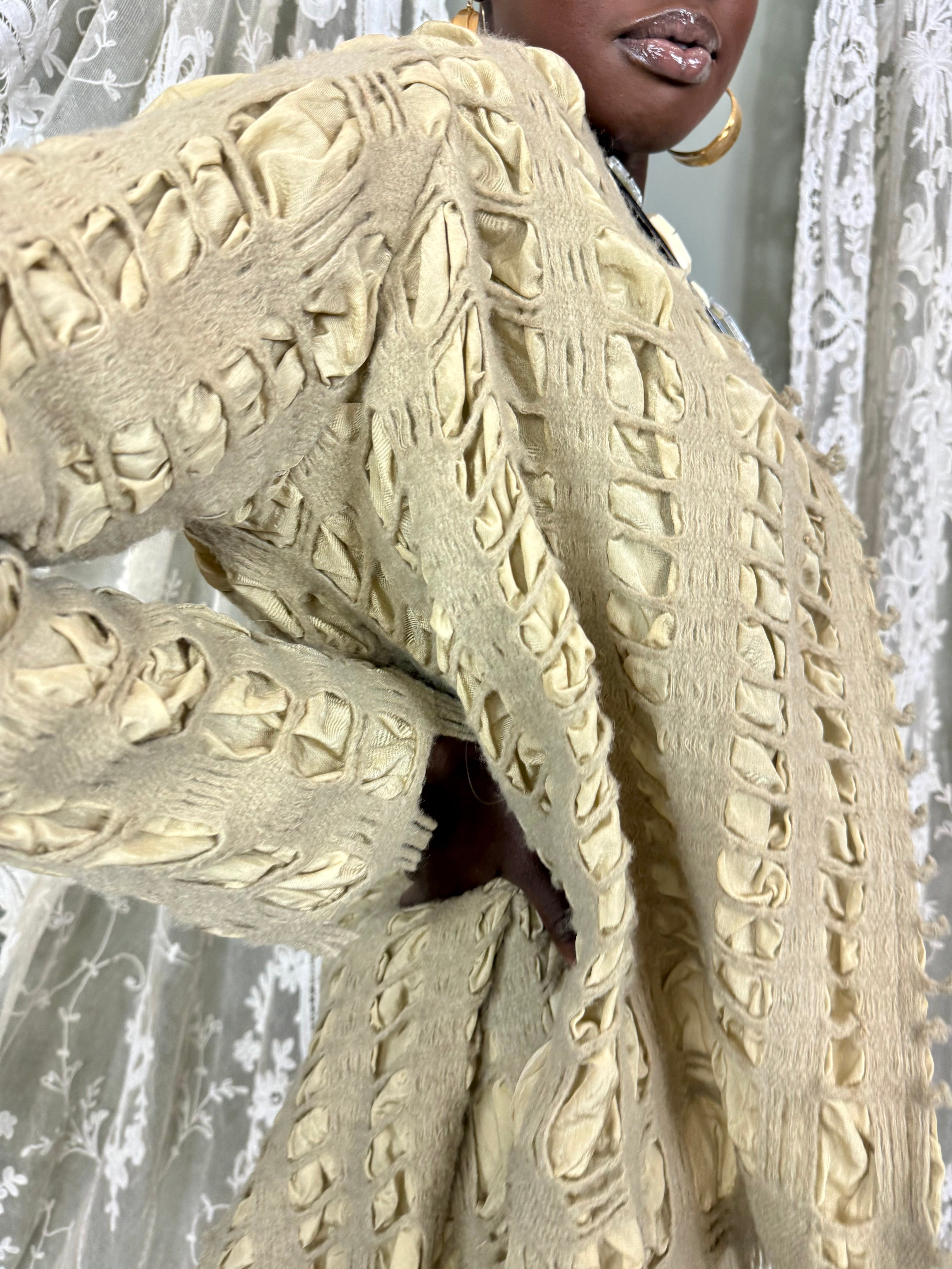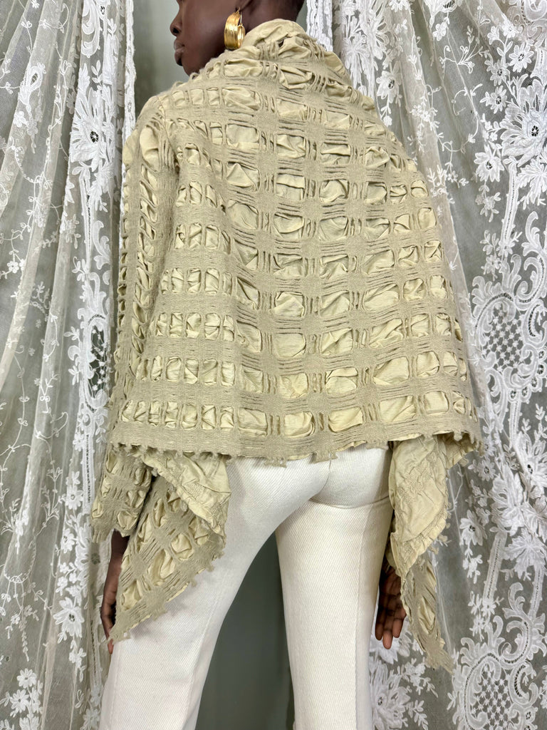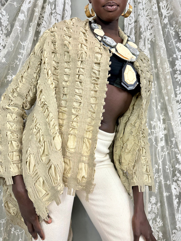 Expertly crafted in Japan, this oat colour jacket showcases a unique cage effect texture using a blend of silk and wool. Its loose fit and long sleeves provide comfort and style, making it a must-have y2k piece. Elevate your wardrobe with this handcrafted jacket.