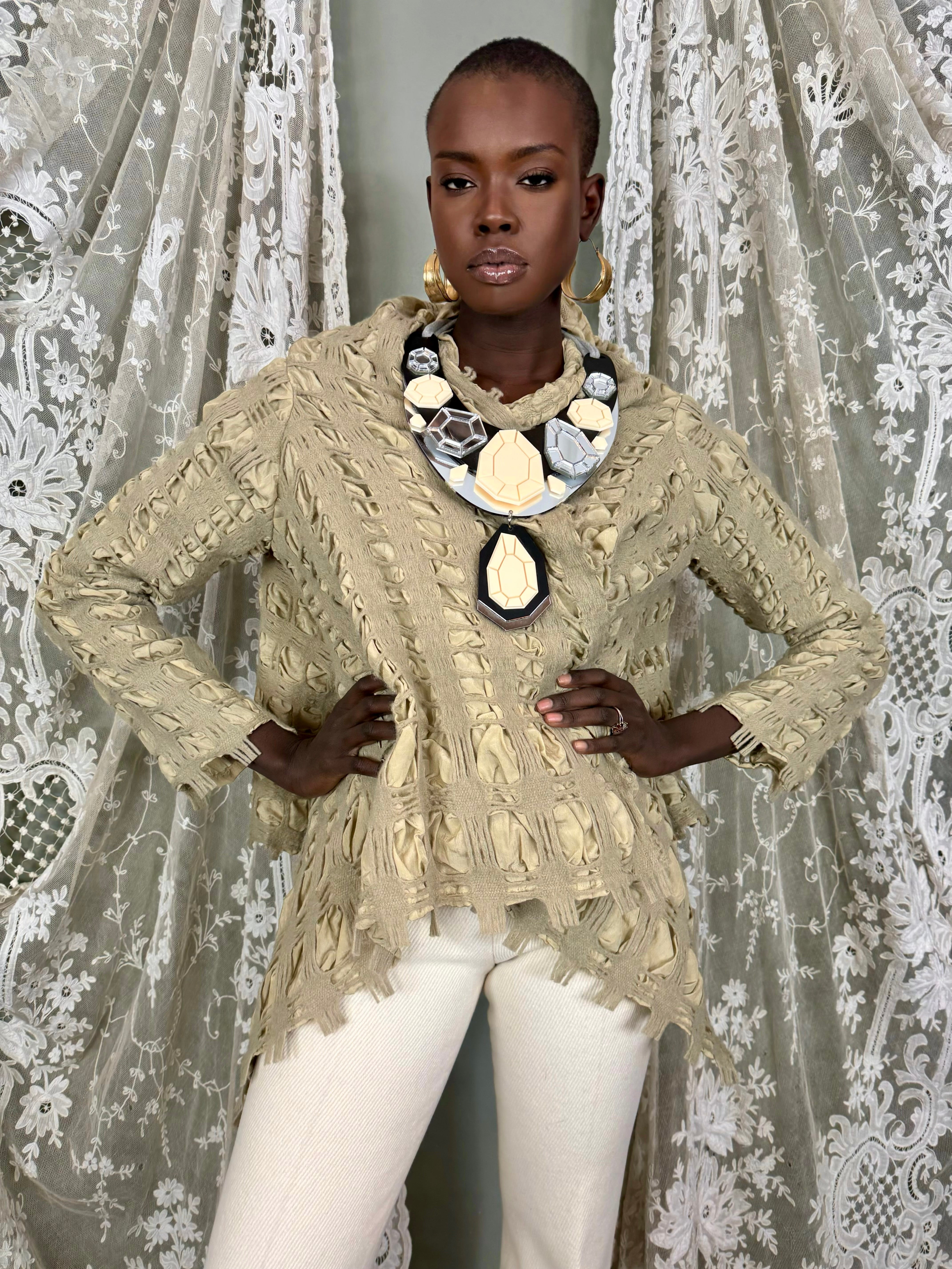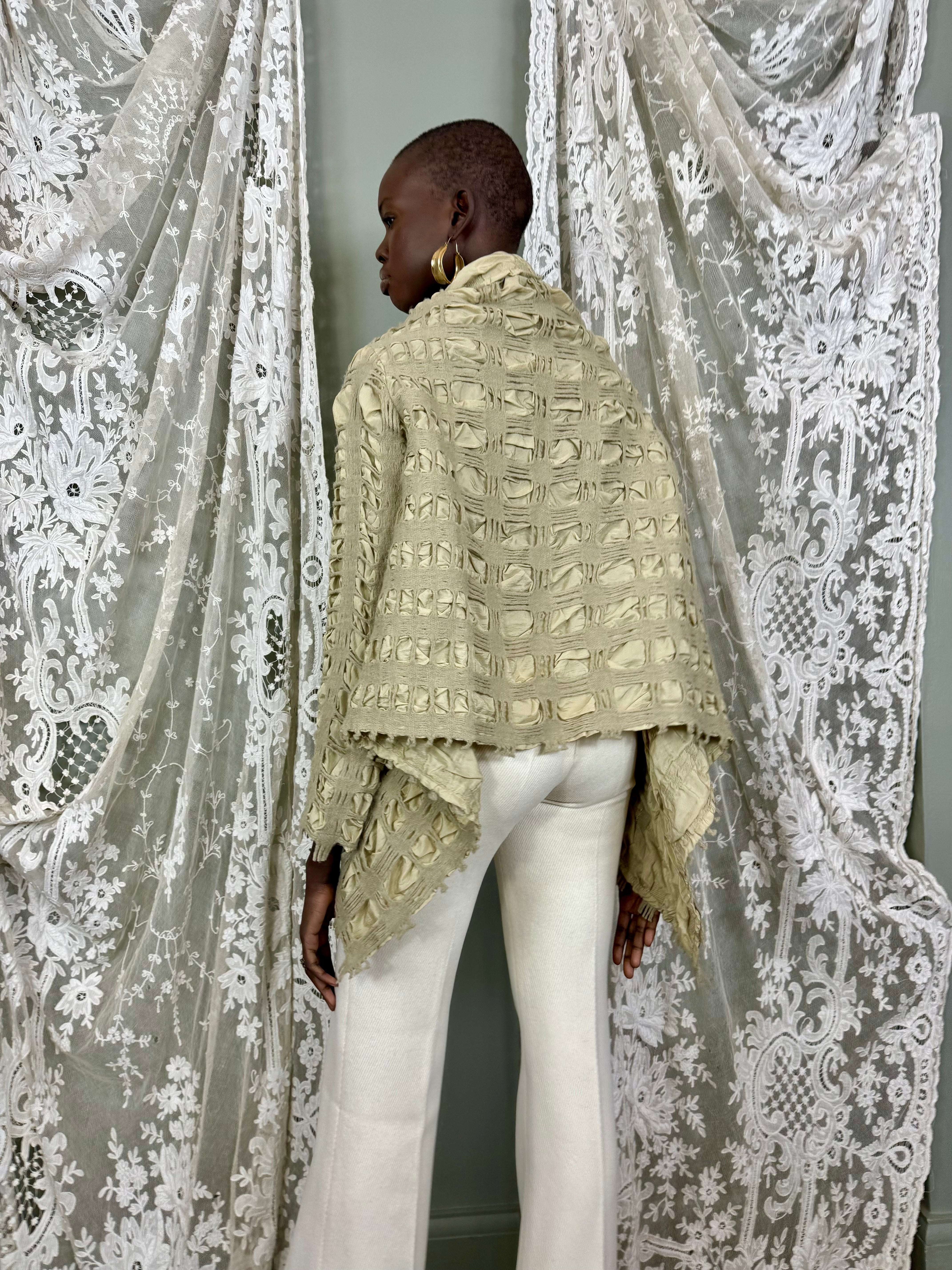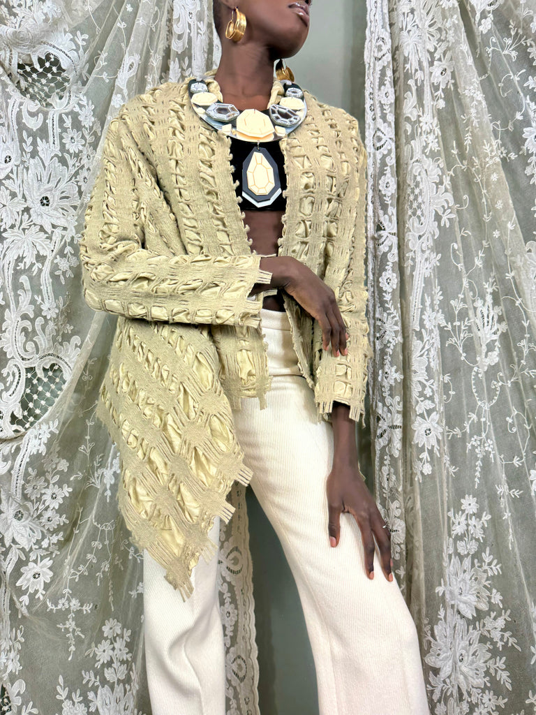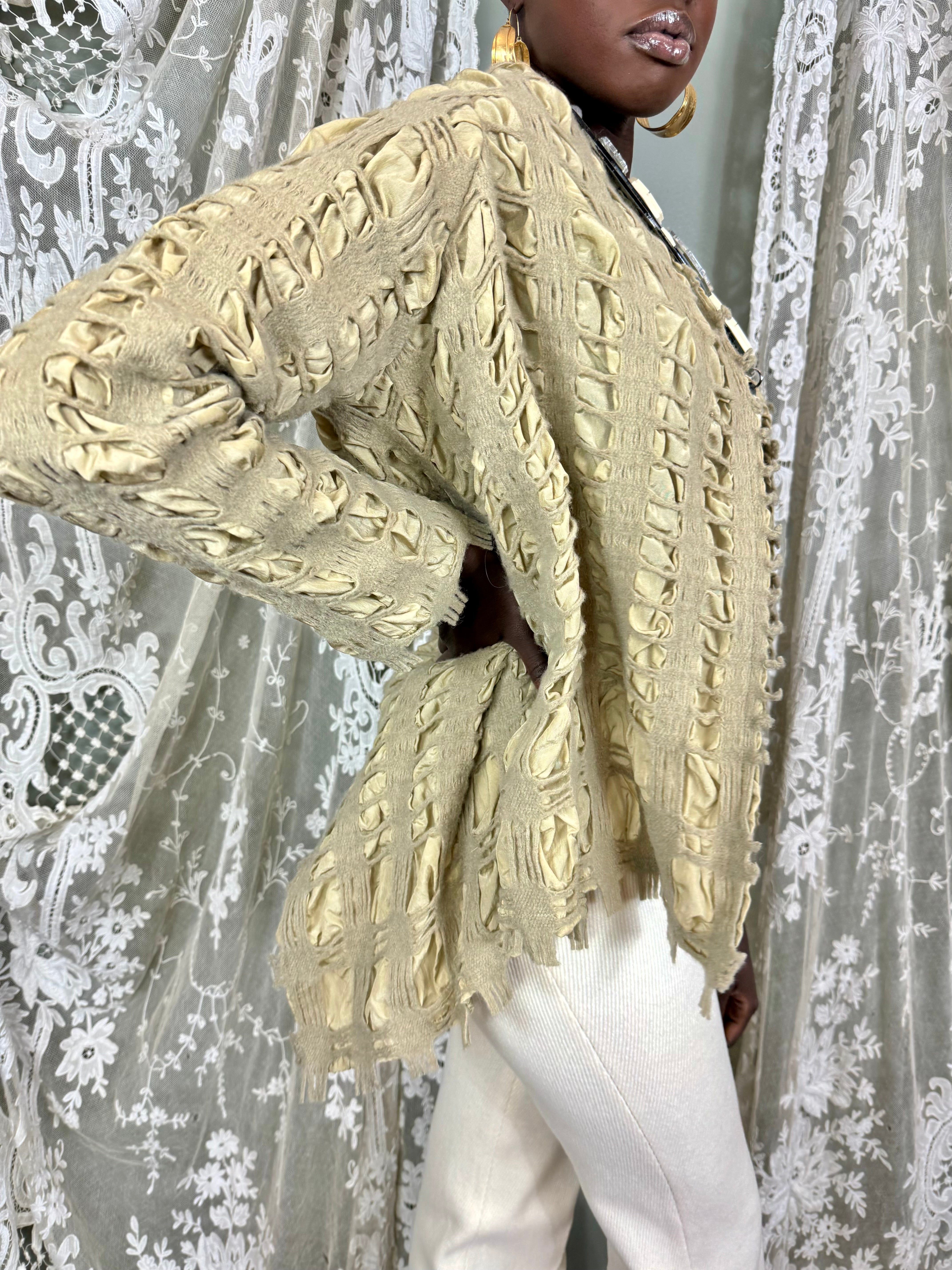 Expertly crafted in Japan, this oat colour jacket showcases a unique cage effect texture using a blend of silk and wool. Its loose fit and long sleeves provide comfort and style, making it a must-have y2k piece. Elevate your wardrobe with this handcrafted jacket.