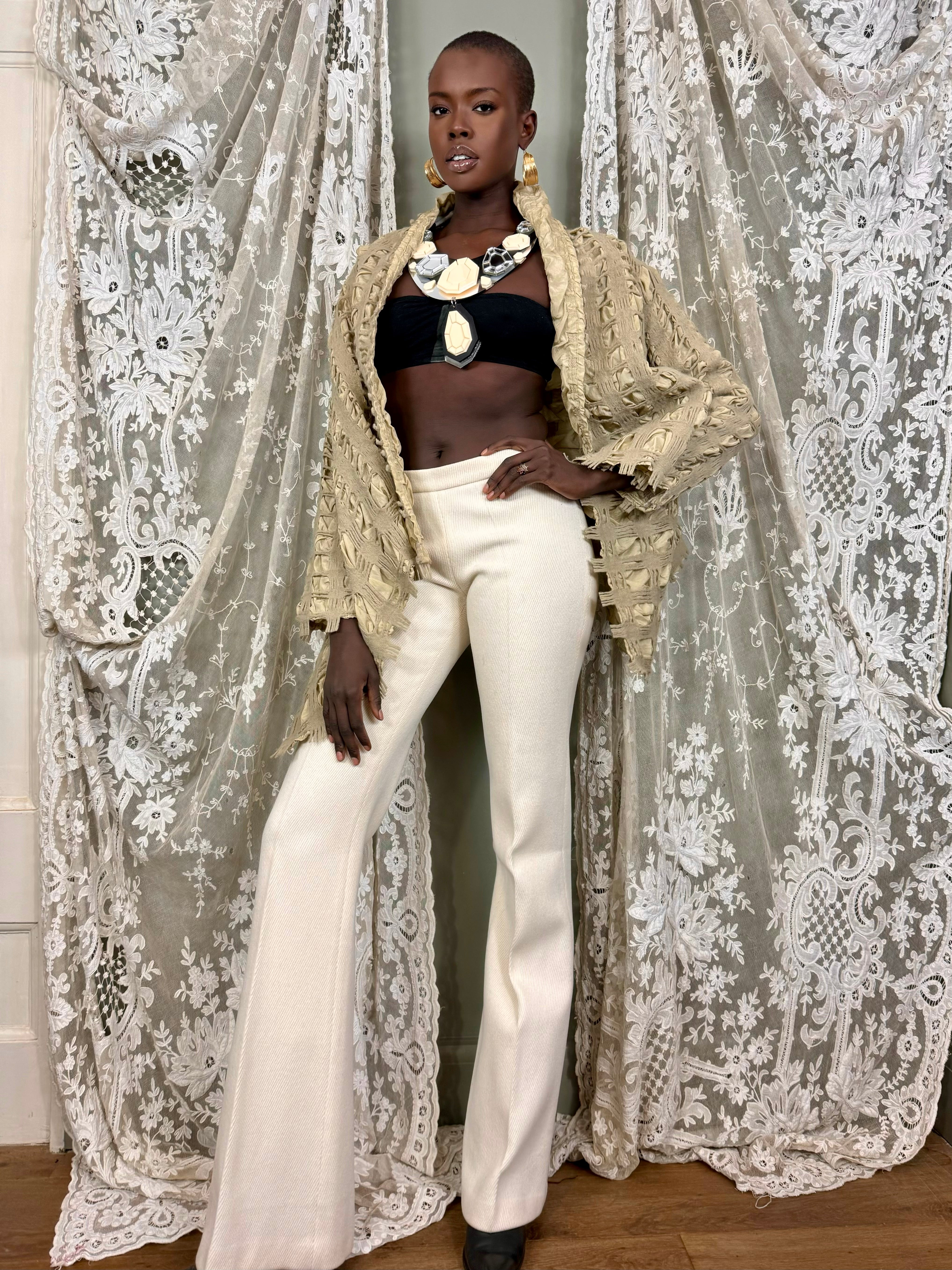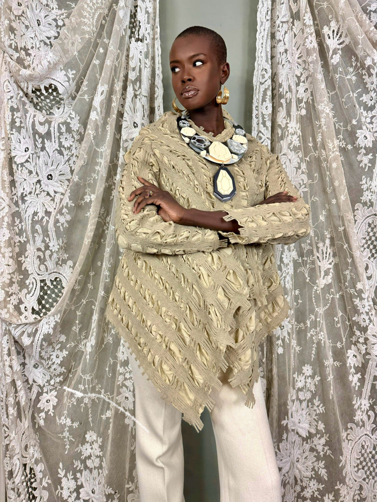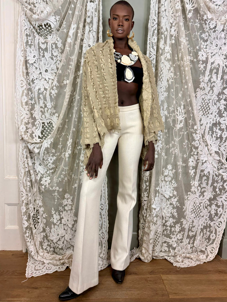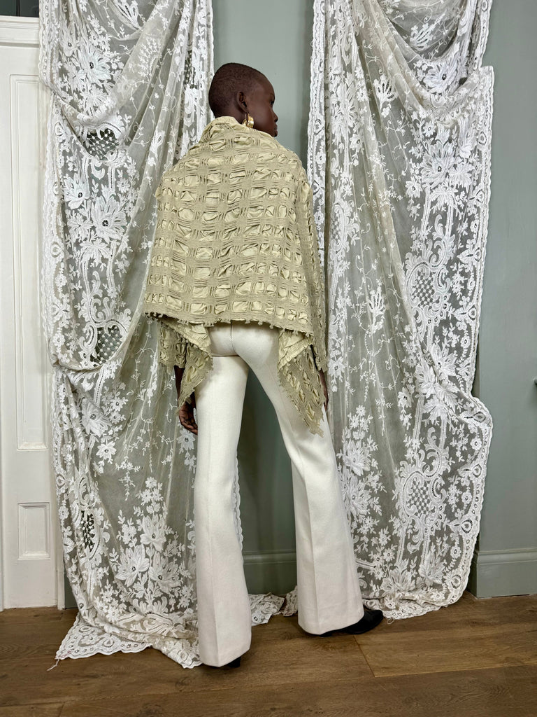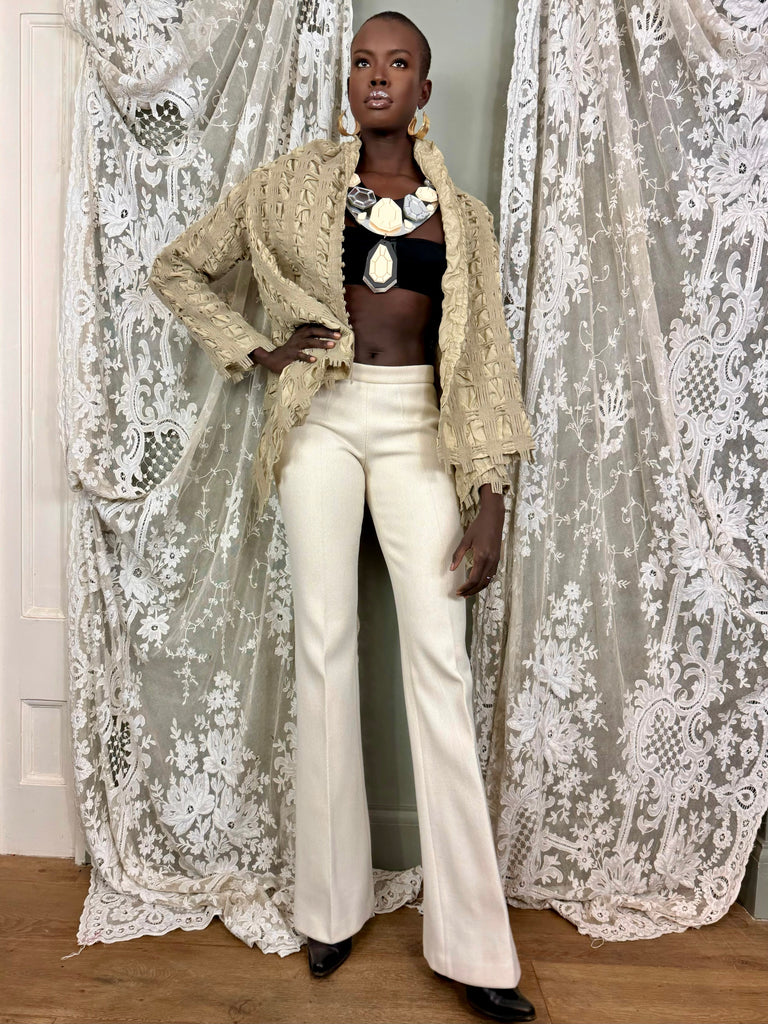 Expertly crafted in Japan, this oat colour jacket showcases a unique cage effect texture using a blend of silk and wool. Its loose fit and long sleeves provide comfort and style, making it a must-have y2k piece. Elevate your wardrobe with this handcrafted jacket.