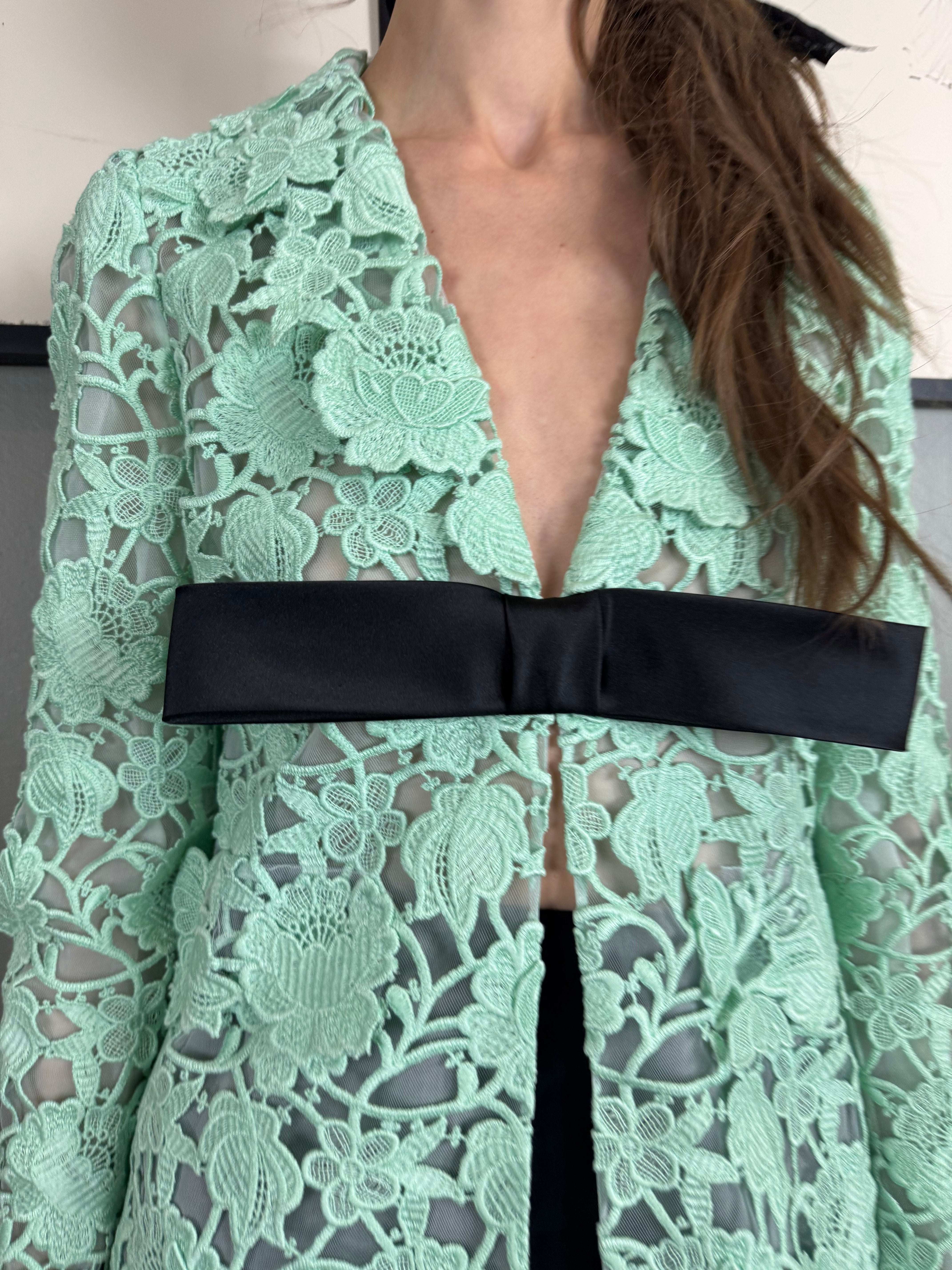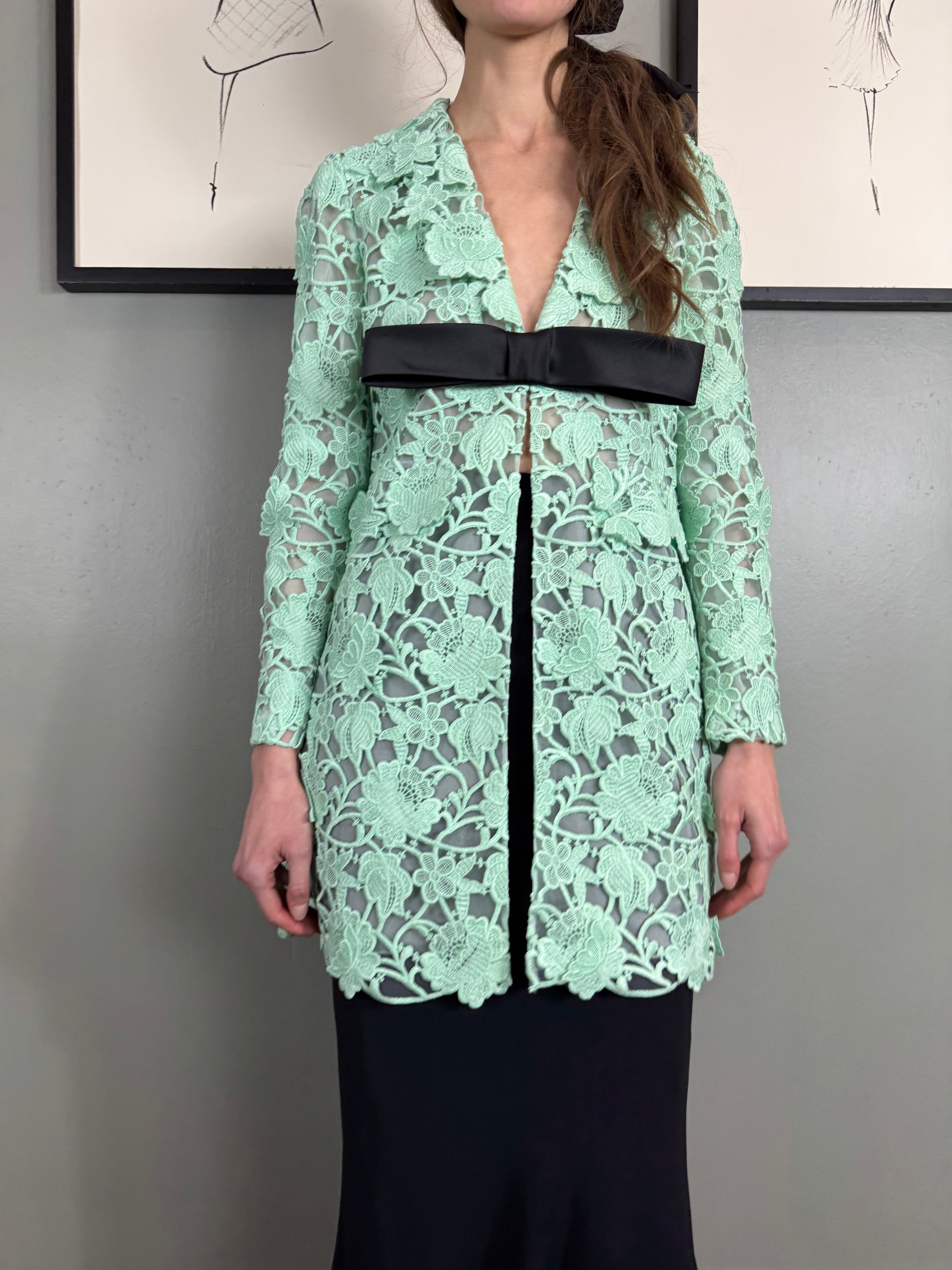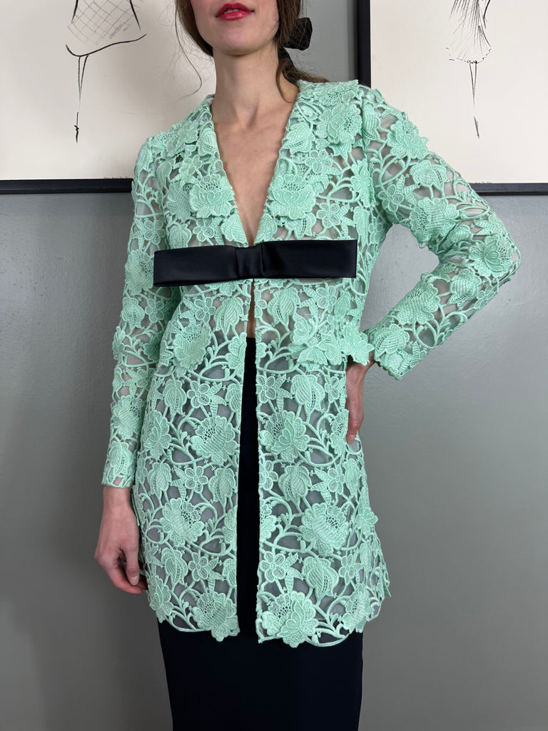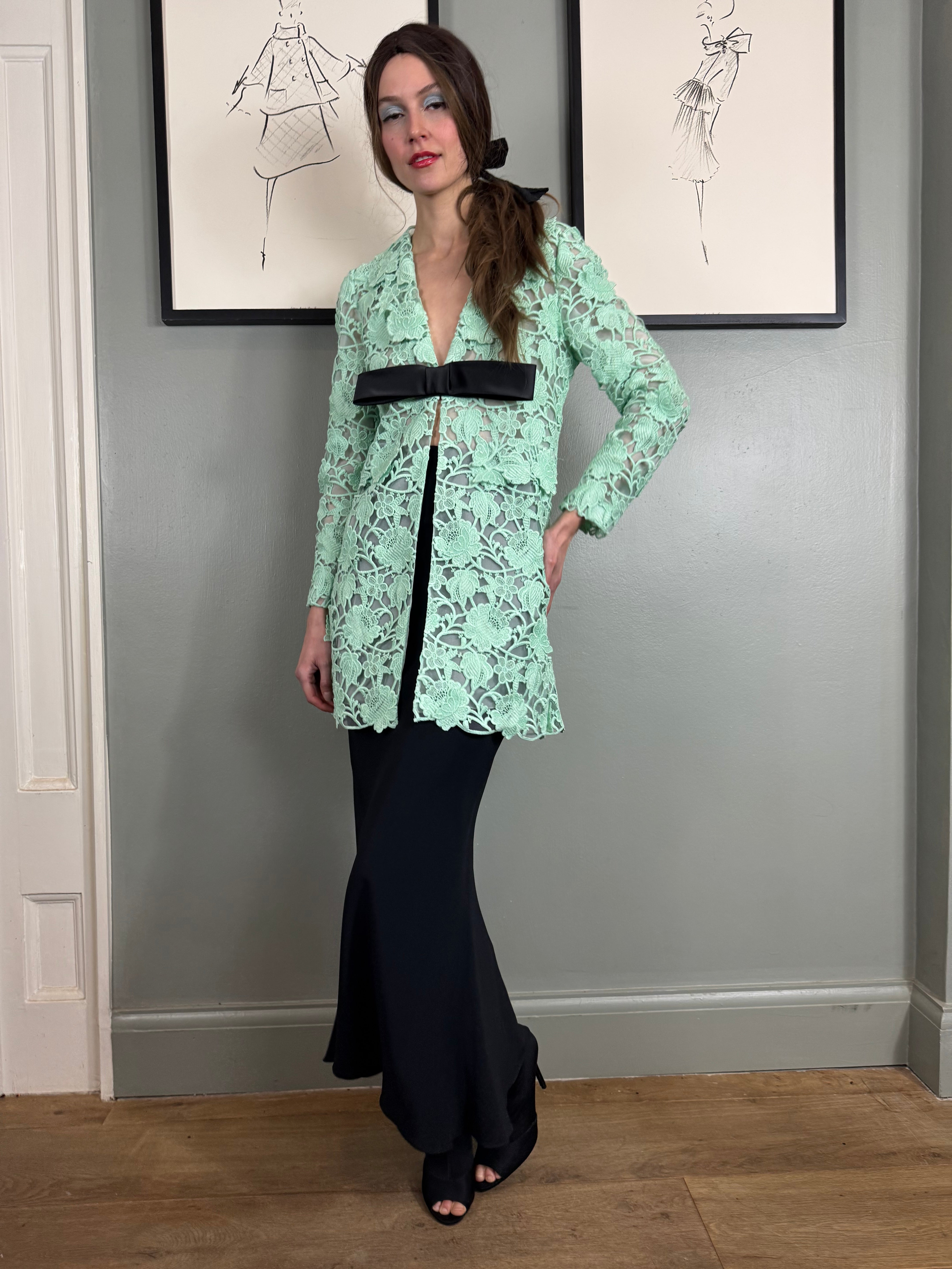 This vibrant Giambattista Valli aqua lace jacket features long sleeves, a strong lapel, and a silk black bow fastened under the bust. The intricate cutouts and bold color make this jacket a statement piece, perfect for any fashion-forward individual. Here paired with a McQueen high waisted bias cut skirt.