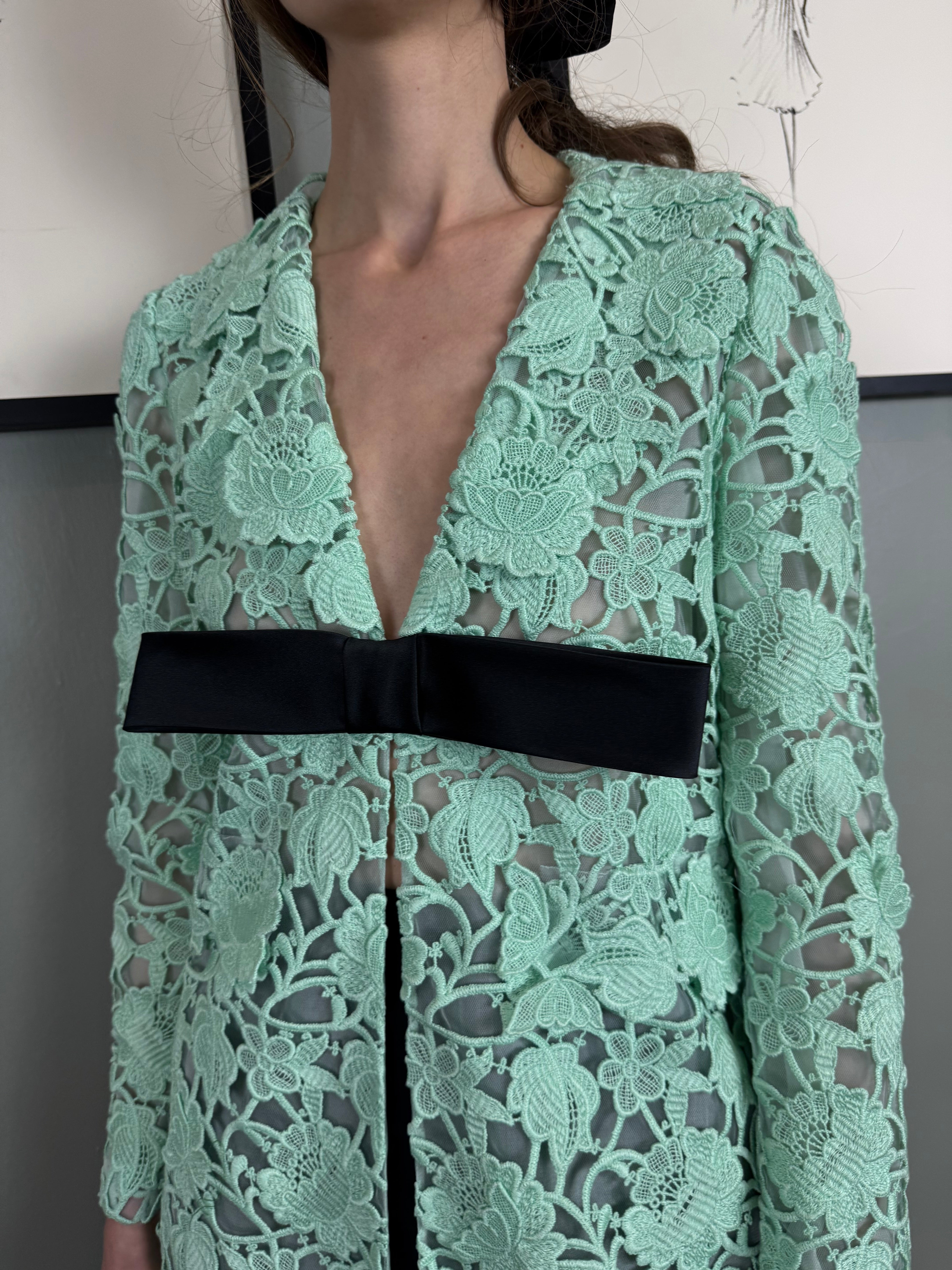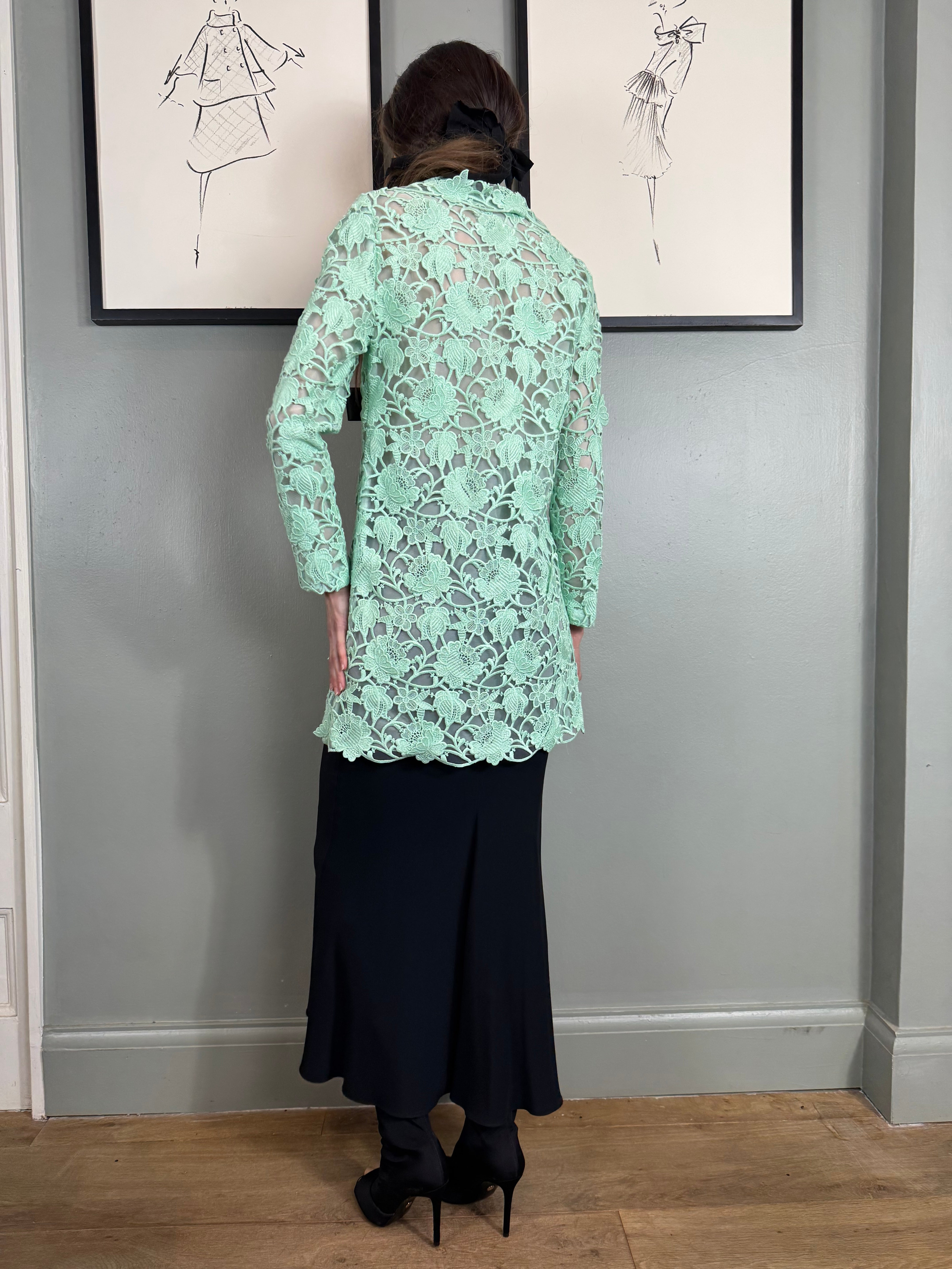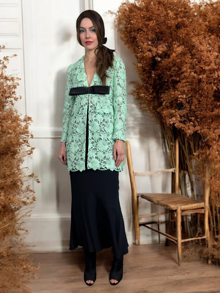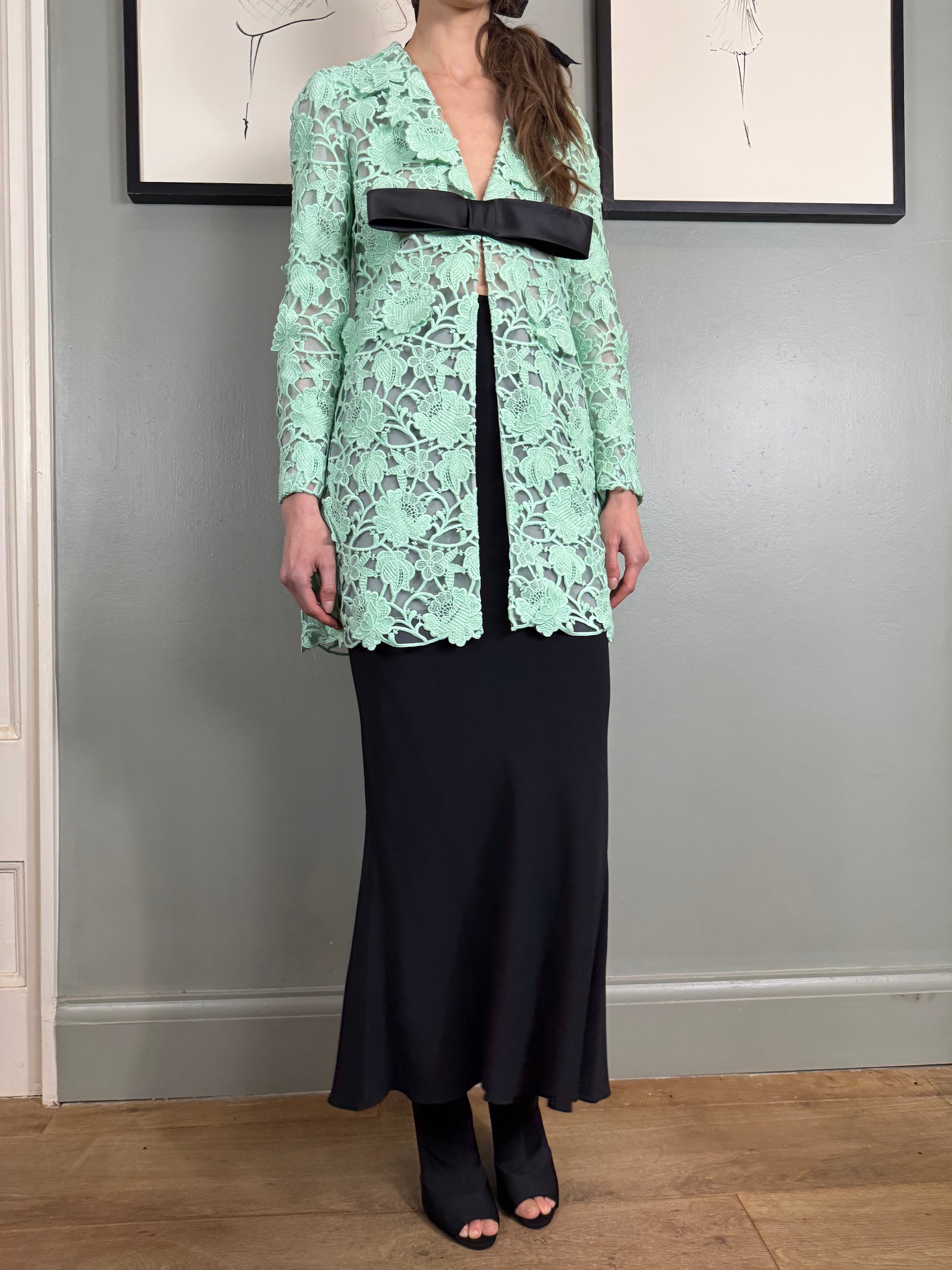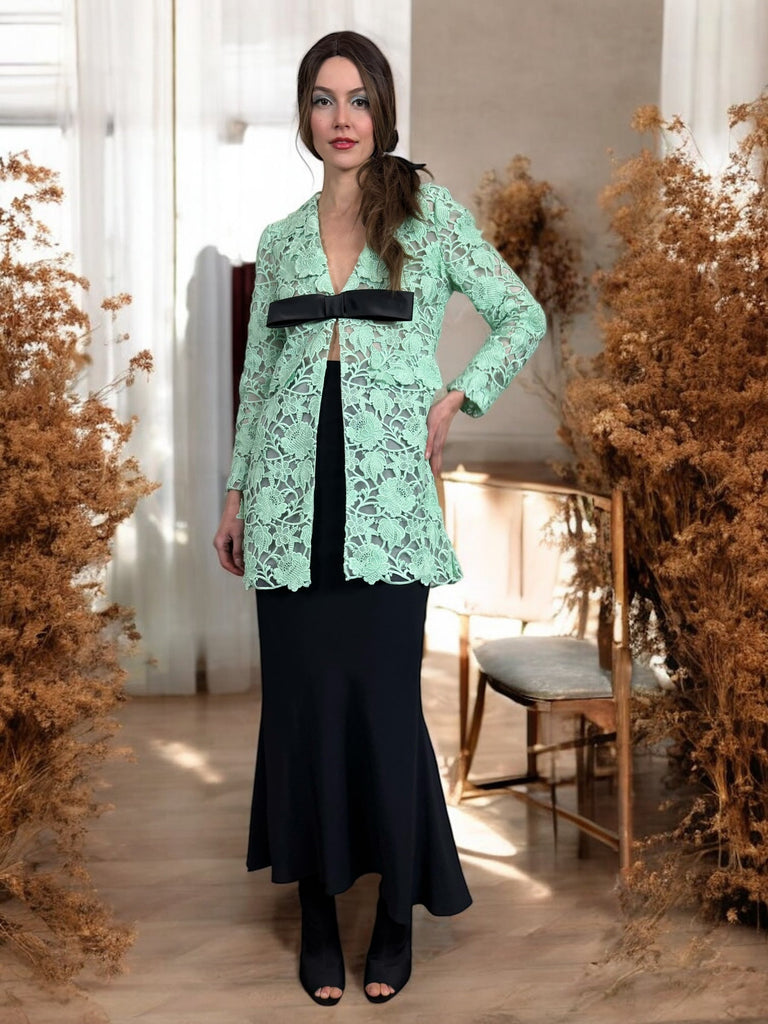 This vibrant Giambattista Valli aqua lace jacket features long sleeves, a strong lapel, and a silk black bow fastened under the bust. The intricate cutouts and bold color make this jacket a statement piece, perfect for any fashion-forward individual. Here paired with a McQueen high waisted bias cut skirt.